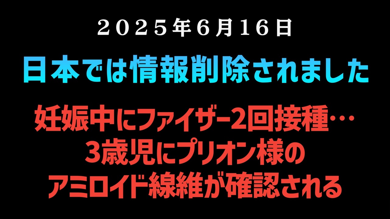 【日本では情報削除されました】◆妊娠中にファイザー2回接種…3歳児にプリオン様のアミロイド線維が確認される<br><br><br>◆ 今回の台本<br><a href="https://keiichiro8140.hatenablog.com/entry/20250609004" target="_blank" rel="noopener nofollow">https://keiichiro8140.hatenablog.com/entry/20250609004</a><br><br><br>◆もしも(BAN)の時のためのマイリンク集<br><a href="https://lit.link/keiichiro8140" target="_blank" rel="noopener nofollow">https://lit.link/keiichiro8140</a><br><br><br>気になったニュース 2025/6/16<br><br><br />著作権、肖像権に配慮して作成しております。<br><br>◆気になったニュースの台本!?<br>メモ代わりに作った台本をそのままあげてます<br><a href="https://keiichiro8140.hatenablog.com/." target="_blank" rel="noopener nofollow">https://keiichiro8140.hatenablog.com/.</a><br><br><br>ここからはシリーズ紹介<br><br><br>◆ ワクチン解毒・デトックス<br><a href="https://x.gd/fZweg" target="_blank" rel="noopener nofollow">https://x.gd/fZweg</a><br><br>◆ウイリアム・マキス博士のがん治療(イベルメクチン・フェンベンダゾール等)<br><a href="https://x.gd/AtFYS" target="_blank" rel="noopener nofollow">https://x.gd/AtFYS</a><br><br>◆予防接種健康被害救済制度<br><a href="https://x.gd/0xK9x" target="_blank" rel="noopener nofollow">https://x.gd/0xK9x</a><br><br>◆気になったニュース #1501~<br><br>◆ 【ショートver】気になったニュース<br><a href="https://x.gd/7MxXC" target="_blank" rel="noopener nofollow">https://x.gd/7MxXC</a><br><br>◆ 気になったニュース #1001~<br><a href="https://x.gd/Lp8gv" target="_blank" rel="noopener nofollow">https://x.gd/Lp8gv</a><br><br>◆ 気になったニュース #501~<br><a href="https://x.gd/EmbS4" target="_blank" rel="noopener nofollow">https://x.gd/EmbS4</a><br><br>◆ 気になったニュース #1~#500<br><a href="https://x.gd/uPhNb" target="_blank" rel="noopener nofollow">https://x.gd/uPhNb</a><br><br>◆ X(旧Twitter)・テレグラムで気になった情報<br><a href="https://x.gd/YG6FT" target="_blank" rel="noopener nofollow">https://x.gd/YG6FT</a><br><br>◆ 日比谷5万人パレードデ⚪生放送アーカイブ動画<br><a href="https://x.gd/3CHJv" target="_blank" rel="noopener nofollow">https://x.gd/3CHJv</a><br><br>◆日比谷5万人パレード⚪モのマイリスト作ってみました<br><a href="https://nico.ms/mylist/76828848?ref=sp_other" target="_blank" rel="noopener nofollow">https://nico.ms/mylist/76828848?ref=sp_other</a><br><br>◆3.30 令和の百姓⚪⚪<br><a href="https://www.nicovideo.jp/series/511791?ref=garage_share_other" target="_blank" rel="noopener nofollow">https://www.nicovideo.jp/series/511791?ref=garage_share_other</a><br><br>◆ 及川幸久さんの【XNEWS】シリーズ<br><a href="https://x.gd/3k78K" target="_blank" rel="noopener nofollow">https://x.gd/3k78K</a><br><br>◆これまでの動画<a href="https://x.gd/sPXoJ" target="_blank" rel="noopener nofollow">https://x.gd/sPXoJ</a><br><br>◆もしも(BAN)の時のためのマイリンク集<a href="https://lit.link/K-16_News44" target="_blank" rel="noopener nofollow">https://lit.link/K-16_News44</a><br><br>
