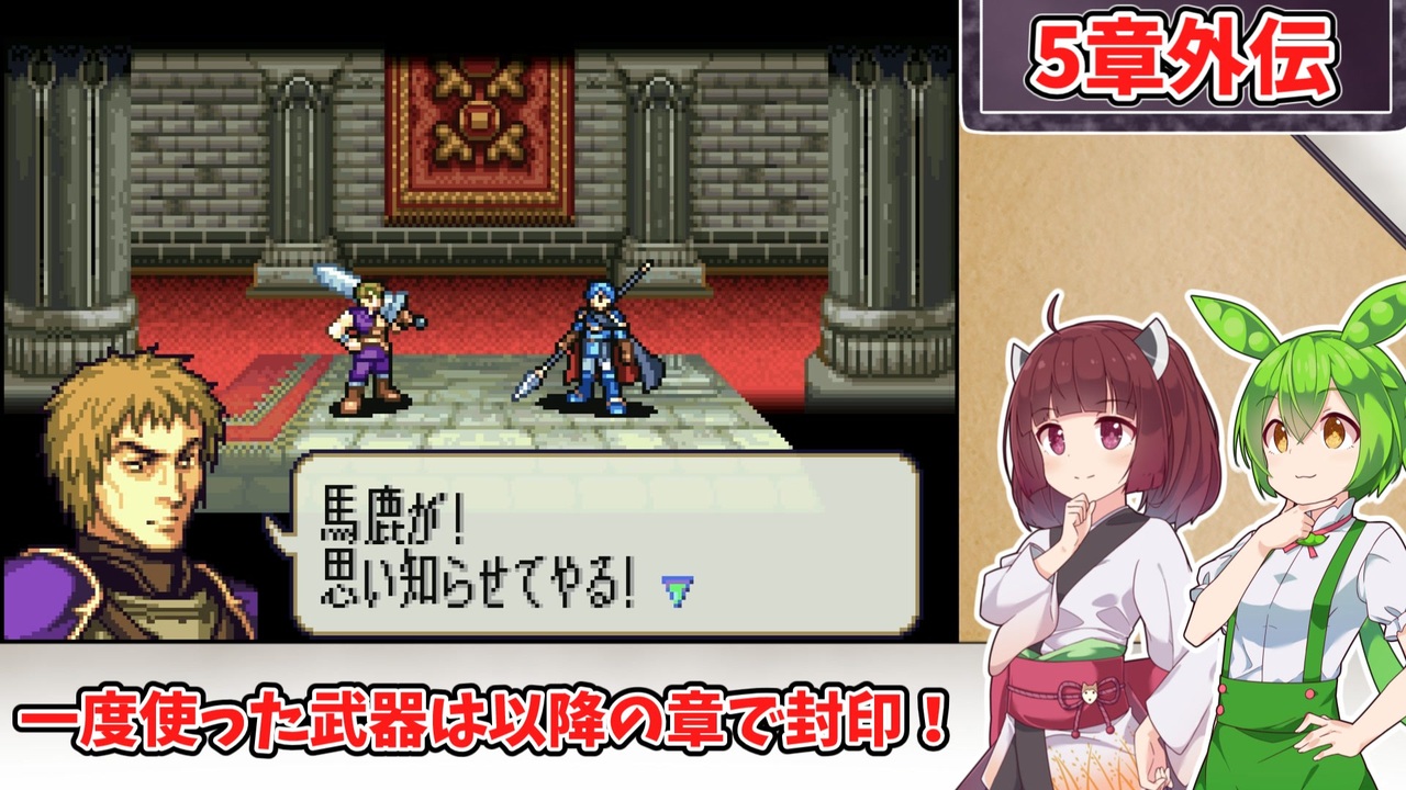 <span style="color: #85200c; font-size: 24px;"><strong><i>こんな相手に喧嘩売ったってマジ!?<br>あまりにも愚か過ぎるでしょグラド帝国…</i></strong></span><br><br><br><span style="font-size: 16px;"><strong>1:一度使用した武器種は、以降の章で使用する事を禁止する。<br>2:武器の使用の定義は『その武器を装備した状態で敵との戦闘が発生したタイミング』<br>または『その武器を売却したタイミング』<br>杖の場合は『対象に対して使用した時点(命中の可否は問わない)』とする。 </strong></span><br><span style="color: #ff0000; font-size: 16px;"><strong>※同盟軍、演出による戦闘イベントでは使用した判定にはならないこととする。</strong></span><span style="font-size: 16px;"><strong> <br>3:仲間候補のユニットを全員加入、生存させた状態でゲームをクリアする。<br>4:上級クラスのユニットは「武器を装備した状態」での戦闘を禁止する。<br>5:バグ技禁止</strong></span><br><br>この動画シリーズ【<a href="https://www.nicovideo.jp/series/516459" target="_blank" rel="noopener">series/516459</a>】<br>『トラ7』の同縛りプレイ【<a href="https://www.nicovideo.jp/series/482976" target="_blank" rel="noopener">series/482976</a>】<br>『烈火』の同縛りプレイ【<a href="https://www.nicovideo.jp/series/406473" target="_blank" rel="noopener">series/406473</a>】<br>『封印』の同縛りプレイ【<a href="https://www.nicovideo.jp/series/316824" target="_blank" rel="noopener">series/316824</a>】<br><br>前:【<a href="https://www.nicovideo.jp/watch/sm45080704" class="watch">sm45080704</a>】次:【<a href="https://www.nicovideo.jp/watch/sm45112805" class="watch">sm45112805</a>】<br><br><strong>使用したソフト</strong><br>VOICEROID+東北きりたんEX<br>VOICEVOX:ずんだもん<br>VOICEPEAK:ずんだもん<br><strong>お借りした素材</strong><br>ニコニコモンズの皆様(コンテンツツリー参照)<br><br><a target="_blank" href="https://qa.nicovideo.jp/faq/show/19424?site_domain=default" style="font-size: 13px;color: #657586; text-decoration: underline; line-height: 1.4">この動画は投稿者によって修正されました</a>