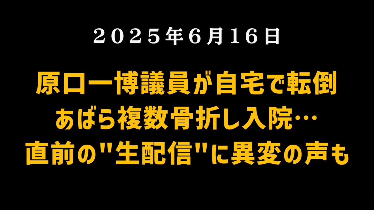 原口一博衆院議員が6月15日夜、自宅で転倒し、あばら骨を複数本骨折して入院。転倒の数時間前には、生配信で「日本人大量死」や「接種者1800万人のデータ公開」に踏み込んだ発言をしており、視聴者からは「異常な眠気を訴えるような様子だった」「何かがおかしかった」との声も。<br>今、原口議員に何が起きていたのか。そして、彼が命をかけて伝えようとしていた内容とは──。<br><br>記事:<a href="https://x.gd/0FCj0" target="_blank" rel="noopener nofollow">https://x.gd/0FCj0</a><br>X(旧Twitter):<a href="https://x.gd/Ooqsx" target="_blank" rel="noopener nofollow">https://x.gd/Ooqsx</a><br>YouTube:<a href="https://x.gd/6Hz06" target="_blank" rel="noopener nofollow">https://x.gd/6Hz06</a><br><br><br>◆ 今回の台本<br><a href="https://keiichiro8140.hatenablog.com/entry/20250616999" target="_blank" rel="noopener nofollow">https://keiichiro8140.hatenablog.com/entry/20250616999</a><br><br><br>◆もしも(BAN)の時のためのマイリンク集<br><a href="https://lit.link/keiichiro8140" target="_blank" rel="noopener nofollow">https://lit.link/keiichiro8140</a><br><br><br>気になったニュース 2025/6/16<br><br><br />著作権、肖像権に配慮して作成しております。<br><br>◆気になったニュースの台本!?<br>メモ代わりに作った台本をそのままあげてます<br><a href="https://keiichiro8140.hatenablog.com/." target="_blank" rel="noopener nofollow">https://keiichiro8140.hatenablog.com/.</a><br><br><br>ここからはシリーズ紹介<br><br><br>◆ ワクチン解毒・デトックス<br><a href="https://x.gd/fZweg" target="_blank" rel="noopener nofollow">https://x.gd/fZweg</a><br><br>◆ウイリアム・マキス博士のがん治療(イベルメクチン・フェンベンダゾール等)<br><a href="https://x.gd/AtFYS" target="_blank" rel="noopener nofollow">https://x.gd/AtFYS</a><br><br>◆予防接種健康被害救済制度<br><a href="https://x.gd/0xK9x" target="_blank" rel="noopener nofollow">https://x.gd/0xK9x</a><br><br>◆気になったニュース #1501~<br><br>◆ 【ショートver】気になったニュース<br><a href="https://x.gd/7MxXC" target="_blank" rel="noopener nofollow">https://x.gd/7MxXC</a><br><br>◆ 気になったニュース #1001~<br><a href="https://x.gd/Lp8gv" target="_blank" rel="noopener nofollow">https://x.gd/Lp8gv</a><br><br>◆ 気になったニュース #501~<br><a href="https://x.gd/EmbS4" target="_blank" rel="noopener nofollow">https://x.gd/EmbS4</a><br><br>◆ 気になったニュース #1~#500<br><a href="https://x.gd/uPhNb" target="_blank" rel="noopener nofollow">https://x.gd/uPhNb</a><br><br>◆ X(旧Twitter)・テレグラムで気になった情報<br><a href="https://x.gd/YG6FT" target="_blank" rel="noopener nofollow">https://x.gd/YG6FT</a><br><br>◆ 日比谷5万人パレードデ⚪生放送アーカイブ動画<br><a href="https://x.gd/3CHJv" target="_blank" rel="noopener nofollow">https://x.gd/3CHJv</a><br><br>◆日比谷5万人パレード⚪モのマイリスト作ってみました<br><a href="https://nico.ms/mylist/76828848?ref=sp_other" target="_blank" rel="noopener nofollow">https://nico.ms/mylist/76828848?ref=sp_other</a><br><br>◆3.30 令和の百姓⚪⚪<br><a href="https://www.nicovideo.jp/series/511791?ref=garage_share_other" target="_blank" rel="noopener nofollow">https://www.nicovideo.jp/series/511791?ref=garage_share_other</a><br><br>◆ 及川幸久さんの【XNEWS】シリーズ<br><a href="https://x.gd/3k78K" target="_blank" rel="noopener nofollow">https://x.gd/3k78K</a><br><br>◆これまでの動画<a href="https://x.gd/sPXoJ" target="_blank" rel="noopener nofollow">https://x.gd/sPXoJ</a><br><br>◆もしも(BAN)の時のためのマイリンク集<a href="https://lit.link/K-16_News44" target="_blank" rel="noopener nofollow">https://lit.link/K-16_News44</a><br><br>