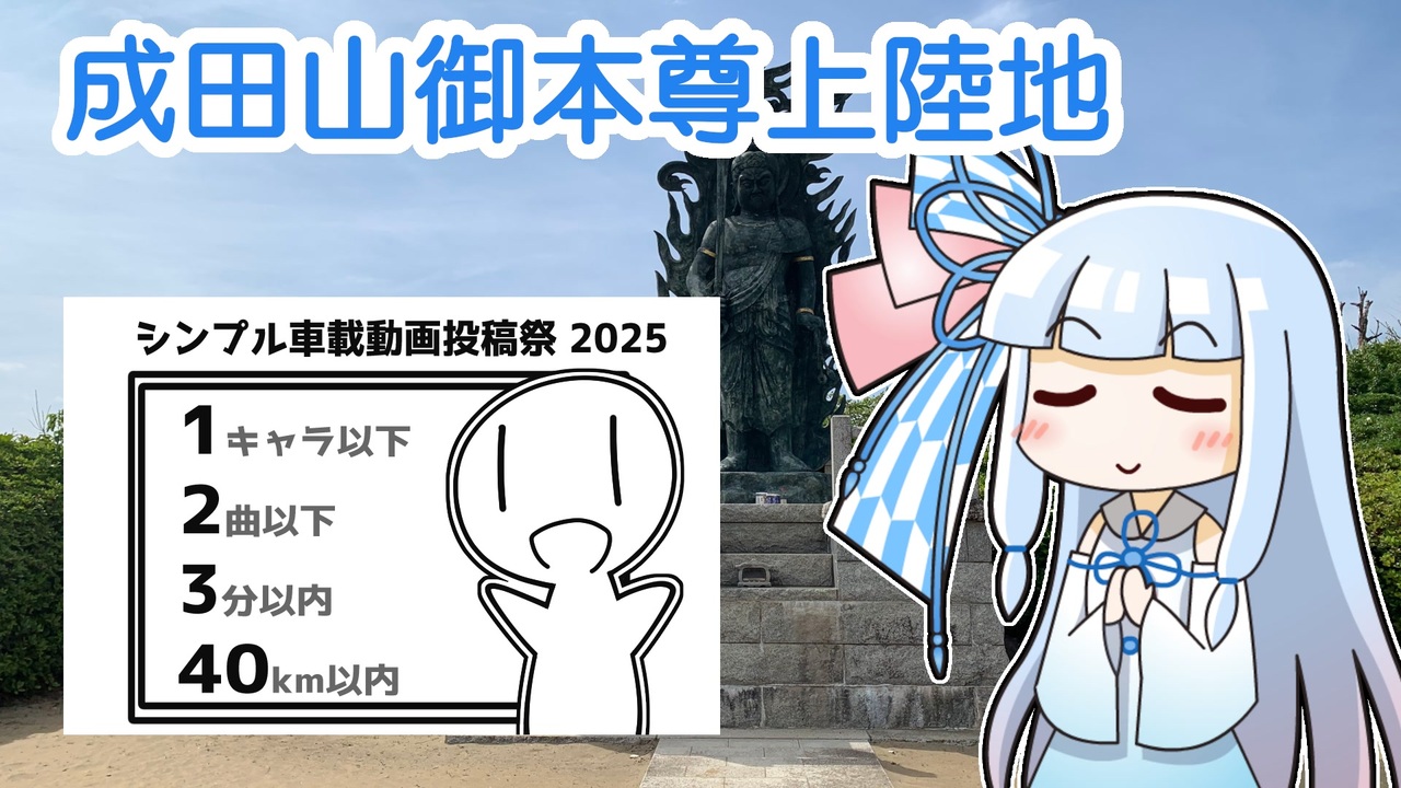 全国トップクラスに初詣客の訪れる成田山新勝寺。<br>そんな成田山新勝寺にゆかりのある地を訪ねました。<br><br><br>そーき(爪楊枝P) さま主催の<br>シンプル車載動画投稿祭2025の告知動画 → <a href="https://www.nicovideo.jp/watch/sm44980059" class="watch">sm44980059</a><br><br><br>訪問地の情報:<br><br>海の駅九十九里 <a href="https://uminoeki99.com/" target="_blank" rel="noopener nofollow">https://uminoeki99.com/</a><br>〒283-0102 千葉県山武郡九十九里町小関2347-98<br><a href="https://maps.app.goo.gl/HMP94khEh9kgcqDb7" target="_blank" rel="noopener nofollow">https://maps.app.goo.gl/HMP94khEh9kgcqDb7</a><br><br>成田山御本尊上陸地 <a href="https://www.yokoshibahikari.jp/town/narita.htm" target="_blank" rel="noopener nofollow">https://www.yokoshibahikari.jp/town/narita.htm</a><br>〒289-1725 千葉県山武郡横芝光町尾垂3504<br><a href="https://maps.app.goo.gl/RUJufjkdhFrkEkF1A" target="_blank" rel="noopener nofollow">https://maps.app.goo.gl/RUJufjkdhFrkEkF1A</a><br>