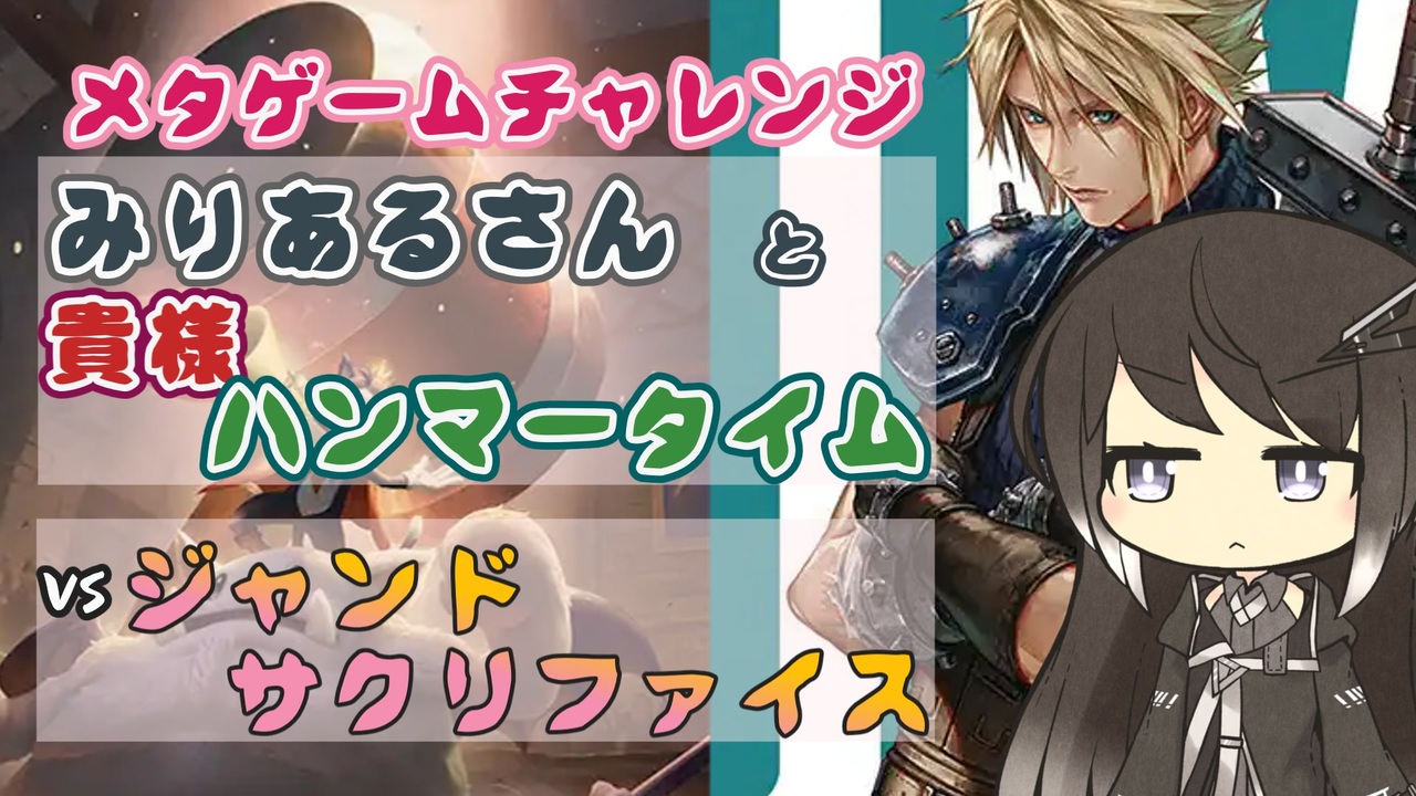 クラウド、装備もってこい。<br><br>FF採用型ハンマータイムを使ったメタゲームチャレンジの試合です。<br>vs ジャンドサクリファイス<br>オープニング<br><a href="#" class="seekTime" data-seekTime="0:00" onclick="seekNicoPlayer('#0:00'); return false;">#0:00</a><br>対戦(vs ジャンドサクリファイス)<br><a href="#" class="seekTime" data-seekTime="04:31" onclick="seekNicoPlayer('#04:31'); return false;">#04:31</a><br>エンディング<br><a href="#" class="seekTime" data-seekTime="16:49" onclick="seekNicoPlayer('#16:49'); return false;">#16:49</a><br><br>番外編<br><a href="https://www.nicovideo.jp/watch/sm45081398" target="_blank" rel="noopener nofollow">https://www.nicovideo.jp/watch/sm45081398</a><br><br>■使用楽曲<br>Tangled Jungle Trick(Ys VIII Lacrimosa of DANA Original Soundtrack) <br>AtoZ(Ys VIII Lacrimosa of DANA Original Soundtrack)<br>Hope Alive(Ys VIII Lacrimosa of DANA Original Soundtrack)<br><br>■デッキリスト<br><a href="https://www.hareruyamtg.com/decks/1029760" target="_blank" rel="noopener nofollow">https://www.hareruyamtg.com/decks/1029760</a><br /><使用させていただいた音声><br>※シリーズ共通※<br>ミリアル<br>アリアル<br>Voice by <a href="https://CoeFont.cloud" target="_blank" rel="noopener nofollow">https://CoeFont.cloud</a><br>ずんだもん<br>四国めたん<br>A.I.VOICE2 紲星 あかり<br>A.I.VOICE2 結月 ゆかり<br><使用させていただいた立ち絵><br>akihiyo様<br><a href="https://seiga.nicovideo.jp/seiga/im10777621" target="_blank" rel="noopener nofollow">https://seiga.nicovideo.jp/seiga/im10777621</a><br>濃口kiki様<br><a href="https://seiga.nicovideo.jp/seiga/im8102728" target="_blank" rel="noopener nofollow">https://seiga.nicovideo.jp/seiga/im8102728</a><br>やっぺん様<br><a href="https://seiga.nicovideo.jp/seiga/im10658027" target="_blank" rel="noopener nofollow">https://seiga.nicovideo.jp/seiga/im10658027</a><br><a href="https://seiga.nicovideo.jp/seiga/im10898210" target="_blank" rel="noopener nofollow">https://seiga.nicovideo.jp/seiga/im10898210</a><br>春次郎様<br><a href="https://seiga.nicovideo.jp/seiga/im11492553" target="_blank" rel="noopener nofollow">https://seiga.nicovideo.jp/seiga/im11492553</a><br><使用させていただいた素材><br>ツリーをご覧ください<br><Twitter><br><a href="https://twitter.com/rei_zeru" target="_blank" rel="noopener nofollow">https://twitter.com/rei_zeru</a><br><MtG動画まとめ><br><a href="https://www.nicovideo.jp/my/mylist/73867290" target="_blank" rel="noopener nofollow">https://www.nicovideo.jp/my/mylist/73867290</a><br><note記事><br><a href="https://note.com/reizeru" target="_blank" rel="noopener nofollow">https://note.com/reizeru</a><br><br><br>本動画はファンコンテンツ・ポリシーに沿った非公式のファンコンテンツです。ウィザーズ社の認可/許諾は得ていません。題材の一部に、ウィザーズ・オブ・ザ・コースト社の財産を含んでいます。©Wizards of the Coast LLC.
