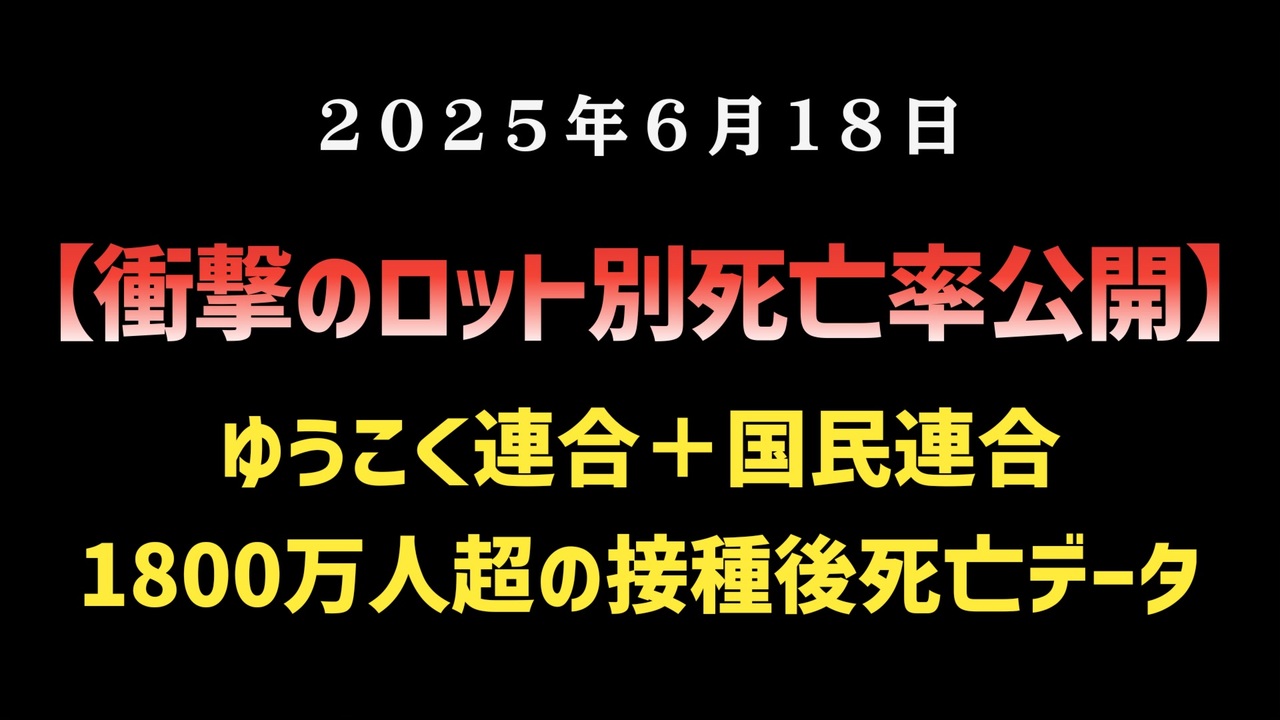 「市民がついに開示した“死の統計”」──1800万件以上のワクチン接種後の死亡データが、ロットごとに分類された形で一般公開されました。ロットごとに極端に異なる死亡率、接種から死亡までの日数、そして視覚的に異常値が示されるグラフ。この映像では、メディアが報じないリアルな数字と、そこに浮かび上がる重大な疑問を明快に伝えます。知らなかったでは済まされない現実が、今あなたの前に。<br><br>URL<br>①例のデータベース<br><a href="https://t.co/xmIn5034r2" target="_blank" rel="noopener nofollow">https://t.co/xmIn5034r2</a><br>②X(旧Twitter)<br><a href="https://t.co/mJ1ekuvD3u" target="_blank" rel="noopener nofollow">https://t.co/mJ1ekuvD3u</a><br>③国民連合<br><a href="https://twitter.com/i/communities/1772466796127526914?t=rGrFjWpk3Wsf107g3aGNew&s=09" target="_blank" rel="noopener nofollow">https://twitter.com/i/communities/1772466796127526914?t=rGrFjWpk3Wsf107g3aGNew&s=09</a><br><br><br>◆ 今回の台本<br><a href="https://keiichiro8140.hatenablog.com/entry/20250618666" target="_blank" rel="noopener nofollow">https://keiichiro8140.hatenablog.com/entry/20250618666</a><br><br><br>◆もしも(BAN)の時のためのマイリンク集<br><a href="https://lit.link/keiichiro8140" target="_blank" rel="noopener nofollow">https://lit.link/keiichiro8140</a><br><br><br>気になったニュース 2025/6/18<br><br><br />著作権、肖像権に配慮して作成しております。<br><br>◆気になったニュースの台本!?<br>メモ代わりに作った台本をそのままあげてます<br><a href="https://keiichiro8140.hatenablog.com/." target="_blank" rel="noopener nofollow">https://keiichiro8140.hatenablog.com/.</a><br><br><br>ここからはシリーズ紹介<br><br><br>◆ ワクチン解毒・デトックス<br><a href="https://x.gd/fZweg" target="_blank" rel="noopener nofollow">https://x.gd/fZweg</a><br><br>◆ウイリアム・マキス博士のがん治療(イベルメクチン・フェンベンダゾール等)<br><a href="https://x.gd/AtFYS" target="_blank" rel="noopener nofollow">https://x.gd/AtFYS</a><br><br>◆予防接種健康被害救済制度<br><a href="https://x.gd/0xK9x" target="_blank" rel="noopener nofollow">https://x.gd/0xK9x</a><br><br>◆気になったニュース #1501~<br><br>◆ 【ショートver】気になったニュース<br><a href="https://x.gd/7MxXC" target="_blank" rel="noopener nofollow">https://x.gd/7MxXC</a><br><br>◆ 気になったニュース #1001~<br><a href="https://x.gd/Lp8gv" target="_blank" rel="noopener nofollow">https://x.gd/Lp8gv</a><br><br>◆ 気になったニュース #501~<br><a href="https://x.gd/EmbS4" target="_blank" rel="noopener nofollow">https://x.gd/EmbS4</a><br><br>◆ 気になったニュース #1~#500<br><a href="https://x.gd/uPhNb" target="_blank" rel="noopener nofollow">https://x.gd/uPhNb</a><br><br>◆ X(旧Twitter)・テレグラムで気になった情報<br><a href="https://x.gd/YG6FT" target="_blank" rel="noopener nofollow">https://x.gd/YG6FT</a><br><br>◆ 日比谷5万人パレードデ⚪生放送アーカイブ動画<br><a href="https://x.gd/3CHJv" target="_blank" rel="noopener nofollow">https://x.gd/3CHJv</a><br><br>◆日比谷5万人パレード⚪モのマイリスト作ってみました<br><a href="https://nico.ms/mylist/76828848?ref=sp_other" target="_blank" rel="noopener nofollow">https://nico.ms/mylist/76828848?ref=sp_other</a><br><br>◆3.30 令和の百姓⚪⚪<br><a href="https://www.nicovideo.jp/series/511791?ref=garage_share_other" target="_blank" rel="noopener nofollow">https://www.nicovideo.jp/series/511791?ref=garage_share_other</a><br><br>◆ 及川幸久さんの【XNEWS】シリーズ<br><a href="https://x.gd/3k78K" target="_blank" rel="noopener nofollow">https://x.gd/3k78K</a><br><br>◆これまでの動画<a href="https://x.gd/sPXoJ" target="_blank" rel="noopener nofollow">https://x.gd/sPXoJ</a><br><br>◆もしも(BAN)の時のためのマイリンク集<a href="https://lit.link/K-16_News44" target="_blank" rel="noopener nofollow">https://lit.link/K-16_News44</a><br><br>
