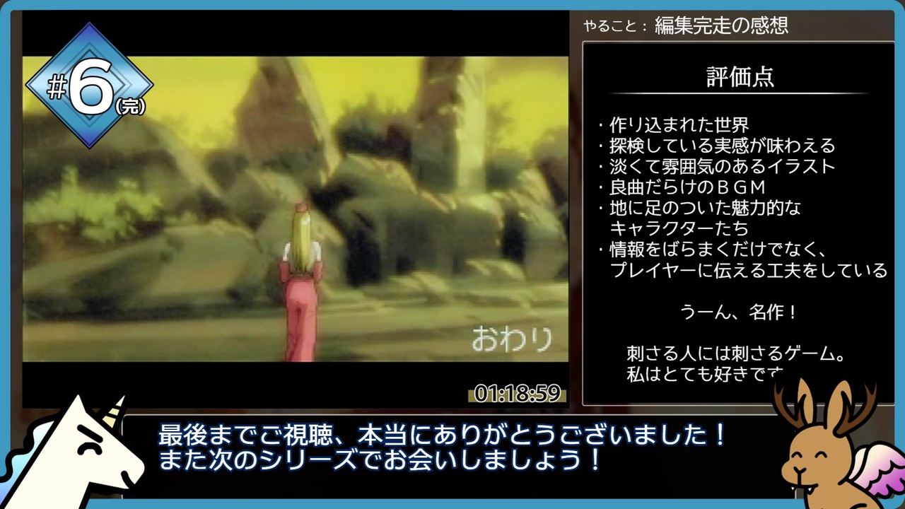 プレイステーション1ソフト『オアシスロード』RTA、解説付きのパート6です。<br><br>初めてですよ…。40分を越える動画を作ったのは…。<br>分割するか悩みましたが、話の流れが切れてしまうためそのまま投稿しました。<br>最後までご視聴、ありがとうございました!<br><br>part.5→<a href="https://www.nicovideo.jp/watch/sm44968524" class="watch">sm44968524</a><br>次作【機動戦士ガンダムSEED DESTINY 連合vs.Z.A.F.T.II PLUS<br> Aルート3周】→<a href="https://www.nicovideo.jp/watch/sm45159168" class="watch">sm45159168</a>。進捗はTwitter(現:X)@Nagisa381rtaで<br><br>走ったRTAのpart.1まとめ→<a href="https://www.nicovideo.jp/mylist/73222388" target="_blank" rel="noopener">mylist/73222388</a><br>RTA全部まとめ→<a href="https://www.nicovideo.jp/mylist/72786007" target="_blank" rel="noopener">mylist/72786007</a><br><br>無編集版→<a href="https://www.nicovideo.jp/watch/sm44667204" class="watch">sm44667204</a><br><br>▽レギュレーション<br>タイマー開始:同行パーティを選択した瞬間<br>タイマー終了:ラスボスを倒し『勝利しました』の文字が表示されきった瞬間<br><br>▽プレイ環境<br>PlayStation2 SCPH-50000実機<br>HDMI出力:Pound Tchnology HD Link Cable for PS2&PS1<br>キャプチャーボード:AVerMedia LIVE GAMER EXTREME 3<br>録画ソフト:OBS Studio<br><br>〇Twitter(現:X)→@Nagisa381rta<br><br>〇今までの調査結果や攻略法をまとめた個人wikiを作りました<br>→<a href="https://w.atwiki.jp/nagisa381rta/" target="_blank" rel="noopener nofollow">https://w.atwiki.jp/nagisa381rta/</a>