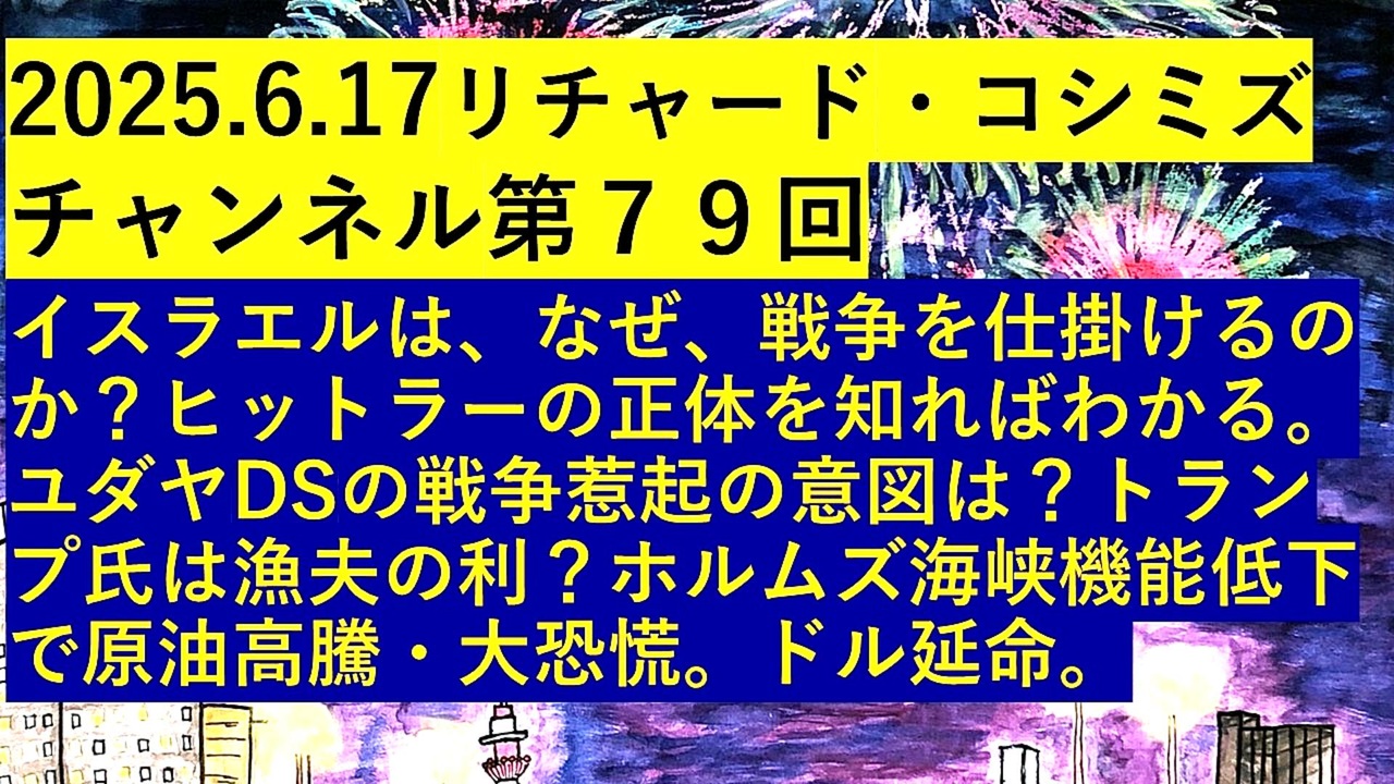 <span style="color: #cc0000;"><strong>◐『「 リチャード・コシミズ・チャンネル 」⦅ 第79回放送 ⦆⦅ 暫定版 ⦆』</strong></span><br><br><span style="color: #ff0000;"><strong> 「『 イスラエル 』は、なぜ、『 戦争 』を『 仕掛ける 』のか?『 アドルフ・ヒットラー 』の『 正体 』を『 知ればわかる 』。『 ユダヤ DEEP STATE 』の<br> 『 戦争惹起 』の『 意図 』は?『 ドナルド・トランプ氏 』は『 漁夫の利 』?『 ホルムズ海峡機能低下 』で『 原油高騰 』・『 大恐慌 』。『 ドル延命 』」</strong></span><br><br> <span style="color: #38761d;"><strong>◐『 リチャード・コシミズ・チャンネル⦅ ニコニコ チャンネル ⦆』</strong></span><br> <span style="color: #0000ff;"><strong><a href="https://ch.nicovideo.jp/richardkoshimizu" target="_blank" rel="noopener nofollow">https://ch.nicovideo.jp/richardkoshimizu</a></strong></span><br><br> <span style="color: #38761d;"><strong>◐『 リチャード・コシミズ「 ニコニコ生放送⦅ LIVE ⦆」』</strong></span><br> <span style="color: #0000ff;"><strong><a href="https://www.nicovideo.jp/user/120930363/live_programs" target="_blank" rel="noopener nofollow">https://www.nicovideo.jp/user/120930363/live_programs</a></strong></span><br><br> <span style="color: #38761d;"><strong>◐『「 リチャード・コシミズ 講演会 」公式「 動画ギャラリー 」</strong></span><span style="color: #ff0000;"><strong>⦅ 最新動画 ⦆⦅ YouTube版 ⦆</strong></span><span style="color: #38761d;"><strong>』</strong></span><br> <span style="color: #0000ff;"><strong><a href="https://www.youtube.com/@richardkoshimizu-video-gallery" target="_blank" rel="noopener nofollow">https://www.youtube.com/@richardkoshimizu-video-gallery</a></strong></span><br><br>