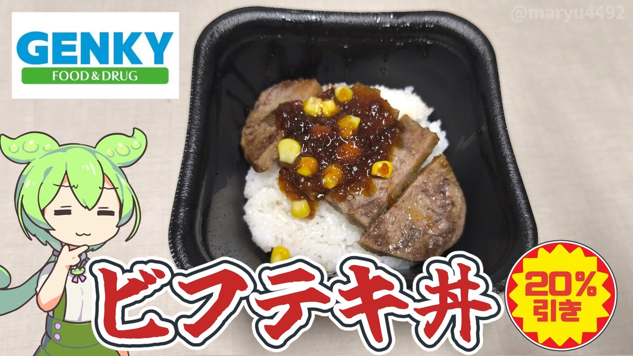 東海・北陸地方にあるドラッグストア「ゲンキー」で<br>面白そうな商品をみつけました。<br>定価349円が20%引きされ280円、どんな味がするのでしょうか。<br><br><br>【関連動画】<br>トップバリュの赤いヤツ「タスマニアビーフ使用サイコロステーキ(冷凍)」2023.05.17<br><a href="https://www.nicovideo.jp/watch/sm42224685" target="_blank" rel="noopener nofollow">https://www.nicovideo.jp/watch/sm42224685</a><br><br>【参考】<br>ゲンキー株式会社<br><a href="http://genky.co.jp/" target="_blank" rel="noopener nofollow">http://genky.co.jp/</a><br>エブピコ DLV角丼(容器スタイル)<br><a href="https://www.packstyle.jp/category/101005003/00670889.html" target="_blank" rel="noopener nofollow">https://www.packstyle.jp/category/101005003/00670889.html</a><br>ステーキとビフテキの違いについて(BILLY THE KID)<br><a href="https://billy-the-kid.co.jp/column/detail/23063001455027/" target="_blank" rel="noopener nofollow">https://billy-the-kid.co.jp/column/detail/23063001455027/</a><br>ステーキとビフテキの違いは⁉<br>【西条の有名飲食店・店長が論じます⑬】(東広島デジタル)<br><a href="https://www.higashihiroshima-digital.com/gourmet-210324-stake/" target="_blank" rel="noopener nofollow">https://www.higashihiroshima-digital.com/gourmet-210324-stake/</a><br><br>【使用した素材】(※敬称略) <br>(合成音声)VOICEVOX/ずんだもん/四国めたん<br><a href="https://voicevox.hiroshiba.jp/" target="_blank" rel="noopener nofollow">https://voicevox.hiroshiba.jp/</a> <br>(立ち絵)坂本アヒル<br> <a href="https://seiga.nicovideo.jp/seiga/im10788496?track" target="_blank" rel="noopener nofollow">https://seiga.nicovideo.jp/seiga/im10788496?track</a><br>(楽曲)甘茶の音楽工房/「楽しい麦畑」「フルーツパフェ」「お城の舞踏会」<br><a href="https://amachamusic.chagasi.com/" target="_blank" rel="noopener nofollow">https://amachamusic.chagasi.com/</a>