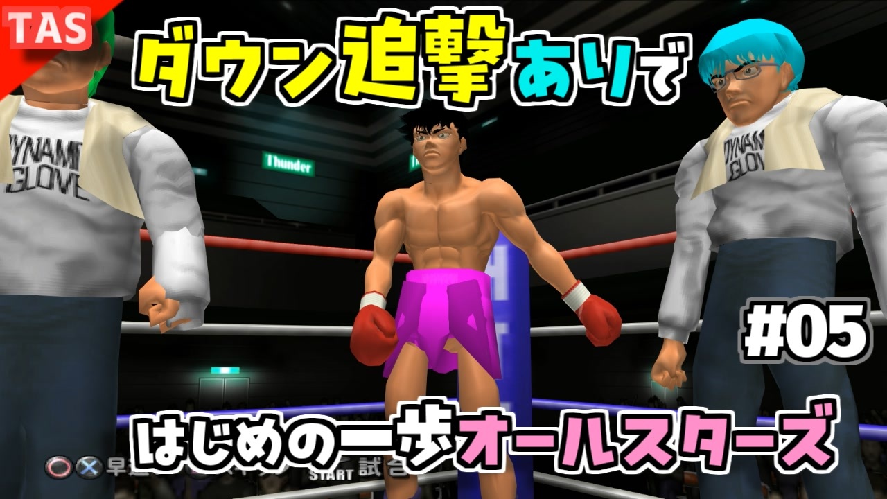 改造はじめの一歩オールスターズのストーリモード開始です<br>(改造伊達英二シリーズはひとつ前のはじめの一歩2と言うソフトです)<br><br>結構改造プログラムの流用が出来たので、追い打ちモードを有効にしています。<br>また、ストーリームービーのモデリングに対して、前回にプラスして、トランクスのパラメーターがランダム化されました<br><br>パート5は以下の2ステージをクリアしました <br>鷹村 対 矢島吉秋(10回戦) <br>一歩 対 千堂 (6回戦)<br><br>使用ソフト:はじめの一歩 ALL☆STARS PS2版<br>ジャンル:ボクシングゲーム<br><br><br>会長 VS リカルド →<a href="https://www.nicovideo.jp/watch/sm44079325" class="watch">sm44079325</a><br>デブになった鷹村 →<a href="https://www.nicovideo.jp/watch/sm43384767" class="watch">sm43384767</a><br>パパイヤ迫真の追撃 →<a href="https://www.nicovideo.jp/watch/sm44326277" class="watch">sm44326277</a><br>ゲロ道 VS アルフレド →<a href="https://www.nicovideo.jp/watch/sm44423708" class="watch">sm44423708</a><br>一歩追い打ちしてしまう →<a href="https://www.nicovideo.jp/watch/sm44079346" class="watch">sm44079346</a>