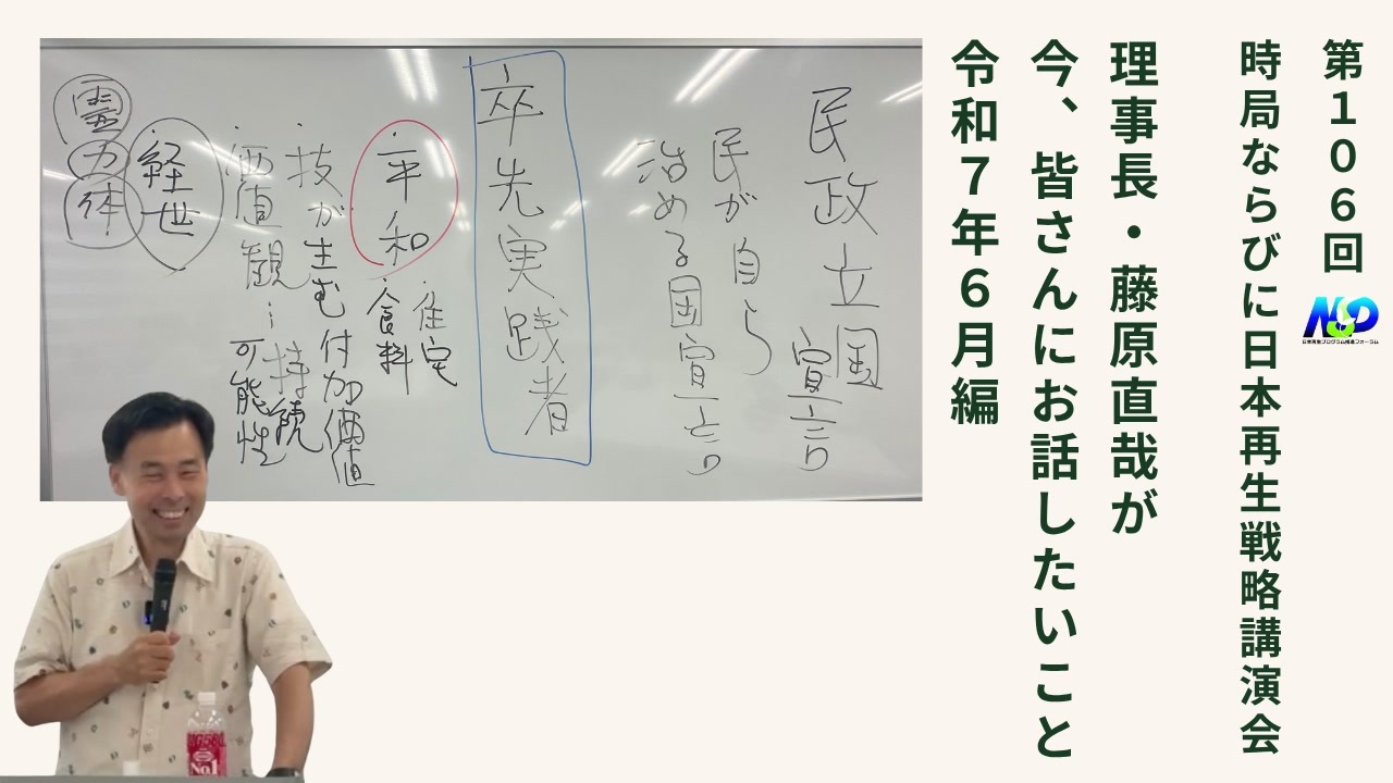 要約<br><br>藤原氏は、世界情勢について話し、イスラエルが滅ぼされつつあることを指摘し、イスラエルの核兵器を取り除けば中東は平和になると述べました。彼はトランプ氏がアメリカ国内のネオコンを一掃していると主張し、イスラエルの真の姿が明らかになりつつあると説明しました。<br><br>藤原氏は、現在の世界情勢を「映画」と表現し、すでに整理がついていると述べ、日本政府も最後に片付けられると予測しています。彼は山中氏とのセッションについて触れ、AIを使って政府システムを分析することで、明治以降の150年の闇を暴くことができると提案しました。<br><br>藤原氏は、「民政立国」という概念を提唱し、日本は「率先実践者」たちが動かす国であると説明しました。これらの人々は政府や大企業とは距離を置き、自ら率先して行動する人々であり、彼らが日本を支えていると主張しています。<br><br>藤原氏は、平和を維持するためには住宅と食料が重要だと強調し、今後のバブル崩壊時に住宅を確保する方法や、安全な食料供給の確保が課題になると指摘しました。また、「技が生む付加価値」の重要性と、持続可能性を高めることが社会の方向性であると述べました。<br><br>質疑応答では、日本の政治体制について共和制が良いのではないかという質問に対し、藤原氏はAIで全てを分析することが第一歩だと回答しました。また、暗号資産の安全性、住宅問題の解決策、知的所有権の今後、エネルギー政策の展望についても議論されました。<br><br>最後に藤原氏は、AIが人間の単調な仕事を代替することは良いことだと述べ、時間ができれば人は新しいことを始めるだろうと楽観的な見方を示しました。彼は「率先実践者」の時代が来ていると締めくくりました。<br>4:02
