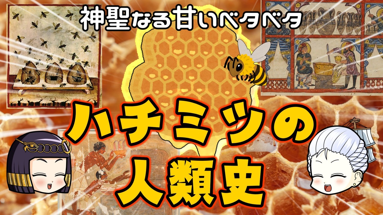 マリーはいにしえのコント番組にハマっているようです。 <br>砂糖が広まるまでは甘味料の王様として君臨していた蜂蜜。でも砂糖に比べるとだいぶ影が薄い…? <br>まあそうなんだけど、その蜂蜜をちょっと掘り下げてみると意外な事実が判明してくるかもしれません。しらんけど。 <br><br>☆ニコニコチャンネル「モンド・ヒストリカの離宮」 <br>→<a href="https://ch.nicovideo.jp/mond-historica" target="_blank" rel="noopener nofollow">https://ch.nicovideo.jp/mond-historica</a> <br><br>今回の主要参考文献; <br>ルーシー・M・ロング(2017)『ハチミツの歴史』大山晶訳 原書房<br>森安孝夫(2020)『シルクロード世界史』講談社<br>中邑徹(2020)『地震とミノア文明』インタープレイ<br>クセノポン(1993)『アナバシス』松平千秋訳 岩波書店<br><br>その他 Wikipediaなど <br><br>twitter→<a href="https://twitter.com/mond_historica" target="_blank" rel="noopener nofollow">https://twitter.com/mond_historica</a><br />━━━━━━━━━━━━━━━━━━━━━<br><br>この動画はクリエイティブ・コモンズ継承(CC-BY-SA)ライセンスの素材を使用して制作しています。(<a href="https://creativecommons.org/licenses/by-sa/4.0/)" target="_blank" rel="noopener nofollow">https://creativecommons.org/licenses/by-sa/4.0/)</a><br>規約に基づき、この動画もCC-BY-SA 4.0 のもとで公開します。<br><br>投稿者共通情報☆彡<br><br>BGM, SE:ニコニ・コモンズ様<br><a href="http://commons.nicovideo.jp/" target="_blank" rel="noopener nofollow">http://commons.nicovideo.jp/</a><br>魔王魂様<br><a href="https://maoudamashii.jokersounds.com/" target="_blank" rel="noopener nofollow">https://maoudamashii.jokersounds.com/</a><br>Audiostock様<br><a href="https://audiostock.jp/" target="_blank" rel="noopener nofollow">https://audiostock.jp/</a><br><br>立ち絵 霊夢・魔理沙(黒子式):nicotalk様<br><a href="http://www.nicotalk.com/charasozai.html" target="_blank" rel="noopener nofollow">http://www.nicotalk.com/charasozai.html</a><br><br>立ち絵 パトラ、マリー、アン、メアリ:ライフライフ様<br><a href="https://0801lifelife.tumblr.com/" target="_blank" rel="noopener nofollow">https://0801lifelife.tumblr.com/</a><br><br>使用ツール1:ゆっくりムービーメーカー4<br><a href="https://manjubox.net/ymm4/" target="_blank" rel="noopener nofollow">https://manjubox.net/ymm4/</a><br><br>使用ツール2:AviUtl<br><a href="http://spring-fragrance.mints.ne.jp/aviutl/" target="_blank" rel="noopener nofollow">http://spring-fragrance.mints.ne.jp/aviutl/</a><br><br>各時代の地図 : World History Maps & Timelines <br><a href="http://geacron.com/home-en/" target="_blank" rel="noopener nofollow">http://geacron.com/home-en/</a><br><br>ゆっくりボイスについて:AquesTalkライセンス取得済み<br><br>キャラクターボイス<br>アン・ボニー:羽ノ華(A.I.VOICE)<br>メアリ・リード:琴葉 葵(A.I.VOICE)<br>クレオパトラ:結月ゆかり(VOICEROID2)<br>マリー‐アントワネット:東北きりたん (VOICEROID EX)<br>その他キャラ:青山龍星(A.I.VOICE)、伊織弓鶴(A.I.VOICE2)、栗田まろん(A.I.VOICE)、宮舞モカ(VOICEPEAK)、フリモメン(VOICEPEAK)<br><br><br><br>その他フリー素材ご提供元の皆様に圧倒的感謝<br>