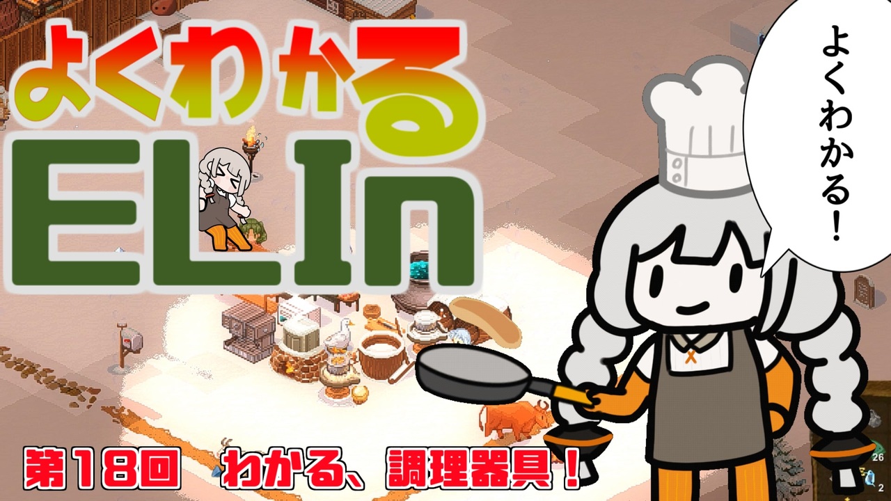 Ellin序盤で苦しんでいる人向けの動画が終わりましたが、このゲームわからないことが多いので第三シーズン突入します。 <br>今回は、本当はシンプル版として作っていたんですが、よく考えると次回と合わせて本編にしたほうがいいと思い、本編にしました。なのでハイライトとロードマップは今回無いです。<br>そんな感じにシンプルに、食事にまつわる調理設備や加工設備集め回、現状存在する料理に関わる設備を揃えていきます。<br><br>訂正:木うすは水銀で強化値低下して食事特性を変える、堕天使の血でレベルを変えずに食事特性変更でした… <br><br>お借りした素材 はコンテンツツリーと以下<br><br> M-ART様 <a href="https://mart.kitunebi.com/index.html" target="_blank" rel="noopener nofollow">https://mart.kitunebi.com/index.html</a> <br>効果音ラボ様 <a href="https://soundeffect-lab.info/" target="_blank" rel="noopener nofollow">https://soundeffect-lab.info/</a> <br>OtoLogic様 <a href="https://otologic.jp/" target="_blank" rel="noopener nofollow">https://otologic.jp/</a><br>いらすとや様 <a href="https://www.irasutoya.com/" target="_blank" rel="noopener nofollow">https://www.irasutoya.com/</a><br>