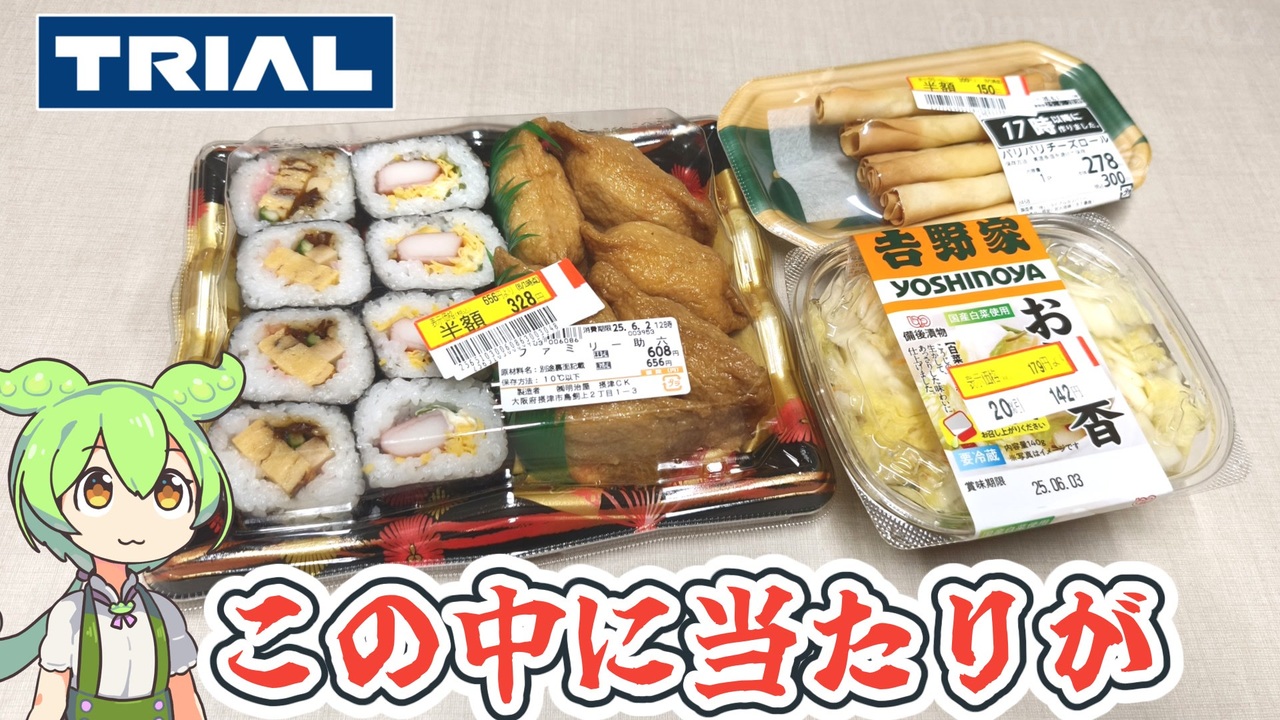 サッカー観戦の帰りに、トライアルに行って夜ご飯がないか探してきました。<br><br><br>【参考】<br>トライアル<br><a href="https://www.trial-net.co.jp/" target="_blank" rel="noopener nofollow">https://www.trial-net.co.jp/</a><br>吉野家お新香カップ140g(備後漬物)<br><a href="http://www.bingotukemono.jp/blog/592.html" target="_blank" rel="noopener nofollow">http://www.bingotukemono.jp/blog/592.html</a><br><br>【使用した素材】(※敬称略) <br>(合成音声)VOICEVOX/ずんだもん/四国めたん<br><a href="https://voicevox.hiroshiba.jp/" target="_blank" rel="noopener nofollow">https://voicevox.hiroshiba.jp/</a> <br>(立ち絵)坂本アヒル<br> <a href="https://seiga.nicovideo.jp/seiga/im10788496?track" target="_blank" rel="noopener nofollow">https://seiga.nicovideo.jp/seiga/im10788496?track</a><br>(楽曲)甘茶の音楽工房/「楽しい麦畑」「フルーツパフェ」「お城の舞踏会」<br><a href="https://amachamusic.chagasi.com/" target="_blank" rel="noopener nofollow">https://amachamusic.chagasi.com/</a>