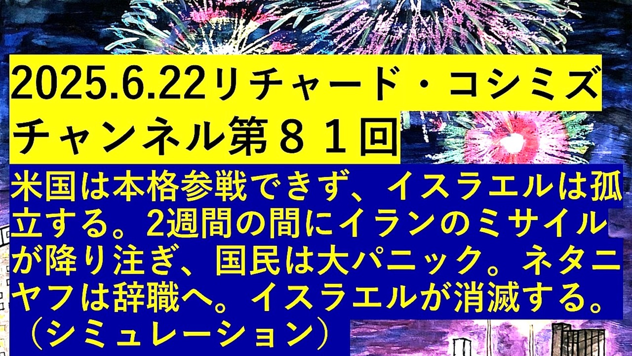 <span style="color: #cc0000;"><strong>◐『「 リチャード・コシミズ・チャンネル 」⦅ 第81回放送 ⦆⦅ 暫定版 ⦆』</strong></span><br><br><span style="color: #ff0000;"><strong> 「『 米国 』は『 本格参戦 』できず、『 イスラエル 』は『 孤立 』する。『 2週間 』の間に『 イラン 』の『 ミサイル 』が『 降り注ぎ 』、『 国民 』は『 大パニック 』。<br> 『 ネタニヤフ 』は『 辞職 』へ。『 イスラエル 』が『 消滅 』する⦅ シミュレーション ⦆」</strong></span><br><br> <span style="color: #38761d;"><strong>◐『 リチャード・コシミズ・チャンネル⦅ ニコニコ チャンネル ⦆』</strong></span><br> <span style="color: #0000ff;"><strong><a href="https://ch.nicovideo.jp/richardkoshimizu" target="_blank" rel="noopener nofollow">https://ch.nicovideo.jp/richardkoshimizu</a></strong></span><br><br> <span style="color: #38761d;"><strong>◐『 リチャード・コシミズ「 ニコニコ生放送⦅ LIVE ⦆」』</strong></span><br> <span style="color: #0000ff;"><strong><a href="https://www.nicovideo.jp/user/120930363/live_programs" target="_blank" rel="noopener nofollow">https://www.nicovideo.jp/user/120930363/live_programs</a></strong></span><br><br> <span style="color: #38761d;"><strong>◐『「 リチャード・コシミズ 講演会 」公式「 動画ギャラリー 」</strong></span><span style="color: #ff0000;"><strong>⦅ 最新動画 ⦆⦅ YouTube版 ⦆</strong></span><span style="color: #38761d;"><strong>』</strong></span><br> <span style="color: #0000ff;"><strong><a href="https://www.youtube.com/@richardkoshimizu-video-gallery" target="_blank" rel="noopener nofollow">https://www.youtube.com/@richardkoshimizu-video-gallery</a></strong></span><br><br>