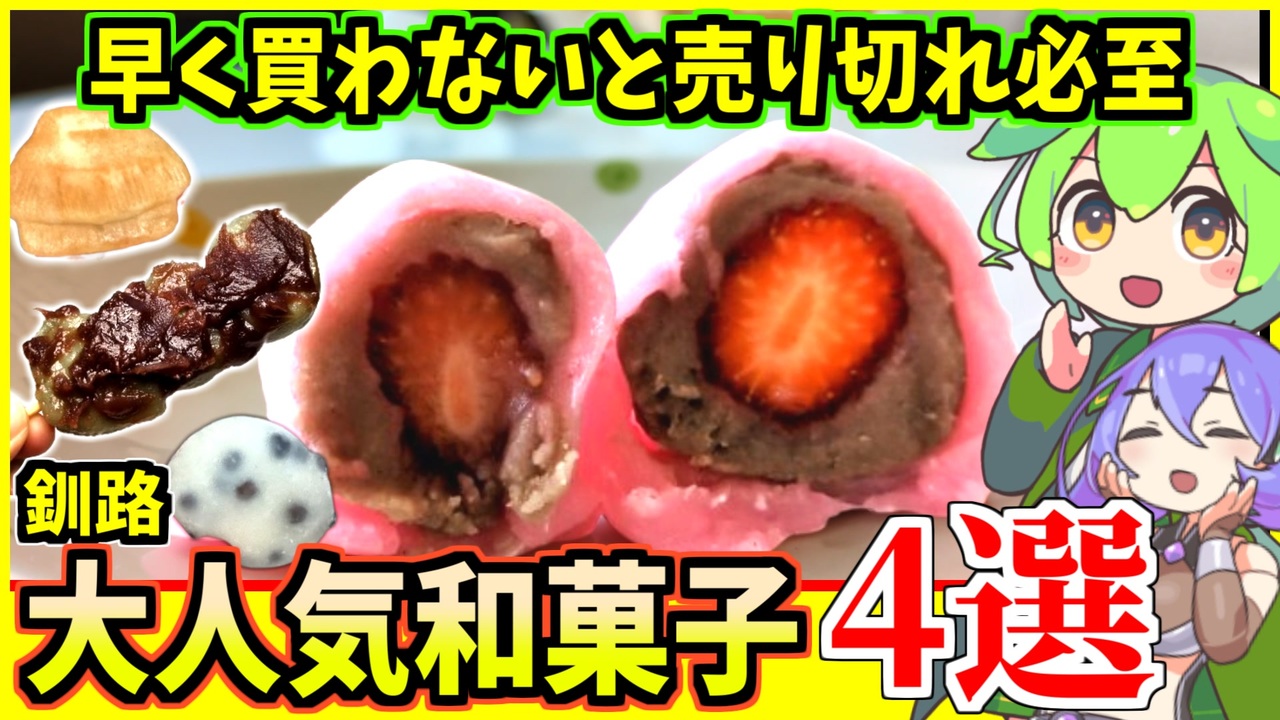 釧路にはおいしい和菓子のお店がたくさんあります <br>その中から4つのお店を紹介します<br><br><br><br>●音声ソフト<br>VOICEVOX:ずんだもん<br>VOICEVOX:九州そら<br><br>●釧路ブログ立ち上げました<br><a href="https://acerolalog.com/" target="_blank" rel="noopener nofollow">https://acerolalog.com/</a><br><br>●X<br>@acerola_vitamin<br><br><br><br /><span style="color: #ff0000; font-size: 24px;"><strong>釧路を紹介するブログ始めました</strong></span>:<a href="https://946de2100.com" target="_blank" rel="noopener nofollow">https://946de2100.com</a><br><br><span style="color: #ff0000; font-size: 16px;"><strong>●おススメ動画:</strong></span><span style="color: #ff0000; font-size: 18px;"><strong>【歴史解説】かつて 釧路を支配していたのは佐賀だった ~釧路元町の始まりと佐野孫右衛門の盛衰~</strong></span><br><br><a href="https://www.nicovideo.jp/watch/sm44267722" class="watch">sm44267722</a><br><br><br><span style="color: #ff0000; font-size: 18px;"><strong>●YouTubeチャンネルも登録よろしくお願いします</strong></span><br><strong>釧路チャンネル <a href="https://www.youtube.com/@znd-kaisetu" target="_blank" rel="noopener nofollow">https://www.youtube.com/@znd-kaisetu</a></strong><br>恋結シラリカソロチャンネル <a href="https://www.youtube.com/@enmusubi-shirarika" target="_blank" rel="noopener nofollow">https://www.youtube.com/@enmusubi-shirarika</a><br><br><br>ほしいものリスト <a href="https://www.amazon.jp/hz/wishlist/ls/2OUUB1JQSRUWG?ref_=wl_share" target="_blank" rel="noopener nofollow">https://www.amazon.jp/hz/wishlist/ls/2OUUB1JQSRUWG?ref_=wl_share</a><br>クリエイターサポート<a href="https://creator-support.nicovideo.jp/registration/116665199" target="_blank" rel="noopener nofollow">https://creator-support.nicovideo.jp/registration/116665199</a>