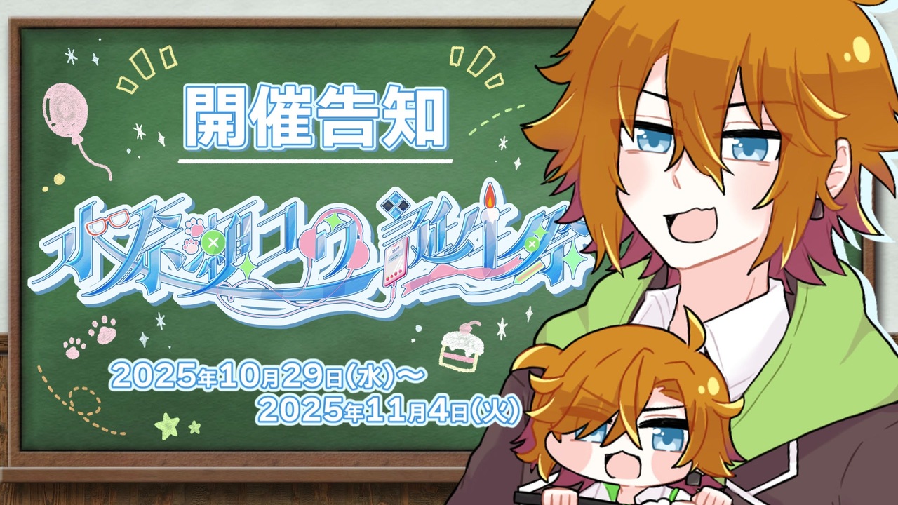 <span style="color: #4a86e8; font-size: 18px;"><strong>水奈瀬コウ誕生祭2025を開催いたします!!!企画もあります!!!</strong></span><br><br>開催期間<br><span style="font-size: 16px;"><strong>2025年10月29日(水)~2025年11月4日(火)</strong></span><br><br>参加タグ(タグロックをお願いいたします)<br><span style="font-size: 16px;"><strong>水奈瀬コウ誕生祭2025</strong></span><br><br>企画参加タグ(上記タグと併せてタグロックをお願いいたします)<br><span style="font-size: 16px;"><strong>ミナセショウ2025</strong></span><br><br><span style="color: #93c47d;">■</span>質問返信動画<br>▻<a href="https://www.nicovideo.jp/watch/sm45458072" class="watch">sm45458072</a><br><span style="color: #4a86e8;">■</span>立ち絵紹介動画<br>▻<a href="https://www.nicovideo.jp/watch/sm45518560" class="watch">sm45518560</a><br><br>投稿祭ロゴ<br>配布先:<a href="https://commons.nicovideo.jp/works/nc420088" target="_blank" rel="noopener">nc420088</a>,<a href="https://commons.nicovideo.jp/works/nc420091" target="_blank" rel="noopener">nc420091</a><br>制作<br><span style="color: #6aa84f;">■</span>逝留れい<br> X(旧Twitter):<a href="https://x.com/Yukidomari_Lei" target="_blank" rel="noopener nofollow">https://x.com/Yukidomari_Lei</a><br><br>今回制作いただいた立ち絵はこちらにまとめております<br>▻<a href="https://seiga.nicovideo.jp/clip/3459239" target="_blank" rel="noopener">clip/3459239</a><br><br>質問・要望などはこちら<br>▻<a href="https://marshmallow-qa.com/ku630pv8bmytuw7" target="_blank" rel="noopener nofollow">https://marshmallow-qa.com/ku630pv8bmytuw7</a><br><br>ーーーーー<br>主催<br><span style="color: #6d9eeb;">■</span>神舘ふの(<a href="https://www.nicovideo.jp/user/57747242" target="_blank" rel="noopener">user/57747242</a>)<br> X(旧Twitter):<a href="https://x.com/_3tch" target="_blank" rel="noopener nofollow">https://x.com/_3tch</a><br><span style="color: #8e7cc3;">■</span>外郎(<a href="https://www.nicovideo.jp/user/139215396" target="_blank" rel="noopener">user/139215396</a>)<br> X(旧Twitter):<a href="https://x.com/4_p8w" target="_blank" rel="noopener nofollow">https://x.com/4_p8w</a><br><span style="color: #ffd966;">■</span>百々環(<a href="https://www.nicovideo.jp/user/129659424" target="_blank" rel="noopener">user/129659424</a>)<br> X(旧Twitter):<a href="https://x.com/ydk_iok" target="_blank" rel="noopener nofollow">https://x.com/ydk_iok</a>