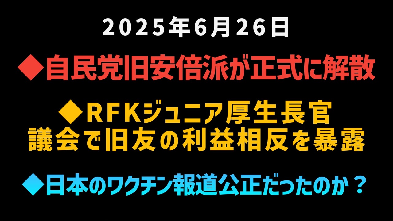 ◆自民党旧安倍派が正式に解散<br><a href="https://x.com/oZfte97IfR30708/status/1937753741752697156?t=qMKl_cQmIef58KbI39oztg&s=19" target="_blank" rel="noopener nofollow">https://x.com/oZfte97IfR30708/status/1937753741752697156?t=qMKl_cQmIef58KbI39oztg&s=19</a><br>◆RFKジュニア厚生長官議会で旧友の利益相反を暴露<br><a href="https://x.com/w2skwn3/status/1937816227520655381?t=6xTecau72wfQN3Y8ESnOIg&s=19" target="_blank" rel="noopener nofollow">https://x.com/w2skwn3/status/1937816227520655381?t=6xTecau72wfQN3Y8ESnOIg&s=19</a><br>◆日本のワクチン報道は公正だったのか?<br><a href="https://x.com/JmaxTopics/status/1937826535953908176?t=fFIBHe_7jWsPKh1Zqm5I-A&s=19" target="_blank" rel="noopener nofollow">https://x.com/JmaxTopics/status/1937826535953908176?t=fFIBHe_7jWsPKh1Zqm5I-A&s=19</a><br><br><br>◆ 今回の台本<br><a href="https://keiichiro8140.hatenablog.com/entry/20250626777" target="_blank" rel="noopener nofollow">https://keiichiro8140.hatenablog.com/entry/20250626777</a><br><br><br>◆もしも(BAN)の時のためのマイリンク集<br><a href="https://lit.link/keiichiro8140" target="_blank" rel="noopener nofollow">https://lit.link/keiichiro8140</a><br><br><br>気になったニュース 2025/6/26<br><br><br />著作権、肖像権に配慮して作成しております。<br><br>◆気になったニュースの台本!?<br>メモ代わりに作った台本をそのままあげてます<br><a href="https://keiichiro8140.hatenablog.com/." target="_blank" rel="noopener nofollow">https://keiichiro8140.hatenablog.com/.</a><br><br><br>ここからはシリーズ紹介<br><br><br>◆ ワクチン解毒・デトックス<br><a href="https://x.gd/fZweg" target="_blank" rel="noopener nofollow">https://x.gd/fZweg</a><br><br>◆ウイリアム・マキス博士のがん治療(イベルメクチン・フェンベンダゾール等)<br><a href="https://x.gd/AtFYS" target="_blank" rel="noopener nofollow">https://x.gd/AtFYS</a><br><br>◆予防接種健康被害救済制度<br><a href="https://x.gd/0xK9x" target="_blank" rel="noopener nofollow">https://x.gd/0xK9x</a><br><br>◆気になったニュース #1501~<br><br>◆ 【ショートver】気になったニュース<br><a href="https://x.gd/7MxXC" target="_blank" rel="noopener nofollow">https://x.gd/7MxXC</a><br><br>◆ 気になったニュース #1001~<br><a href="https://x.gd/Lp8gv" target="_blank" rel="noopener nofollow">https://x.gd/Lp8gv</a><br><br>◆ 気になったニュース #501~<br><a href="https://x.gd/EmbS4" target="_blank" rel="noopener nofollow">https://x.gd/EmbS4</a><br><br>◆ 気になったニュース #1~#500<br><a href="https://x.gd/uPhNb" target="_blank" rel="noopener nofollow">https://x.gd/uPhNb</a><br><br>◆ X(旧Twitter)・テレグラムで気になった情報<br><a href="https://x.gd/YG6FT" target="_blank" rel="noopener nofollow">https://x.gd/YG6FT</a><br><br>◆ 日比谷5万人パレードデ⚪生放送アーカイブ動画<br><a href="https://x.gd/3CHJv" target="_blank" rel="noopener nofollow">https://x.gd/3CHJv</a><br><br>◆日比谷5万人パレード⚪モのマイリスト作ってみました<br><a href="https://nico.ms/mylist/76828848?ref=sp_other" target="_blank" rel="noopener nofollow">https://nico.ms/mylist/76828848?ref=sp_other</a><br><br>◆3.30 令和の百姓⚪⚪<br><a href="https://www.nicovideo.jp/series/511791?ref=garage_share_other" target="_blank" rel="noopener nofollow">https://www.nicovideo.jp/series/511791?ref=garage_share_other</a><br><br>◆ 及川幸久さんの【XNEWS】シリーズ<br><a href="https://x.gd/3k78K" target="_blank" rel="noopener nofollow">https://x.gd/3k78K</a><br><br>◆これまでの動画<a href="https://x.gd/sPXoJ" target="_blank" rel="noopener nofollow">https://x.gd/sPXoJ</a><br><br>◆もしも(BAN)の時のためのマイリンク集<a href="https://lit.link/K-16_News44" target="_blank" rel="noopener nofollow">https://lit.link/K-16_News44</a><br><br>