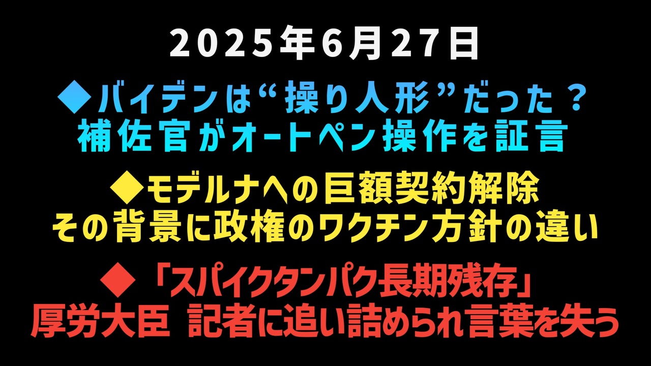 ◆ バイデンは“操り人形”だった?補佐官がオートペン操作を証言<a href="https://x.com/TotalWorld1/status/1938016863101063204?t=XQ9iOFFRo3ixgdDZa9buOw&s=19" target="_blank" rel="noopener nofollow">https://x.com/TotalWorld1/status/1938016863101063204?t=XQ9iOFFRo3ixgdDZa9buOw&s=19</a><br><br>◆ モデルナへの巨額契約解除、その背景に政権のワクチン方針の違いがあります。<a href="https://x.com/corowaku_memo/status/1937840711665418414?t=r9gFSRqT1T8aTm1HQoCqnw&s=19" target="_blank" rel="noopener nofollow">https://x.com/corowaku_memo/status/1937840711665418414?t=r9gFSRqT1T8aTm1HQoCqnw&s=19</a><br><br>◆「スパイクタンパク長期残存」厚労大臣、記者に追い詰められ言葉を失う<a href="https://x.com/JINKOUZOUKA_jp/status/1937865064926835024?t=Rf5V2pn0o3VqjRtuEN0H6g&s=19" target="_blank" rel="noopener nofollow">https://x.com/JINKOUZOUKA_jp/status/1937865064926835024?t=Rf5V2pn0o3VqjRtuEN0H6g&s=19</a><br><br><br>◆ 今回の台本<br><a href="https://keiichiro8140.hatenablog.com/entry/20250627777" target="_blank" rel="noopener nofollow">https://keiichiro8140.hatenablog.com/entry/20250627777</a><br><br><br>◆もしも(BAN)の時のためのマイリンク集<br><a href="https://lit.link/keiichiro8140" target="_blank" rel="noopener nofollow">https://lit.link/keiichiro8140</a><br><br><br>気になったニュース 2025/6/27<br><br><br />著作権、肖像権に配慮して作成しております。<br><br>◆気になったニュースの台本!?<br>メモ代わりに作った台本をそのままあげてます<br><a href="https://keiichiro8140.hatenablog.com/." target="_blank" rel="noopener nofollow">https://keiichiro8140.hatenablog.com/.</a><br><br><br>ここからはシリーズ紹介<br><br><br>◆ ワクチン解毒・デトックス<br><a href="https://x.gd/fZweg" target="_blank" rel="noopener nofollow">https://x.gd/fZweg</a><br><br>◆ウイリアム・マキス博士のがん治療(イベルメクチン・フェンベンダゾール等)<br><a href="https://x.gd/AtFYS" target="_blank" rel="noopener nofollow">https://x.gd/AtFYS</a><br><br>◆予防接種健康被害救済制度<br><a href="https://x.gd/0xK9x" target="_blank" rel="noopener nofollow">https://x.gd/0xK9x</a><br><br>◆気になったニュース #1501~<br><br>◆ 【ショートver】気になったニュース<br><a href="https://x.gd/7MxXC" target="_blank" rel="noopener nofollow">https://x.gd/7MxXC</a><br><br>◆ 気になったニュース #1001~<br><a href="https://x.gd/Lp8gv" target="_blank" rel="noopener nofollow">https://x.gd/Lp8gv</a><br><br>◆ 気になったニュース #501~<br><a href="https://x.gd/EmbS4" target="_blank" rel="noopener nofollow">https://x.gd/EmbS4</a><br><br>◆ 気になったニュース #1~#500<br><a href="https://x.gd/uPhNb" target="_blank" rel="noopener nofollow">https://x.gd/uPhNb</a><br><br>◆ X(旧Twitter)・テレグラムで気になった情報<br><a href="https://x.gd/YG6FT" target="_blank" rel="noopener nofollow">https://x.gd/YG6FT</a><br><br>◆ 日比谷5万人パレードデ⚪生放送アーカイブ動画<br><a href="https://x.gd/3CHJv" target="_blank" rel="noopener nofollow">https://x.gd/3CHJv</a><br><br>◆日比谷5万人パレード⚪モのマイリスト作ってみました<br><a href="https://nico.ms/mylist/76828848?ref=sp_other" target="_blank" rel="noopener nofollow">https://nico.ms/mylist/76828848?ref=sp_other</a><br><br>◆3.30 令和の百姓⚪⚪<br><a href="https://www.nicovideo.jp/series/511791?ref=garage_share_other" target="_blank" rel="noopener nofollow">https://www.nicovideo.jp/series/511791?ref=garage_share_other</a><br><br>◆ 及川幸久さんの【XNEWS】シリーズ<br><a href="https://x.gd/3k78K" target="_blank" rel="noopener nofollow">https://x.gd/3k78K</a><br><br>◆これまでの動画<a href="https://x.gd/sPXoJ" target="_blank" rel="noopener nofollow">https://x.gd/sPXoJ</a><br><br>◆もしも(BAN)の時のためのマイリンク集<a href="https://lit.link/K-16_News44" target="_blank" rel="noopener nofollow">https://lit.link/K-16_News44</a><br><br>