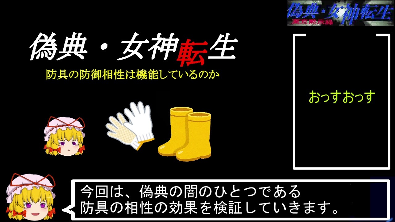 <span style="font-size: 16px;"><strong><i>やっぱりな(レ</i></strong></span><br>細かいデータは連動ブログ『Yukarin's Hummer!』(翌日更新)も併せてお楽しみ下さい。<br><br><strong>☆あの伝説のオセルートに挑む!☆</strong><br>Part6:<a href="https://www.nicovideo.jp/watch/sm45082110" class="watch">sm45082110</a><br><br><strong>MEDIT for MS-DOS</strong> <a href="https://www.vector.co.jp/soft/dos/util/se020725.html" target="_blank" rel="noopener nofollow">https://www.vector.co.jp/soft/dos/util/se020725.html</a><br><br><strong>※前回の動画の視聴、コメント、いいね、広告下さった兄貴姉貴達、<br>サンキューベリマッチョナス!<br><br>☆偽典について知ってることがあればコメ欄にオナシャス!<br> 新情報については検証も行う予定です。<br><br>☆参考資料</strong><br>・にゃるらとてっぷホテル様<br>・着弾書店様『偽典・女神転生非公式ガイド』(データ編・マップ編・属性検証?)<br>・Somatic Energy Institute様<br><br><strong>☆使用素材</strong><br>ゆっくり きつね兄貴 <a href="https://seiga.nicovideo.jp/seiga/im4817713" target="_blank" rel="noopener">im4817713</a><br>効果音 OtoLogic様 <a href="https://otologic.jp/" target="_blank" rel="noopener nofollow">https://otologic.jp/</a><br><br /><strong> ☆元ゲイツァーがLinuxに挑むブログ</strong><br>Linuxは日常使用に耐えるのか?<br><a href="http://welcomelinux.livedoor.blog/" target="_blank" rel="noopener nofollow">http://welcomelinux.livedoor.blog/</a><br><br><strong>☆連動式ブログ</strong><br>Yukarin's Hummer! -偽典・女神転生実況解説-(だいたい翌日更新)<br><a href="https://yukarinshammer.blog.jp/" target="_blank" rel="noopener nofollow">https://yukarinshammer.blog.jp/</a><br><br><strong>☆wineの動作確認とかやってるTwitter(今日から偽典もやります)</strong><br>@XBV_819_tr4<br>