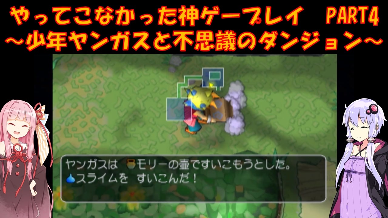 PS2 少年ヤンガスと不思議のダンジョンをプレイ<br>ゆかりさんはメジャーじゃないゲームをやる俺カッケー族だったのでドラクエをやったことがありませんでした(DSのⅤ以外)<br><br>茜:スライム!ゲットだぜ!<br>ゆ:みんなもモンスターゲットじゃぞぉ<br><br>PART1:<a href="https://www.nicovideo.jp/watch/sm45104666" target="_blank" rel="noopener nofollow">https://www.nicovideo.jp/watch/sm45104666</a><br><br>各DQシリーズ第1回リンク<br>DQ1:<a href="https://www.nicovideo.jp/watch/sm41819145" target="_blank" rel="noopener nofollow">https://www.nicovideo.jp/watch/sm41819145</a><br>DQ2:<a href="https://www.nicovideo.jp/watch/sm41895278" target="_blank" rel="noopener nofollow">https://www.nicovideo.jp/watch/sm41895278</a><br>DQ3:<a href="https://www.nicovideo.jp/watch/sm42034398" target="_blank" rel="noopener nofollow">https://www.nicovideo.jp/watch/sm42034398</a><br>DQ4:<a href="https://www.nicovideo.jp/watch/sm42520974" target="_blank" rel="noopener nofollow">https://www.nicovideo.jp/watch/sm42520974</a><br>DQ5:<a href="https://www.nicovideo.jp/watch/sm42848575" target="_blank" rel="noopener nofollow">https://www.nicovideo.jp/watch/sm42848575</a><br>DQ6:<a href="https://www.nicovideo.jp/watch/sm43080264" target="_blank" rel="noopener nofollow">https://www.nicovideo.jp/watch/sm43080264</a><br>DQ7:<a href="https://www.nicovideo.jp/watch/sm43851863" target="_blank" rel="noopener nofollow">https://www.nicovideo.jp/watch/sm43851863</a><br>DQ8:<a href="https://www.nicovideo.jp/watch/sm44676588" target="_blank" rel="noopener nofollow">https://www.nicovideo.jp/watch/sm44676588</a><br>DQM1:<a href="https://www.nicovideo.jp/watch/sm43525709" target="_blank" rel="noopener nofollow">https://www.nicovideo.jp/watch/sm43525709</a><br>DQMCH:<a href="https://www.nicovideo.jp/watch/sm44443421" target="_blank" rel="noopener nofollow">https://www.nicovideo.jp/watch/sm44443421</a><br><br>動画内で使用させていただいた素材<br>【イラスト】<br>結月ゆかり→ペテン師様:<a href="https://seiga.nicovideo.jp/seiga/im5494168" target="_blank" rel="noopener nofollow">https://seiga.nicovideo.jp/seiga/im5494168</a><br>琴葉茜→ユメのオワリ様:<a href="https://seiga.nicovideo.jp/seiga/im10706241" target="_blank" rel="noopener nofollow">https://seiga.nicovideo.jp/seiga/im10706241</a><br><br>【音声】<br>A.I.Voice:琴葉茜<br><a href="https://aivoice.jp/product/kotonoha/" target="_blank" rel="noopener nofollow">https://aivoice.jp/product/kotonoha/</a><br><br>A.I.Voice:結月ゆかり<br><a href="https://aivoice.jp/product/yukari/" target="_blank" rel="noopener nofollow">https://aivoice.jp/product/yukari/</a><br><br>【その他素材】<br><br>この動画で利用している株式会社スクウェア・エニックスを代表とする共同著作者が権利を所有する著作物及びスギヤマ工房有限会社が権利を所有する楽曲の転載・配布は禁止いたします。<br>© 2006 ARMOR PROJECT/BIRD STUDIO/SQUARE ENIX All Rights Reserved.<br>© SUGIYAMA KOBO