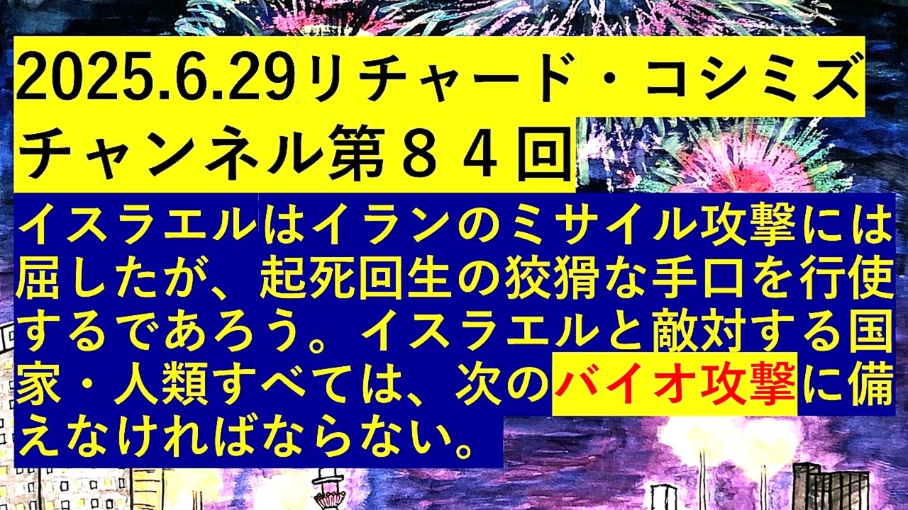 <span style="color: #cc0000;"><strong>◐『「 リチャード・コシミズ・チャンネル 」⦅ 第84回放送 ⦆⦅ 暫定版 ⦆』</strong></span><br><br><span style="color: #ff0000;"><strong> 「『 イスラエル 』は『 イラン 』の『 ミサイル攻撃 』には『 屈した 』が、『 起死回生 』の『 狡猾 』な『 手口 』を『 行使 』するであろう。<br> 『 イスラエル 』と『 敵対 』する『 国家 』・『 人類 』すべては、次の『 バイオ攻撃 』に『 備えなければならない 』」</strong></span><br><br> <span style="color: #38761d;"><strong>◐『 リチャード・コシミズ・チャンネル⦅ ニコニコ チャンネル ⦆』</strong></span><br> <span style="color: #0000ff;"><strong><a href="https://ch.nicovideo.jp/richardkoshimizu" target="_blank" rel="noopener nofollow">https://ch.nicovideo.jp/richardkoshimizu</a></strong></span><br><br> <span style="color: #38761d;"><strong>◐『 リチャード・コシミズ「 ニコニコ生放送⦅ LIVE ⦆」』</strong></span><br> <span style="color: #0000ff;"><strong><a href="https://www.nicovideo.jp/user/120930363/live_programs" target="_blank" rel="noopener nofollow">https://www.nicovideo.jp/user/120930363/live_programs</a></strong></span><br><br> <span style="color: #38761d;"><strong>◐『「 リチャード・コシミズ 講演会 」公式「 動画ギャラリー 」</strong></span><span style="color: #ff0000;"><strong>⦅ 最新動画 ⦆⦅ YouTube版 ⦆</strong></span><span style="color: #38761d;"><strong>』</strong></span><br> <span style="color: #0000ff;"><strong><a href="https://www.youtube.com/@richardkoshimizu-video-gallery" target="_blank" rel="noopener nofollow">https://www.youtube.com/@richardkoshimizu-video-gallery</a></strong></span><br><br>
