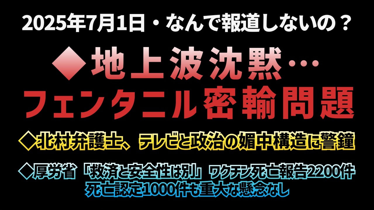 本来ひとつにしたかったのですが、動画作成に自分の技量ではかなり時間を要するので分割して作りました。<br>常連さんには反復?復習になってしまいますがどうかご勘弁を🙏<br><br><br>◆地上波沈黙…フェンタニル密輸問題<a href="https://x.com/hong2010kong/status/1939290703361949749?t=8LUhxDRC73ye21j_6CZ14A&s=19" target="_blank" rel="noopener nofollow">https://x.com/hong2010kong/status/1939290703361949749?t=8LUhxDRC73ye21j_6CZ14A&s=19</a><br><br>◆北村弁護士、テレビと政治の媚中構造に警鐘<a href="https://x.com/hellomitz3/status/1929654725538169123?t=XP5x1roZPhKQ7FOVQ1S8JA&s=19" target="_blank" rel="noopener nofollow">https://x.com/hellomitz3/status/1929654725538169123?t=XP5x1roZPhKQ7FOVQ1S8JA&s=19</a><br><br>◆厚労省「救済と安全性は別」ワクチン死亡報告2200件、死亡認定1000件も重大な懸念なし<a href="https://x.gd/pHOzI" target="_blank" rel="noopener nofollow">https://x.gd/pHOzI</a><br><br><br>◆ 今回の台本<a href="https://keiichiro8140.hatenablog.com/entry/2025070888" target="_blank" rel="noopener nofollow">https://keiichiro8140.hatenablog.com/entry/2025070888</a><br><br><br>◆YouTubeチャンネル登録よろしくお願いします<a href="https://youtube.com/@k16_888?si=1S8pLN1Tf9bGiJyV" target="_blank" rel="noopener nofollow">https://youtube.com/@k16_888?si=1S8pLN1Tf9bGiJyV</a><br><br><br>◆もしも(BAN)の時のためのマイリンク集<a href="https://lit.link/keiichiro8140" target="_blank" rel="noopener nofollow">https://lit.link/keiichiro8140</a><br><br><br>気になったニュース 2025/7/1<br><br><br />著作権、肖像権に配慮して作成しております。<br><br>◆気になったニュースの台本!?<br>メモ代わりに作った台本をそのままあげてます<br><a href="https://keiichiro8140.hatenablog.com/." target="_blank" rel="noopener nofollow">https://keiichiro8140.hatenablog.com/.</a><br><br><br>ここからはシリーズ紹介<br><br><br>◆ ワクチン解毒・デトックス<br><a href="https://x.gd/fZweg" target="_blank" rel="noopener nofollow">https://x.gd/fZweg</a><br><br>◆ウイリアム・マキス博士のがん治療(イベルメクチン・フェンベンダゾール等)<br><a href="https://x.gd/AtFYS" target="_blank" rel="noopener nofollow">https://x.gd/AtFYS</a><br><br>◆予防接種健康被害救済制度<br><a href="https://x.gd/0xK9x" target="_blank" rel="noopener nofollow">https://x.gd/0xK9x</a><br><br>◆気になったニュース #1501~<br><br>◆ 【ショートver】気になったニュース<br><a href="https://x.gd/7MxXC" target="_blank" rel="noopener nofollow">https://x.gd/7MxXC</a><br><br>◆ 気になったニュース #1001~<br><a href="https://x.gd/Lp8gv" target="_blank" rel="noopener nofollow">https://x.gd/Lp8gv</a><br><br>◆ 気になったニュース #501~<br><a href="https://x.gd/EmbS4" target="_blank" rel="noopener nofollow">https://x.gd/EmbS4</a><br><br>◆ 気になったニュース #1~#500<br><a href="https://x.gd/uPhNb" target="_blank" rel="noopener nofollow">https://x.gd/uPhNb</a><br><br>◆ X(旧Twitter)・テレグラムで気になった情報<br><a href="https://x.gd/YG6FT" target="_blank" rel="noopener nofollow">https://x.gd/YG6FT</a><br><br>◆ 日比谷5万人パレードデ⚪生放送アーカイブ動画<br><a href="https://x.gd/3CHJv" target="_blank" rel="noopener nofollow">https://x.gd/3CHJv</a><br><br>◆日比谷5万人パレード⚪モのマイリスト作ってみました<br><a href="https://nico.ms/mylist/76828848?ref=sp_other" target="_blank" rel="noopener nofollow">https://nico.ms/mylist/76828848?ref=sp_other</a><br><br>◆3.30 令和の百姓⚪⚪<br><a href="https://www.nicovideo.jp/series/511791?ref=garage_share_other" target="_blank" rel="noopener nofollow">https://www.nicovideo.jp/series/511791?ref=garage_share_other</a><br><br>◆ 及川幸久さんの【XNEWS】シリーズ<br><a href="https://x.gd/3k78K" target="_blank" rel="noopener nofollow">https://x.gd/3k78K</a><br><br>◆これまでの動画<a href="https://x.gd/sPXoJ" target="_blank" rel="noopener nofollow">https://x.gd/sPXoJ</a><br><br>◆もしも(BAN)の時のためのマイリンク集<a href="https://lit.link/K-16_News44" target="_blank" rel="noopener nofollow">https://lit.link/K-16_News44</a><br><br>