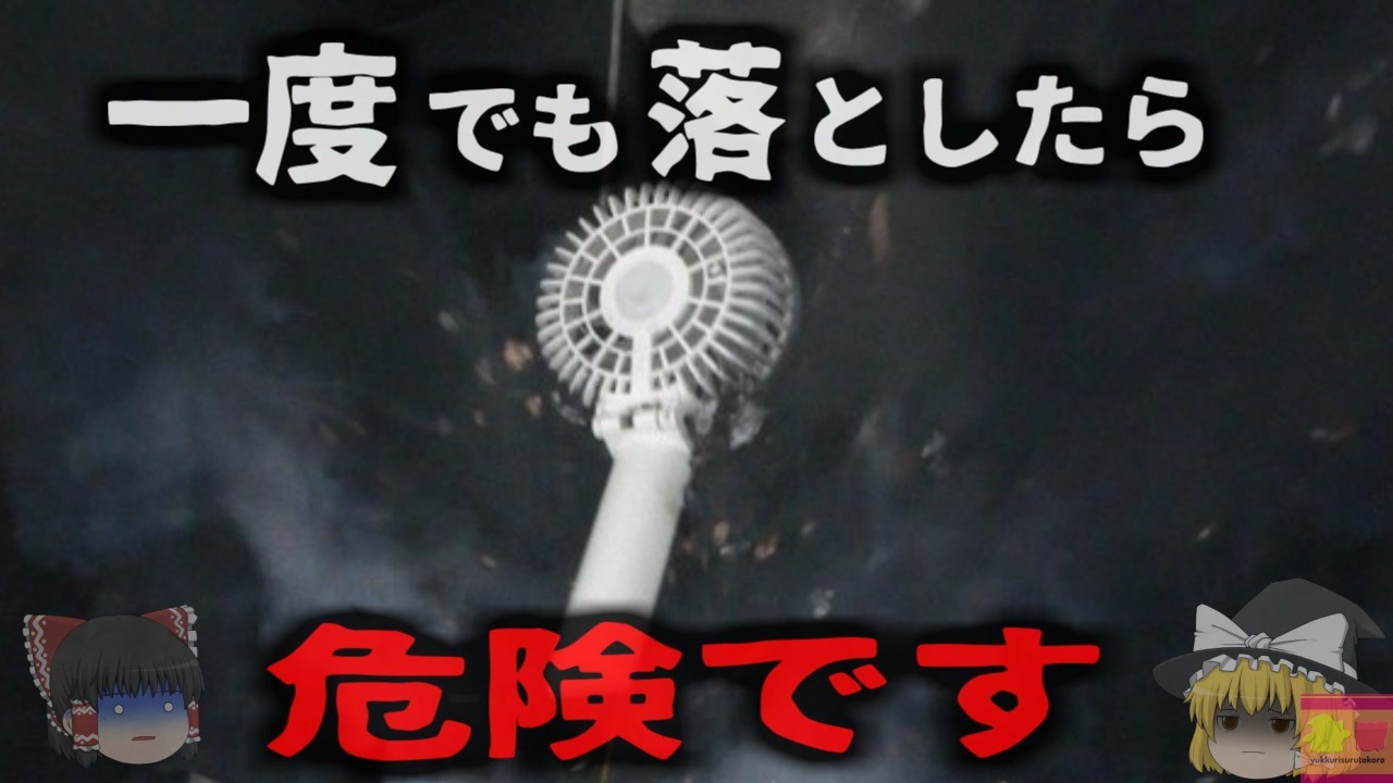 <a href="#" class="seekTime" data-seekTime="00:17" onclick="seekNicoPlayer('#00:17'); return false;">#00:17</a> ボヤ騒ぎ<br><a href="#" class="seekTime" data-seekTime="00:53" onclick="seekNicoPlayer('#00:53'); return false;">#00:53</a> 携帯型扇風機からの発火<br><a href="#" class="seekTime" data-seekTime="1:47" onclick="seekNicoPlayer('#1:47'); return false;">#1:47</a> 「リチウムイオンバッテリー」のリスク<br><a href="#" class="seekTime" data-seekTime="3:40" onclick="seekNicoPlayer('#3:40'); return false;">#3:40</a> 製造元も不明な安価な製品<br><a href="#" class="seekTime" data-seekTime="4:32" onclick="seekNicoPlayer('#4:32'); return false;">#4:32</a> 年々増加する発火事例<br><a href="#" class="seekTime" data-seekTime="5:21" onclick="seekNicoPlayer('#5:21'); return false;">#5:21</a> 過充電以外にも危険が<br><a href="#" class="seekTime" data-seekTime="6:33" onclick="seekNicoPlayer('#6:33'); return false;">#6:33</a> 技適マーク、PSEマークを確認しよう<br><br><br><br>引用・出展・参考文献(視聴者提供資料など<br>独立行政法人 製品評価技術基盤機構 NITE<br>リチウムイオン電池関連製品の製造と安全性<br><a href="https://x.gd/8eknv" target="_blank" rel="noopener nofollow">https://x.gd/8eknv</a><br>読売新聞携帯扇風機落とさないで<br><a href="https://x.gd/pvtL1" target="_blank" rel="noopener nofollow">https://x.gd/pvtL1</a><br>毎日新聞落としたら使わないで<br><a href="https://x.gd/xk4C5" target="_blank" rel="noopener nofollow">https://x.gd/xk4C5</a><br><br><br><br />※この動画は過去の事件を知り、現在でも同じことが発生する危険性を再認識、関与しないように促すための動画であり、視聴者を扇動、動揺を誘うためのコンテンツではありません。<br><br>ご要望にお応えして、メンバーシップの開設を行いました。<br>下記URLからも登録可能ですので、ご興味がある方は是非ご参加ください。<br><a href="https://www.youtube.com/channel/UCcT5a1J7XJW7CLYI2RKl4pw/join" target="_blank" rel="noopener nofollow">https://www.youtube.com/channel/UCcT5a1J7XJW7CLYI2RKl4pw/join</a><br><br><br>Twitter<br>→<a href="https://twitter.com/yukkurisurutoko" target="_blank" rel="noopener nofollow">https://twitter.com/yukkurisurutoko</a><br><br>取り急ぎ、簡易的にですがマイリストを作りました。<br>【ゆっくり解説】事故・事件関係紹介リスト <br><a href="https://www.nicovideo.jp/mylist/71034319" target="_blank" rel="noopener nofollow">https://www.nicovideo.jp/mylist/71034319</a><br>【ゆっくり解説】放射線系事故<br><a href="https://www.nicovideo.jp/mylist/71034368" target="_blank" rel="noopener nofollow">https://www.nicovideo.jp/mylist/71034368</a><br>【ゆっくり解説】鉄道系事故・事件関連<br><a href="https://www.nicovideo.jp/mylist/71034379" target="_blank" rel="noopener nofollow">https://www.nicovideo.jp/mylist/71034379</a>