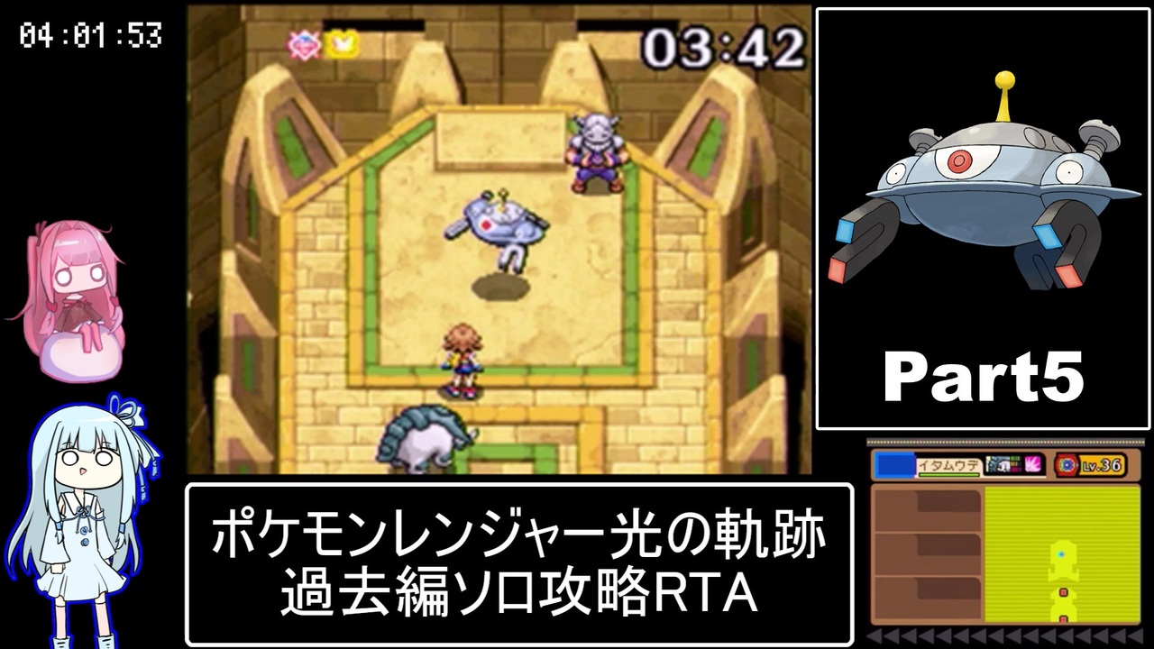 「苦手なポケモンは?」<br>「ジバコイルです」<br>「ジバコイル!なんで?」<br>「やはりなんと言ってもまず厄介な攻撃ですよね。しばらく囲めなくなる放電に、地味に邪魔な電気の塊。で、興奮解除後から繰り出されるバリア。まあ、僕はそれを防ぐためにドンファンを採用していくんですけれども、非常に強力ですよね。あと、電気といった弱点が少なく防御面に優れているタイプもこれ驚異的だと思います。まあ、既プレイの方なら余裕で理解できますよね。はい」<br>「エレキブルにはしなかったんだね?」<br>「エレキブルにはしません!なぜならジバコイルの方が制限時間が短いからです。ご存知です?ジバコステージの制限時間6分30秒、それに対しエレキブルステージの制限時間は9分45秒なんです。この3分15秒の差がとても大きくて、ジバコイルの場合はレンジャーの素早さに補正をかけられず、タイム+を全て回収することで合計11分30秒。これにソロ攻略という縛りを持たせることにより移動距離が15倍となってボス戦時の残り時間が201秒にまで減少するんです。これはネンドールやドータクンといった野生ポケモンいわゆる無駄エンカを極力減らしたときの数値なんですね。過去編というのは無駄エンカが1増えるだけで大幅なロスが決定してしまうゲームです。だからその1の差で強力なボスに対して勝てるかが決まるんです。まあ、かわせるかどうかは別として。確かにエレキブルはジバコイルよりも耐久力攻撃力ともに上回ってはいますが、時間のシビアさではジバコイルが上回っている以上明確に差別化ができていますし、下手すりゃこれジバコイルの方が強いんじゃないですかね。だからみんなジバコイルで詰んでるんです。はい。ていうか視聴者さん、ジバコイル余裕だったということですが、協力プレイしたんですね。はっきり言って羨ましいですよ。視聴が終わった後直ちにソロ攻略し、過去編の地獄を学びなさい」<br>「自分の中で好きな体のパーツは?」<br>「常に上を目指し向上心を忘れることなくただひたすらに過去編に切磋琢磨する。レベル上げを協力プレイや改造という手段に手を染めることもなくトイレの間も惜しみメタグロス周回に没頭する。ひたむきな…」<br>「心です!」 <br><br>雷の神殿編 <br> <br>参考にしたTAS→<a href="https://www.nicovideo.jp/watch/sm17613733" class="watch">sm17613733</a><br><br>前→<a href="https://www.nicovideo.jp/watch/sm45010879" class="watch">sm45010879</a> <br>次→<a href="https://www.nicovideo.jp/watch/sm45206709" class="watch">sm45206709</a> <br>マイリスト→<a href="https://www.nicovideo.jp/mylist/77845958" target="_blank" rel="noopener">mylist/77845958</a> <br>走ったものまとめ→<a href="https://www.nicovideo.jp/mylist/73970721" target="_blank" rel="noopener">mylist/73970721</a>