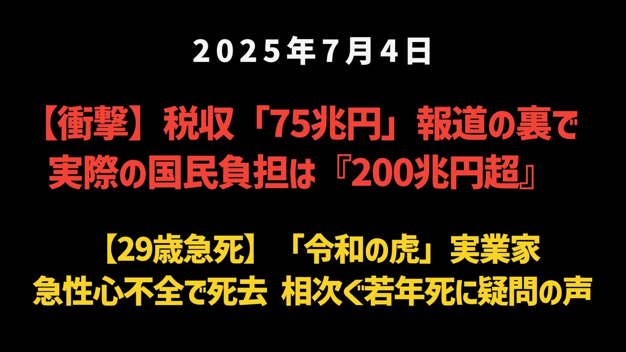 ◆【衝撃】「税収75兆円」報道の裏で、実際の国民負担は200兆円超だった<a href="https://x.com/himuro398/status/1940975467370369072?t=xTvEgSWGXaJFWqGyYMS2TA&s=19" target="_blank" rel="noopener nofollow">https://x.com/himuro398/status/1940975467370369072?t=xTvEgSWGXaJFWqGyYMS2TA&s=19</a><br><br><br>◆【29歳急死】「令和の虎」実業家が急性心不全で死去 相次ぐ若年死に疑問の声<a href="https://x.com/livedoornews/status/1940762838869725522?t=_s_HYEcDpGfZDBd60KhhMw&s=19" target="_blank" rel="noopener nofollow">https://x.com/livedoornews/status/1940762838869725522?t=_s_HYEcDpGfZDBd60KhhMw&s=19</a><br><br><br>◆ 今回の台本<br><a href="https://keiichiro8140.hatenablog.com/entry/202507044444" target="_blank" rel="noopener nofollow">https://keiichiro8140.hatenablog.com/entry/202507044444</a><br><br><br>◆もしも(BAN)の時のためのマイリンク集<a href="https://lit.link/K16_888" target="_blank" rel="noopener nofollow">https://lit.link/K16_888</a><br><br><br>気になったニュース 2025/7/4<br><br><br />著作権、肖像権に配慮して作成しております。<br><br>◆気になったニュースの台本!?<br>メモ代わりに作った台本をそのままあげてます<br><a href="https://keiichiro8140.hatenablog.com/." target="_blank" rel="noopener nofollow">https://keiichiro8140.hatenablog.com/.</a><br><br><br>ここからはシリーズ紹介<br><br><br>◆ ワクチン解毒・デトックス<br><a href="https://x.gd/fZweg" target="_blank" rel="noopener nofollow">https://x.gd/fZweg</a><br><br>◆ウイリアム・マキス博士のがん治療(イベルメクチン・フェンベンダゾール等)<br><a href="https://x.gd/AtFYS" target="_blank" rel="noopener nofollow">https://x.gd/AtFYS</a><br><br>◆予防接種健康被害救済制度<br><a href="https://x.gd/0xK9x" target="_blank" rel="noopener nofollow">https://x.gd/0xK9x</a><br><br>◆気になったニュース #1501~<br><br>◆ 【ショートver】気になったニュース<br><a href="https://x.gd/7MxXC" target="_blank" rel="noopener nofollow">https://x.gd/7MxXC</a><br><br>◆ 気になったニュース #1001~<br><a href="https://x.gd/Lp8gv" target="_blank" rel="noopener nofollow">https://x.gd/Lp8gv</a><br><br>◆ 気になったニュース #501~<br><a href="https://x.gd/EmbS4" target="_blank" rel="noopener nofollow">https://x.gd/EmbS4</a><br><br>◆ 気になったニュース #1~#500<br><a href="https://x.gd/uPhNb" target="_blank" rel="noopener nofollow">https://x.gd/uPhNb</a><br><br>◆ X(旧Twitter)・テレグラムで気になった情報<br><a href="https://x.gd/YG6FT" target="_blank" rel="noopener nofollow">https://x.gd/YG6FT</a><br><br>◆ 日比谷5万人パレードデ⚪生放送アーカイブ動画<br><a href="https://x.gd/3CHJv" target="_blank" rel="noopener nofollow">https://x.gd/3CHJv</a><br><br>◆日比谷5万人パレード⚪モのマイリスト作ってみました<br><a href="https://nico.ms/mylist/76828848?ref=sp_other" target="_blank" rel="noopener nofollow">https://nico.ms/mylist/76828848?ref=sp_other</a><br><br>◆3.30 令和の百姓⚪⚪<br><a href="https://www.nicovideo.jp/series/511791?ref=garage_share_other" target="_blank" rel="noopener nofollow">https://www.nicovideo.jp/series/511791?ref=garage_share_other</a><br><br>◆ 及川幸久さんの【XNEWS】シリーズ<br><a href="https://x.gd/3k78K" target="_blank" rel="noopener nofollow">https://x.gd/3k78K</a><br><br>◆これまでの動画<a href="https://x.gd/sPXoJ" target="_blank" rel="noopener nofollow">https://x.gd/sPXoJ</a><br><br>◆もしも(BAN)の時のためのマイリンク集<a href="https://lit.link/K-16_News44" target="_blank" rel="noopener nofollow">https://lit.link/K-16_News44</a><br><br>
