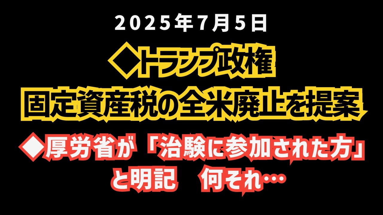 ◆トランプ政権、固定資産税の全米廃止を提案 ~ 自○党政権と真逆の減税政策<a href="https://x.com/japburai/status/1941362232883024241?t=BRQO-dtJ1Ni-44rs98hfVw&s=19" target="_blank" rel="noopener nofollow">https://x.com/japburai/status/1941362232883024241?t=BRQO-dtJ1Ni-44rs98hfVw&s=19</a><br><br><br>◆厚労省が「治験に参加された方」と明記 何それ…<a href="https://x.com/to_ryo_ma/status/1941133648394375354?t=uBqk8mh5pwlR5_X0i5t0BA&s=19" target="_blank" rel="noopener nofollow">https://x.com/to_ryo_ma/status/1941133648394375354?t=uBqk8mh5pwlR5_X0i5t0BA&s=19</a><br><br><br>◆ 今回の台本<a href="https://keiichiro8140.hatenablog.com/entry/20250705999" target="_blank" rel="noopener nofollow">https://keiichiro8140.hatenablog.com/entry/20250705999</a><br><br><br>◆YouTubeチャンネル登録よろしくお願いします<a href="https://youtube.com/@k16_888?si=1S8pLN1Tf9bGiJyV" target="_blank" rel="noopener nofollow">https://youtube.com/@k16_888?si=1S8pLN1Tf9bGiJyV</a><br><br><br><br>◆もしも(BAN)の時のためのマイリンク集<a href="https://lit.link/K16_888" target="_blank" rel="noopener nofollow">https://lit.link/K16_888</a><br><br><br><br>気になったニュース 2025/7/5<br><br><br />著作権、肖像権に配慮して作成しております。<br><br>◆気になったニュースの台本!?<br>メモ代わりに作った台本をそのままあげてます<br><a href="https://keiichiro8140.hatenablog.com/." target="_blank" rel="noopener nofollow">https://keiichiro8140.hatenablog.com/.</a><br><br><br>ここからはシリーズ紹介<br><br><br>◆ ワクチン解毒・デトックス<br><a href="https://x.gd/fZweg" target="_blank" rel="noopener nofollow">https://x.gd/fZweg</a><br><br>◆ウイリアム・マキス博士のがん治療(イベルメクチン・フェンベンダゾール等)<br><a href="https://x.gd/AtFYS" target="_blank" rel="noopener nofollow">https://x.gd/AtFYS</a><br><br>◆予防接種健康被害救済制度<br><a href="https://x.gd/0xK9x" target="_blank" rel="noopener nofollow">https://x.gd/0xK9x</a><br><br>◆気になったニュース #1501~<br><br>◆ 【ショートver】気になったニュース<br><a href="https://x.gd/7MxXC" target="_blank" rel="noopener nofollow">https://x.gd/7MxXC</a><br><br>◆ 気になったニュース #1001~<br><a href="https://x.gd/Lp8gv" target="_blank" rel="noopener nofollow">https://x.gd/Lp8gv</a><br><br>◆ 気になったニュース #501~<br><a href="https://x.gd/EmbS4" target="_blank" rel="noopener nofollow">https://x.gd/EmbS4</a><br><br>◆ 気になったニュース #1~#500<br><a href="https://x.gd/uPhNb" target="_blank" rel="noopener nofollow">https://x.gd/uPhNb</a><br><br>◆ X(旧Twitter)・テレグラムで気になった情報<br><a href="https://x.gd/YG6FT" target="_blank" rel="noopener nofollow">https://x.gd/YG6FT</a><br><br>◆ 日比谷5万人パレードデ⚪生放送アーカイブ動画<br><a href="https://x.gd/3CHJv" target="_blank" rel="noopener nofollow">https://x.gd/3CHJv</a><br><br>◆日比谷5万人パレード⚪モのマイリスト作ってみました<br><a href="https://nico.ms/mylist/76828848?ref=sp_other" target="_blank" rel="noopener nofollow">https://nico.ms/mylist/76828848?ref=sp_other</a><br><br>◆3.30 令和の百姓⚪⚪<br><a href="https://www.nicovideo.jp/series/511791?ref=garage_share_other" target="_blank" rel="noopener nofollow">https://www.nicovideo.jp/series/511791?ref=garage_share_other</a><br><br>◆ 及川幸久さんの【XNEWS】シリーズ<br><a href="https://x.gd/3k78K" target="_blank" rel="noopener nofollow">https://x.gd/3k78K</a><br><br>◆これまでの動画<a href="https://x.gd/sPXoJ" target="_blank" rel="noopener nofollow">https://x.gd/sPXoJ</a><br><br>◆もしも(BAN)の時のためのマイリンク集<a href="https://lit.link/K-16_News44" target="_blank" rel="noopener nofollow">https://lit.link/K-16_News44</a><br><br>