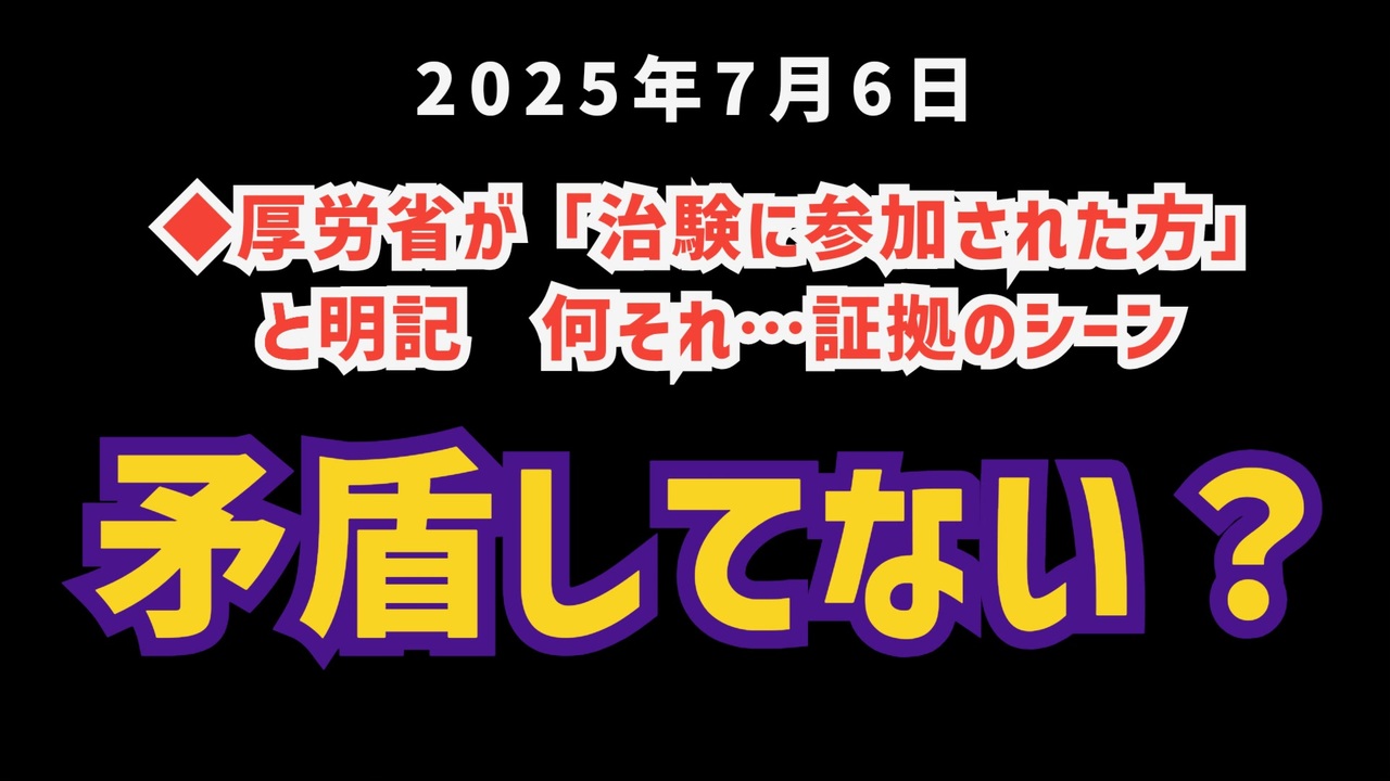 ◆厚労省が「治験に参加された方」 と明記 何ぞれ・・・証拠のシーン<br><br>矛盾してない?というシーンです<br><br>コロナワクチン打ちました<br>⬇<br>被害が出ました<br>⬇<br>苦しみながら救済制度の煩雑な資料を一生懸命集めます<br>⬇<br>接種証明書が必要→ホームページに行ったけど…<br>⬇<br>①海外の~<br>②治験って書いてる<br>③在日米軍~<br><br>この3つしかないんだけど…治験?…<br><br>っていうお話です<br><br>おかしくないですか?<br><br><br>◆厚労省が「治験に参加された方」と明記 何それ…<a href="https://x.com/to_ryo_ma/status/1941133648394375354?t=uBqk8mh5pwlR5_X0i5t0BA&s=19" target="_blank" rel="noopener nofollow">https://x.com/to_ryo_ma/status/1941133648394375354?t=uBqk8mh5pwlR5_X0i5t0BA&s=19</a><br><br><br>◆ 前回の台本<a href="https://keiichiro8140.hatenablog.com/entry/20250705999" target="_blank" rel="noopener nofollow">https://keiichiro8140.hatenablog.com/entry/20250705999</a><br><br><br>◆YouTubeチャンネル登録よろしくお願いします<a href="https://youtube.com/@k16_888?si=1S8pLN1Tf9bGiJyV" target="_blank" rel="noopener nofollow">https://youtube.com/@k16_888?si=1S8pLN1Tf9bGiJyV</a><br><br><br>◆今回の動画<a href="https://nico.ms/sm45157199?ref=other_cap_off" target="_blank" rel="noopener nofollow">https://nico.ms/sm45157199?ref=other_cap_off</a><br><br><br>◆もしも(BAN)の時のためのマイリンク集<a href="https://lit.link/K16_888" target="_blank" rel="noopener nofollow">https://lit.link/K16_888</a><br><br><br>気になったニュース 2025/7/6<br><br><br />著作権、肖像権に配慮して作成しております。<br><br>◆気になったニュースの台本!?<br>メモ代わりに作った台本をそのままあげてます<br><a href="https://keiichiro8140.hatenablog.com/." target="_blank" rel="noopener nofollow">https://keiichiro8140.hatenablog.com/.</a><br><br><br>ここからはシリーズ紹介<br><br><br>◆ ワクチン解毒・デトックス<br><a href="https://x.gd/fZweg" target="_blank" rel="noopener nofollow">https://x.gd/fZweg</a><br><br>◆ウイリアム・マキス博士のがん治療(イベルメクチン・フェンベンダゾール等)<br><a href="https://x.gd/AtFYS" target="_blank" rel="noopener nofollow">https://x.gd/AtFYS</a><br><br>◆予防接種健康被害救済制度<br><a href="https://x.gd/0xK9x" target="_blank" rel="noopener nofollow">https://x.gd/0xK9x</a><br><br>◆気になったニュース #1501~<br><br>◆ 【ショートver】気になったニュース<br><a href="https://x.gd/7MxXC" target="_blank" rel="noopener nofollow">https://x.gd/7MxXC</a><br><br>◆ 気になったニュース #1001~<br><a href="https://x.gd/Lp8gv" target="_blank" rel="noopener nofollow">https://x.gd/Lp8gv</a><br><br>◆ 気になったニュース #501~<br><a href="https://x.gd/EmbS4" target="_blank" rel="noopener nofollow">https://x.gd/EmbS4</a><br><br>◆ 気になったニュース #1~#500<br><a href="https://x.gd/uPhNb" target="_blank" rel="noopener nofollow">https://x.gd/uPhNb</a><br><br>◆ X(旧Twitter)・テレグラムで気になった情報<br><a href="https://x.gd/YG6FT" target="_blank" rel="noopener nofollow">https://x.gd/YG6FT</a><br><br>◆ 日比谷5万人パレードデ⚪生放送アーカイブ動画<br><a href="https://x.gd/3CHJv" target="_blank" rel="noopener nofollow">https://x.gd/3CHJv</a><br><br>◆日比谷5万人パレード⚪モのマイリスト作ってみました<br><a href="https://nico.ms/mylist/76828848?ref=sp_other" target="_blank" rel="noopener nofollow">https://nico.ms/mylist/76828848?ref=sp_other</a><br><br>◆3.30 令和の百姓⚪⚪<br><a href="https://www.nicovideo.jp/series/511791?ref=garage_share_other" target="_blank" rel="noopener nofollow">https://www.nicovideo.jp/series/511791?ref=garage_share_other</a><br><br>◆ 及川幸久さんの【XNEWS】シリーズ<br><a href="https://x.gd/3k78K" target="_blank" rel="noopener nofollow">https://x.gd/3k78K</a><br><br>◆これまでの動画<a href="https://x.gd/sPXoJ" target="_blank" rel="noopener nofollow">https://x.gd/sPXoJ</a><br><br>◆もしも(BAN)の時のためのマイリンク集<a href="https://lit.link/K-16_News44" target="_blank" rel="noopener nofollow">https://lit.link/K-16_News44</a><br><br>