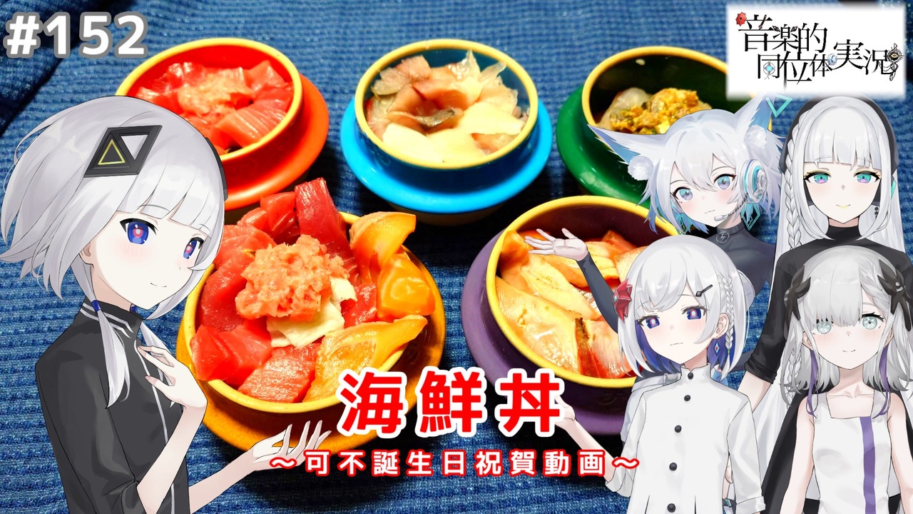 152品目。<br>7月7日は可不ちゃんの、そして「音楽的同位体」の4回目の誕生日。<br>音楽的同位体と一緒に動画を作っている私にとって最大のハレの日ですね。<br>今年はこだわりの海鮮丼を作ってお祝いします。<br>折角なので、海鮮丼を同位体イメージカラーの器に盛り付けちゃいましょう。<br>併せて、らいす先生描きおろしの同位体立ち絵の新差分も公開しちゃいます!<br><br>可不の調理実習室のマイリストはこちらから:<a href="https://www.nicovideo.jp/mylist/74018156" target="_blank" rel="noopener">mylist/74018156</a><br><br><span style="color: #ff0000;"><strong>コメントやいいね、チャンネル登録して頂けると喜びます!</strong></span><br><br>投稿者のYoutubeチャンネルはこちらから→<a href="https://www.youtube.com/@afterglow9702" target="_blank" rel="noopener nofollow">https://www.youtube.com/@afterglow9702</a><br>X(旧Twitter)もフォローお願いします!→<a href="https://twitter.com/afterglow9702" target="_blank" rel="noopener nofollow">https://twitter.com/afterglow9702</a><br><br>使用ツール:NodoAme(作:いぬいぬGames様 <a href="https://www.nicovideo.jp/watch/sm98013232" class="watch">sm98013232</a>)<br>演技指導:可不→すずきつづみ(Cevio AI)<br>立ち絵:はゆ茶様 <a href="https://www.nicovideo.jp/watch/sm39971378" class="watch">sm39971378</a> <a href="https://seiga.nicovideo.jp/seiga/im10877460" target="_blank" rel="noopener">im10877460</a><br> misho様 <a href="https://seiga.nicovideo.jp/seiga/im11363828" target="_blank" rel="noopener">im11363828</a> <a href="https://seiga.nicovideo.jp/seiga/im11347997" target="_blank" rel="noopener">im11347997</a><br> Tsarubu様 <a href="https://seiga.nicovideo.jp/seiga/im11416909" target="_blank" rel="noopener">im11416909</a><br> うらのす海老様 <a href="https://seiga.nicovideo.jp/seiga/im11531609" target="_blank" rel="noopener">im11531609</a><br>音楽的同位体エンドカード:らいす様 <a href="https://twitter.com/rice01200120" target="_blank" rel="noopener nofollow">https://twitter.com/rice01200120</a><br>BGM:MusMus様 <a href="https://musmus.main.jp" target="_blank" rel="noopener nofollow">https://musmus.main.jp</a><br>騒音の無い世界様(コンテンツツリー参照)<br><br>※今回のレシピは株式会社酒井商店様を参考にしています。