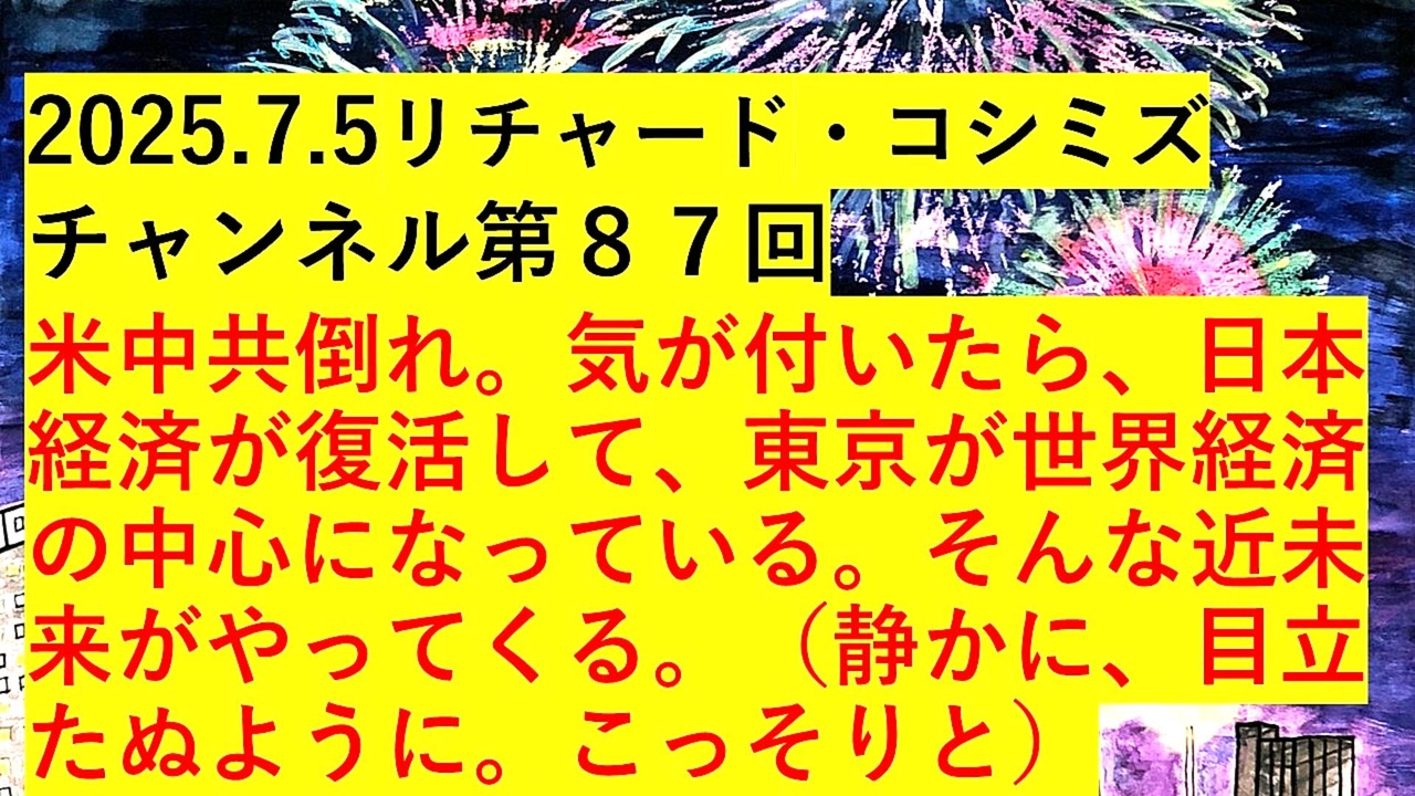<span style="color: #cc0000;"><strong>◐『「 リチャード・コシミズ・チャンネル 」⦅ 第87回放送 ⦆⦅ 暫定版 ⦆』</strong></span><br><br><span style="color: #ff0000;"><strong> 「『 米中共倒れ 』。気が付いたら、『 日本経済 』が『 復活 』して、『 東京 』が『 世界経済 』の『 中心 』になっている。<br> そんな『 近未来 』がやってくる⦅『 静か 』に、『 目立たぬように 』。『 こっそりと 』⦆」</strong></span><br><br> <span style="color: #38761d;"><strong>◐『 リチャード・コシミズ・チャンネル⦅ ニコニコ チャンネル ⦆』</strong></span><br> <span style="color: #0000ff;"><strong><a href="https://ch.nicovideo.jp/richardkoshimizu" target="_blank" rel="noopener nofollow">https://ch.nicovideo.jp/richardkoshimizu</a></strong></span><br><br> <span style="color: #38761d;"><strong>◐『 リチャード・コシミズ「 ニコニコ生放送⦅ LIVE ⦆」』</strong></span><br> <span style="color: #0000ff;"><strong><a href="https://www.nicovideo.jp/user/120930363/live_programs" target="_blank" rel="noopener nofollow">https://www.nicovideo.jp/user/120930363/live_programs</a></strong></span><br><br> <span style="color: #38761d;"><strong>◐『「 リチャード・コシミズ 講演会 」公式「 動画ギャラリー 」</strong></span><span style="color: #ff0000;"><strong>⦅ 最新動画 ⦆⦅ YouTube版 ⦆</strong></span><span style="color: #38761d;"><strong>』</strong></span><br> <span style="color: #0000ff;"><strong><a href="https://www.youtube.com/@richardkoshimizu-video-gallery" target="_blank" rel="noopener nofollow">https://www.youtube.com/@richardkoshimizu-video-gallery</a></strong></span><br><br>