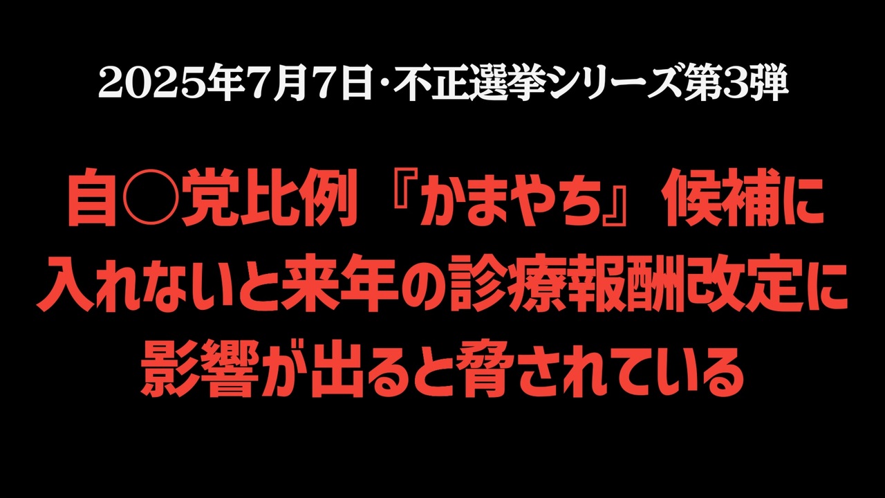 【不正選挙シリーズ第3弾】◆自○党比例『かまやち』候補に入れないと来年の診療報酬改定に影響が出ると脅されている<a href="https://x.com/fseiichizb4/status/1941891544325505086?t=voAvXZIzygL-IT6FqWaU5Q&s=19" target="_blank" rel="noopener nofollow">https://x.com/fseiichizb4/status/1941891544325505086?t=voAvXZIzygL-IT6FqWaU5Q&s=19</a><br><br><br>7月20日、いよいよ参議院選挙。<br>静岡選挙区で、自民党が“特例”で送り出した「かまやち候補」をめぐり波紋が広がっています。<br>元ワクチン分科会の推進派で、日本医師会副会長という立場。<br>しかし今、医師たちの間で「投票しないと診療報酬に影響があると脅された」という声が次々と上がり、圧力政治の実態が明るみに。<br>これは本当に、公平な選挙と言えるのでしょうか?<br>あなたの一票が、日本の民主主義と医療の未来を左右します。<br><br><br>◆今回の台本<a href="https://keiichiro8140.hatenablog.com/entry/202507077777" target="_blank" rel="noopener nofollow">https://keiichiro8140.hatenablog.com/entry/202507077777</a><br><br><br>◆YouTubeチャンネル登録よろしくお願いします<a href="https://youtube.com/@k16_888?si=1S8pLN1Tf9bGiJyV" target="_blank" rel="noopener nofollow">https://youtube.com/@k16_888?si=1S8pLN1Tf9bGiJyV</a><br><br><br>◆もしも(BAN)の時のためのマイリンク集<a href="https://lit.link/K16_888" target="_blank" rel="noopener nofollow">https://lit.link/K16_888</a><br><br><br>気になったニュース 2025/7/7<br><br><br />著作権、肖像権に配慮して作成しております。<br><br>◆気になったニュースの台本!?<br>メモ代わりに作った台本をそのままあげてます<br><a href="https://keiichiro8140.hatenablog.com/." target="_blank" rel="noopener nofollow">https://keiichiro8140.hatenablog.com/.</a><br><br><br>ここからはシリーズ紹介<br><br><br>◆ ワクチン解毒・デトックス<br><a href="https://x.gd/fZweg" target="_blank" rel="noopener nofollow">https://x.gd/fZweg</a><br><br>◆ウイリアム・マキス博士のがん治療(イベルメクチン・フェンベンダゾール等)<br><a href="https://x.gd/AtFYS" target="_blank" rel="noopener nofollow">https://x.gd/AtFYS</a><br><br>◆予防接種健康被害救済制度<br><a href="https://x.gd/0xK9x" target="_blank" rel="noopener nofollow">https://x.gd/0xK9x</a><br><br>◆気になったニュース #1501~<br><br>◆ 【ショートver】気になったニュース<br><a href="https://x.gd/7MxXC" target="_blank" rel="noopener nofollow">https://x.gd/7MxXC</a><br><br>◆ 気になったニュース #1001~<br><a href="https://x.gd/Lp8gv" target="_blank" rel="noopener nofollow">https://x.gd/Lp8gv</a><br><br>◆ 気になったニュース #501~<br><a href="https://x.gd/EmbS4" target="_blank" rel="noopener nofollow">https://x.gd/EmbS4</a><br><br>◆ 気になったニュース #1~#500<br><a href="https://x.gd/uPhNb" target="_blank" rel="noopener nofollow">https://x.gd/uPhNb</a><br><br>◆ X(旧Twitter)・テレグラムで気になった情報<br><a href="https://x.gd/YG6FT" target="_blank" rel="noopener nofollow">https://x.gd/YG6FT</a><br><br>◆ 日比谷5万人パレードデ⚪生放送アーカイブ動画<br><a href="https://x.gd/3CHJv" target="_blank" rel="noopener nofollow">https://x.gd/3CHJv</a><br><br>◆日比谷5万人パレード⚪モのマイリスト作ってみました<br><a href="https://nico.ms/mylist/76828848?ref=sp_other" target="_blank" rel="noopener nofollow">https://nico.ms/mylist/76828848?ref=sp_other</a><br><br>◆3.30 令和の百姓⚪⚪<br><a href="https://www.nicovideo.jp/series/511791?ref=garage_share_other" target="_blank" rel="noopener nofollow">https://www.nicovideo.jp/series/511791?ref=garage_share_other</a><br><br>◆ 及川幸久さんの【XNEWS】シリーズ<br><a href="https://x.gd/3k78K" target="_blank" rel="noopener nofollow">https://x.gd/3k78K</a><br><br>◆これまでの動画<a href="https://x.gd/sPXoJ" target="_blank" rel="noopener nofollow">https://x.gd/sPXoJ</a><br><br>◆もしも(BAN)の時のためのマイリンク集<a href="https://lit.link/K-16_News44" target="_blank" rel="noopener nofollow">https://lit.link/K-16_News44</a><br><br>
