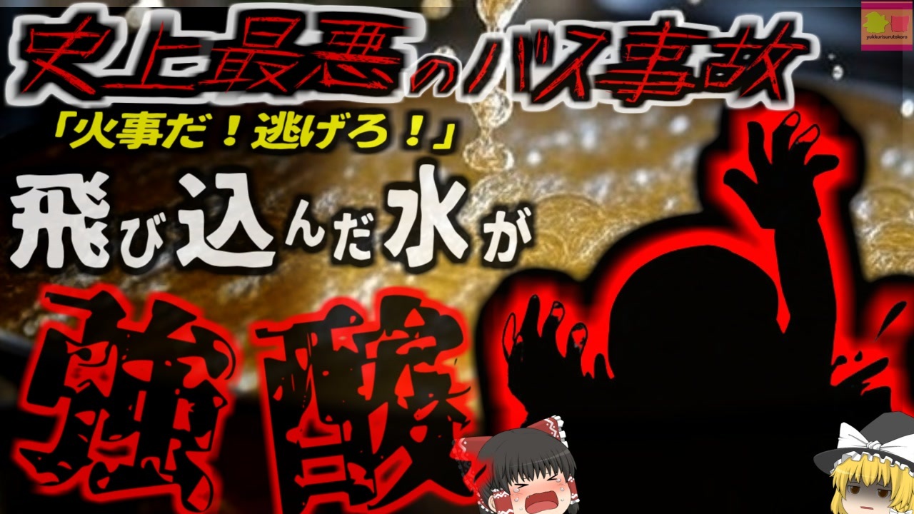 <a href="#" class="seekTime" data-seekTime="00:11" onclick="seekNicoPlayer('#00:11'); return false;">#00:11</a> 視聴上の注意<br><a href="#" class="seekTime" data-seekTime="00:52" onclick="seekNicoPlayer('#00:52'); return false;">#00:52</a> 本編開始<br><a href="#" class="seekTime" data-seekTime="1:19" onclick="seekNicoPlayer('#1:19'); return false;">#1:19</a> 午前3時過ぎにタンクローリーに追突<br><a href="#" class="seekTime" data-seekTime="1:53" onclick="seekNicoPlayer('#1:53'); return false;">#1:53</a> パニックになり外へ<br><a href="#" class="seekTime" data-seekTime="2:41" onclick="seekNicoPlayer('#2:41'); return false;">#2:41</a> 火傷などで火災を恐れ水たまりに…<br><a href="#" class="seekTime" data-seekTime="3:37" onclick="seekNicoPlayer('#3:37'); return false;">#3:37</a> 飛び込んだ人々が次々に溶けていく<br><a href="#" class="seekTime" data-seekTime="4:13" onclick="seekNicoPlayer('#4:13'); return false;">#4:13</a> 「硝酸」とは<br><a href="#" class="seekTime" data-seekTime="4:50" onclick="seekNicoPlayer('#4:50'); return false;">#4:50</a> 硝酸が体に触れるとどうなる?<br><a href="#" class="seekTime" data-seekTime="6:03" onclick="seekNicoPlayer('#6:03'); return false;">#6:03</a> 何故気が付けなかったのか<br><a href="#" class="seekTime" data-seekTime="7:30" onclick="seekNicoPlayer('#7:30'); return false;">#7:30</a> 水の中で亡くなった人はほぼ原形が無かった<br><a href="#" class="seekTime" data-seekTime="8:21" onclick="seekNicoPlayer('#8:21'); return false;">#8:21</a> 「史上最悪のバス事故」<br><br><br>引用・出展・参考文献(視聴者提供資料など<br>Wikipedia 1965 Hendek bus accident<br><a href="https://x.gd/elQAt" target="_blank" rel="noopener nofollow">https://x.gd/elQAt</a><br>Milliye<br><a href="https://x.gd/utNxc" target="_blank" rel="noopener nofollow">https://x.gd/utNxc</a><br><br><br><br><br><br />※この動画は過去の事件を知り、現在でも同じことが発生する危険性を再認識、関与しないように促すための動画であり、視聴者を扇動、動揺を誘うためのコンテンツではありません。<br><br>ご要望にお応えして、メンバーシップの開設を行いました。<br>下記URLからも登録可能ですので、ご興味がある方は是非ご参加ください。<br><a href="https://www.youtube.com/channel/UCcT5a1J7XJW7CLYI2RKl4pw/join" target="_blank" rel="noopener nofollow">https://www.youtube.com/channel/UCcT5a1J7XJW7CLYI2RKl4pw/join</a><br><br><br>Twitter<br>→<a href="https://twitter.com/yukkurisurutoko" target="_blank" rel="noopener nofollow">https://twitter.com/yukkurisurutoko</a><br><br>取り急ぎ、簡易的にですがマイリストを作りました。<br>【ゆっくり解説】事故・事件関係紹介リスト <br><a href="https://www.nicovideo.jp/mylist/71034319" target="_blank" rel="noopener nofollow">https://www.nicovideo.jp/mylist/71034319</a><br>【ゆっくり解説】放射線系事故<br><a href="https://www.nicovideo.jp/mylist/71034368" target="_blank" rel="noopener nofollow">https://www.nicovideo.jp/mylist/71034368</a><br>【ゆっくり解説】鉄道系事故・事件関連<br><a href="https://www.nicovideo.jp/mylist/71034379" target="_blank" rel="noopener nofollow">https://www.nicovideo.jp/mylist/71034379</a>