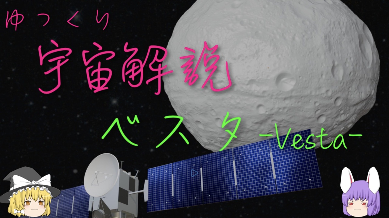 今回は小惑星ベスタ(4 Vesta)です。<br>四大小惑星の一つで、私達地球に住んでいる者にとっても馴染みのある天体です。<br>動画中、文字が小さい部分が御座いますので、できるだけ大きな画面でご覧いただくことを推奨いたします。<br><br>Vestaの地図が見切れ案配&文字小さいので、静画にうpしてみました。<br><a href="https://seiga.nicovideo.jp/seiga/im11638510" target="_blank" rel="noopener nofollow">https://seiga.nicovideo.jp/seiga/im11638510</a><br><br>スペクトル型に関しては、以前投稿した<br>「ゆっくり宇宙解説 小惑星」<br><a href="https://www.nicovideo.jp/watch/sm44559066" target="_blank" rel="noopener nofollow">https://www.nicovideo.jp/watch/sm44559066</a><br>をご覧ください。<br><br>また、私の投稿した他の動画は”シリーズ”からご覧下さい。<br><br>コンテンツをお借りしたすべての方に、心より感謝申し上げます。<br><br>なお、クレジット表記のない「探査機Dawn」の3Dモデルは自作です。<br>また、Vestaの3Dモデルは一般公開されている標高データを元に作成いたしました。<br>