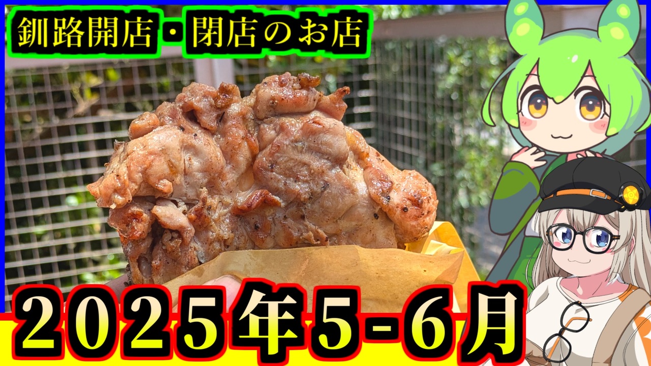 釧路で2025年5・6月に開店閉店するお店の一覧です<br>数店は実際に行ってみました<br><br>開店閉店情報は随時募集していますので<br>Xのプロフ欄にあるマシュマロからお願いいたします<br><br>●音声ソフト VOICEVOX:ずんだもん<br>●X @acerola_vitamin <br><br /><span style="color: #ff0000; font-size: 24px;"><strong>釧路を紹介するブログ始めました</strong></span>:<a href="https://946de2100.com" target="_blank" rel="noopener nofollow">https://946de2100.com</a><br><br><span style="color: #ff0000; font-size: 16px;"><strong>●おススメ動画:</strong></span><span style="color: #ff0000; font-size: 18px;"><strong>【歴史解説】かつて 釧路を支配していたのは佐賀だった ~釧路元町の始まりと佐野孫右衛門の盛衰~</strong></span><br><br><a href="https://www.nicovideo.jp/watch/sm44267722" class="watch">sm44267722</a><br><br><br><span style="color: #ff0000; font-size: 18px;"><strong>●YouTubeチャンネルも登録よろしくお願いします</strong></span><br><strong>釧路チャンネル <a href="https://www.youtube.com/@znd-kaisetu" target="_blank" rel="noopener nofollow">https://www.youtube.com/@znd-kaisetu</a></strong><br>恋結シラリカソロチャンネル <a href="https://www.youtube.com/@enmusubi-shirarika" target="_blank" rel="noopener nofollow">https://www.youtube.com/@enmusubi-shirarika</a><br><br><br>ほしいものリスト <a href="https://www.amazon.jp/hz/wishlist/ls/2OUUB1JQSRUWG?ref_=wl_share" target="_blank" rel="noopener nofollow">https://www.amazon.jp/hz/wishlist/ls/2OUUB1JQSRUWG?ref_=wl_share</a><br>クリエイターサポート<a href="https://creator-support.nicovideo.jp/registration/116665199" target="_blank" rel="noopener nofollow">https://creator-support.nicovideo.jp/registration/116665199</a>