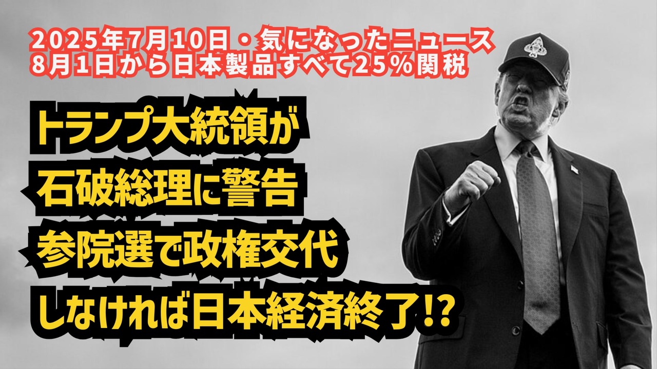 【8月1日から日本製品すべて25%関税】◆トランプ大統領が石破総理に警告…参院選で政権交代しなければ“日本経済終了”!?<a href="https://x.com/DrTomabechi/status/1942384254887027061?t=o63sRqdEKbz_OxNrqmIEnA&s=19" target="_blank" rel="noopener nofollow">https://x.com/DrTomabechi/status/1942384254887027061?t=o63sRqdEKbz_OxNrqmIEnA&s=19</a><br><br><br>◆今回の台本<a href="https://keiichiro8140.hatenablog.com/entry/20250710111" target="_blank" rel="noopener nofollow">https://keiichiro8140.hatenablog.com/entry/20250710111</a><br><br><br>◆YouTubeチャンネル登録よろしくお願いします<a href="https://youtube.com/@k16_888?si=1S8pLN1Tf9bGiJyV" target="_blank" rel="noopener nofollow">https://youtube.com/@k16_888?si=1S8pLN1Tf9bGiJyV</a><br><br><br>◆もしも(BAN)の時のためのマイリンク集<a href="https://lit.link/K16_888" target="_blank" rel="noopener nofollow">https://lit.link/K16_888</a><br><br><br>気になったニュース 2025/7/10<br><br><br />著作権、肖像権に配慮して作成しております。<br><br>◆気になったニュースの台本!?<br>メモ代わりに作った台本をそのままあげてます<br><a href="https://keiichiro8140.hatenablog.com/." target="_blank" rel="noopener nofollow">https://keiichiro8140.hatenablog.com/.</a><br><br><br>ここからはシリーズ紹介<br><br><br>◆ ワクチン解毒・デトックス<br><a href="https://x.gd/fZweg" target="_blank" rel="noopener nofollow">https://x.gd/fZweg</a><br><br>◆ウイリアム・マキス博士のがん治療(イベルメクチン・フェンベンダゾール等)<br><a href="https://x.gd/AtFYS" target="_blank" rel="noopener nofollow">https://x.gd/AtFYS</a><br><br>◆予防接種健康被害救済制度<br><a href="https://x.gd/0xK9x" target="_blank" rel="noopener nofollow">https://x.gd/0xK9x</a><br><br>◆気になったニュース #1501~<br><br>◆ 【ショートver】気になったニュース<br><a href="https://x.gd/7MxXC" target="_blank" rel="noopener nofollow">https://x.gd/7MxXC</a><br><br>◆ 気になったニュース #1001~<br><a href="https://x.gd/Lp8gv" target="_blank" rel="noopener nofollow">https://x.gd/Lp8gv</a><br><br>◆ 気になったニュース #501~<br><a href="https://x.gd/EmbS4" target="_blank" rel="noopener nofollow">https://x.gd/EmbS4</a><br><br>◆ 気になったニュース #1~#500<br><a href="https://x.gd/uPhNb" target="_blank" rel="noopener nofollow">https://x.gd/uPhNb</a><br><br>◆ X(旧Twitter)・テレグラムで気になった情報<br><a href="https://x.gd/YG6FT" target="_blank" rel="noopener nofollow">https://x.gd/YG6FT</a><br><br>◆ 日比谷5万人パレードデ⚪生放送アーカイブ動画<br><a href="https://x.gd/3CHJv" target="_blank" rel="noopener nofollow">https://x.gd/3CHJv</a><br><br>◆日比谷5万人パレード⚪モのマイリスト作ってみました<br><a href="https://nico.ms/mylist/76828848?ref=sp_other" target="_blank" rel="noopener nofollow">https://nico.ms/mylist/76828848?ref=sp_other</a><br><br>◆3.30 令和の百姓⚪⚪<br><a href="https://www.nicovideo.jp/series/511791?ref=garage_share_other" target="_blank" rel="noopener nofollow">https://www.nicovideo.jp/series/511791?ref=garage_share_other</a><br><br>◆ 及川幸久さんの【XNEWS】シリーズ<br><a href="https://x.gd/3k78K" target="_blank" rel="noopener nofollow">https://x.gd/3k78K</a><br><br>◆これまでの動画<a href="https://x.gd/sPXoJ" target="_blank" rel="noopener nofollow">https://x.gd/sPXoJ</a><br><br>◆もしも(BAN)の時のためのマイリンク集<a href="https://lit.link/K-16_News44" target="_blank" rel="noopener nofollow">https://lit.link/K-16_News44</a><br><br>