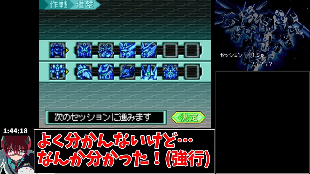 <span style="color: #ff0000; font-size: 18px;">”いつかまた宇宙世紀ルートや平成ガンダムルートも走ってみたい”って、ガンダムが言ってる</span><br>最後までご視聴ありがとうございました!<br><br>レギュレーション:<br>全隠しキャラを仲間にし、<br>ライバルルートのセッション11SPをクリアする<br> (通常エンディングまで、また隠しキャラ加入なのでターンX入手は含めない) <br>禁止事項:<br>開発図100%特典は使用しない<br><br>プレイ環境:New3DSLL<br>計測開始:スペシャルゲームを選択したとき<br>計測終了:エンディング後、セーブを完了した瞬間<br><br>前→<a href="https://www.nicovideo.jp/watch/sm45111802" class="watch">sm45111802</a><br><br>今まで走ったRTA集→<a href="https://www.nicovideo.jp/mylist/77266341" target="_blank" rel="noopener">mylist/77266341</a><br><br>X(Twitter)→ <a href="https://twitter.com/gunokiwami3" target="_blank" rel="noopener nofollow">https://twitter.com/gunokiwami3</a>