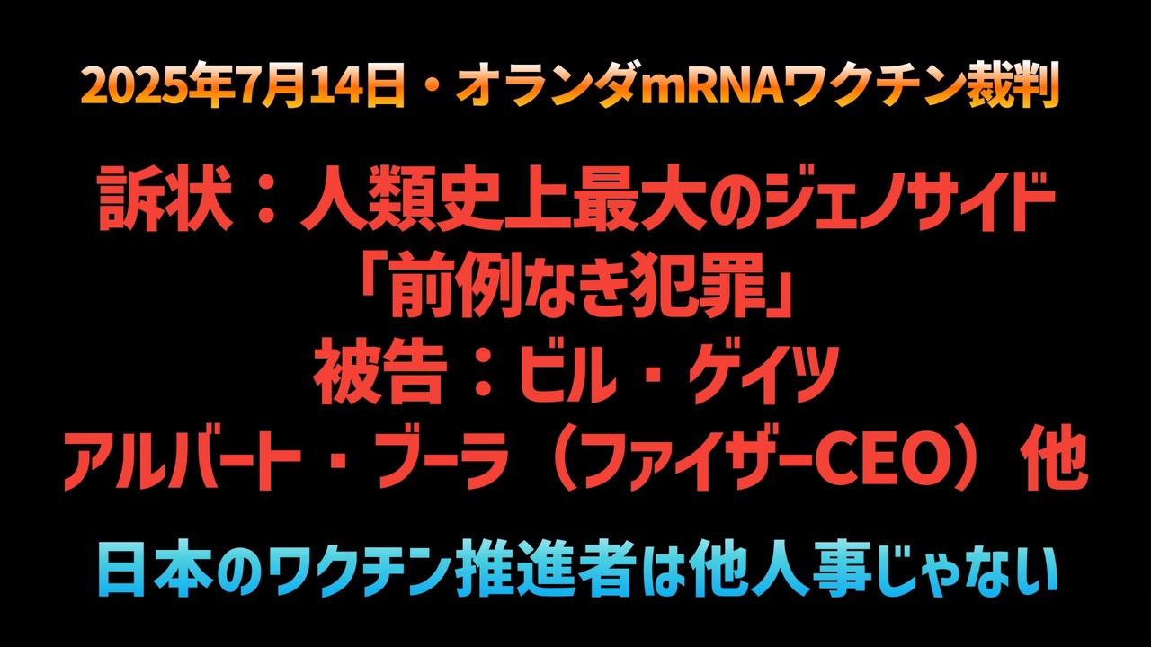 【オランダmRNAワクチン裁判】◆訴状:人類史上最大のジェノサイド「前例なき犯罪」被告:ビル・ゲイツ アルバート・ブーラ(ファイザーCEO) 他【日本のワクチン推進者は他人事じゃない】<br><a href="https://x.com/newstart_2024/status/1944296199462269004?t=cmVbwJeMUEKxbsQ15_KoPA&s=19" target="_blank" rel="noopener nofollow">https://x.com/newstart_2024/status/1944296199462269004?t=cmVbwJeMUEKxbsQ15_KoPA&s=19</a><br><br><br>◆今回の台本<a href="https://keiichiro8140.hatenablog.com/entry/20250714444" target="_blank" rel="noopener nofollow">https://keiichiro8140.hatenablog.com/entry/20250714444</a><br><br><br>◆YouTubeチャンネル登録よろしくお願いします<a href="https://youtube.com/@k16_888?si=1S8pLN1Tf9bGiJyV" target="_blank" rel="noopener nofollow">https://youtube.com/@k16_888?si=1S8pLN1Tf9bGiJyV</a><br><br><br>◆もしも(BAN)の時のためのマイリンク集<a href="https://lit.link/K16_888" target="_blank" rel="noopener nofollow">https://lit.link/K16_888</a><br><br><br>気になったニュース 2025/7/14<br><br><br />著作権、肖像権に配慮して作成しております。<br><br>◆気になったニュースの台本!?<br>メモ代わりに作った台本をそのままあげてます<br><a href="https://keiichiro8140.hatenablog.com/." target="_blank" rel="noopener nofollow">https://keiichiro8140.hatenablog.com/.</a><br><br><br>ここからはシリーズ紹介<br><br><br>◆ ワクチン解毒・デトックス<br><a href="https://x.gd/fZweg" target="_blank" rel="noopener nofollow">https://x.gd/fZweg</a><br><br>◆ウイリアム・マキス博士のがん治療(イベルメクチン・フェンベンダゾール等)<br><a href="https://x.gd/AtFYS" target="_blank" rel="noopener nofollow">https://x.gd/AtFYS</a><br><br>◆予防接種健康被害救済制度<br><a href="https://x.gd/0xK9x" target="_blank" rel="noopener nofollow">https://x.gd/0xK9x</a><br><br>◆気になったニュース #1501~<br><br>◆ 【ショートver】気になったニュース<br><a href="https://x.gd/7MxXC" target="_blank" rel="noopener nofollow">https://x.gd/7MxXC</a><br><br>◆ 気になったニュース #1001~<br><a href="https://x.gd/Lp8gv" target="_blank" rel="noopener nofollow">https://x.gd/Lp8gv</a><br><br>◆ 気になったニュース #501~<br><a href="https://x.gd/EmbS4" target="_blank" rel="noopener nofollow">https://x.gd/EmbS4</a><br><br>◆ 気になったニュース #1~#500<br><a href="https://x.gd/uPhNb" target="_blank" rel="noopener nofollow">https://x.gd/uPhNb</a><br><br>◆ X(旧Twitter)・テレグラムで気になった情報<br><a href="https://x.gd/YG6FT" target="_blank" rel="noopener nofollow">https://x.gd/YG6FT</a><br><br>◆ 日比谷5万人パレードデ⚪生放送アーカイブ動画<br><a href="https://x.gd/3CHJv" target="_blank" rel="noopener nofollow">https://x.gd/3CHJv</a><br><br>◆日比谷5万人パレード⚪モのマイリスト作ってみました<br><a href="https://nico.ms/mylist/76828848?ref=sp_other" target="_blank" rel="noopener nofollow">https://nico.ms/mylist/76828848?ref=sp_other</a><br><br>◆3.30 令和の百姓⚪⚪<br><a href="https://www.nicovideo.jp/series/511791?ref=garage_share_other" target="_blank" rel="noopener nofollow">https://www.nicovideo.jp/series/511791?ref=garage_share_other</a><br><br>◆ 及川幸久さんの【XNEWS】シリーズ<br><a href="https://x.gd/3k78K" target="_blank" rel="noopener nofollow">https://x.gd/3k78K</a><br><br>◆これまでの動画<a href="https://x.gd/sPXoJ" target="_blank" rel="noopener nofollow">https://x.gd/sPXoJ</a><br><br>◆もしも(BAN)の時のためのマイリンク集<a href="https://lit.link/K-16_News44" target="_blank" rel="noopener nofollow">https://lit.link/K-16_News44</a><br><br>