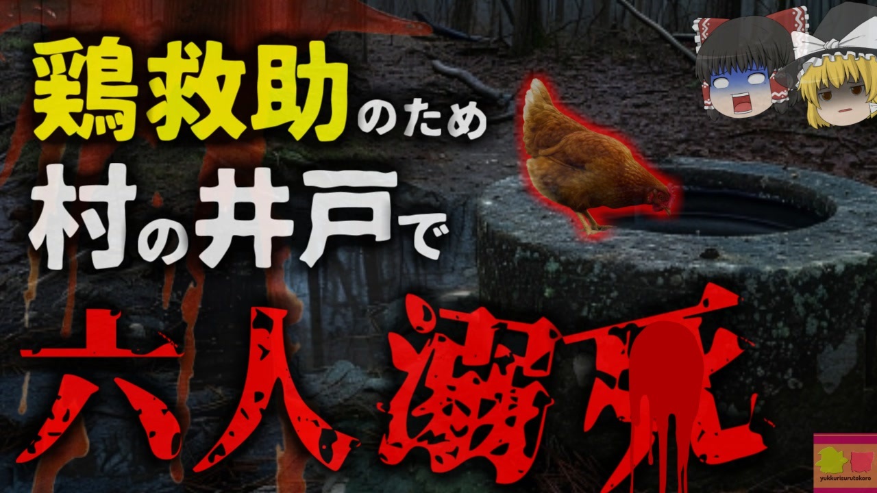 <a href="#" class="seekTime" data-seekTime="00:11" onclick="seekNicoPlayer('#00:11'); return false;">#00:11</a> 珍しい事故<br><a href="#" class="seekTime" data-seekTime="00:50" onclick="seekNicoPlayer('#00:50'); return false;">#00:50</a> 特殊な井戸<br><a href="#" class="seekTime" data-seekTime="1:20" onclick="seekNicoPlayer('#1:20'); return false;">#1:20</a> 底部に強い水流が<br><a href="#" class="seekTime" data-seekTime="1:44" onclick="seekNicoPlayer('#1:44'); return false;">#1:44</a> きっかけは「一羽の鶏」<br><a href="#" class="seekTime" data-seekTime="2:42" onclick="seekNicoPlayer('#2:42'); return false;">#2:42</a> アンダーカレントに足をすくわれ・・・<br><a href="#" class="seekTime" data-seekTime="3:23" onclick="seekNicoPlayer('#3:23'); return false;">#3:23</a> 少なくとも1.5mの水深<br><a href="#" class="seekTime" data-seekTime="4:22" onclick="seekNicoPlayer('#4:22'); return false;">#4:22</a> 連続して6人もの犠牲が…<br><a href="#" class="seekTime" data-seekTime="4:51" onclick="seekNicoPlayer('#4:51'); return false;">#4:51</a> 被害拡大の背景<br><a href="#" class="seekTime" data-seekTime="6:30" onclick="seekNicoPlayer('#6:30'); return false;">#6:30</a> 皮肉なことに鶏だけが…<br><a href="#" class="seekTime" data-seekTime="7:04" onclick="seekNicoPlayer('#7:04'); return false;">#7:04</a> 農村部でもインフラ整備へ<br><a href="#" class="seekTime" data-seekTime="8:17" onclick="seekNicoPlayer('#8:17'); return false;">#8:17</a> 日本でも溺水は多い<br><br><br>引用・出展・参考文献(視聴者提供資料など<br>Weird Universe<br><a href="https://x.gd/xX3Yp" target="_blank" rel="noopener nofollow">https://x.gd/xX3Yp</a><br>Makhad Trust<br><a href="https://x.gd/UbL1V" target="_blank" rel="noopener nofollow">https://x.gd/UbL1V</a><br>baltimoresun.com<br><a href="https://x.gd/7VvfN" target="_blank" rel="noopener nofollow">https://x.gd/7VvfN</a><br><br><br />※この動画は過去の事件を知り、現在でも同じことが発生する危険性を再認識、関与しないように促すための動画であり、視聴者を扇動、動揺を誘うためのコンテンツではありません。<br><br>ご要望にお応えして、メンバーシップの開設を行いました。<br>下記URLからも登録可能ですので、ご興味がある方は是非ご参加ください。<br><a href="https://www.youtube.com/channel/UCcT5a1J7XJW7CLYI2RKl4pw/join" target="_blank" rel="noopener nofollow">https://www.youtube.com/channel/UCcT5a1J7XJW7CLYI2RKl4pw/join</a><br><br><br>Twitter<br>→<a href="https://twitter.com/yukkurisurutoko" target="_blank" rel="noopener nofollow">https://twitter.com/yukkurisurutoko</a><br><br>取り急ぎ、簡易的にですがマイリストを作りました。<br>【ゆっくり解説】事故・事件関係紹介リスト <br><a href="https://www.nicovideo.jp/mylist/71034319" target="_blank" rel="noopener nofollow">https://www.nicovideo.jp/mylist/71034319</a><br>【ゆっくり解説】放射線系事故<br><a href="https://www.nicovideo.jp/mylist/71034368" target="_blank" rel="noopener nofollow">https://www.nicovideo.jp/mylist/71034368</a><br>【ゆっくり解説】鉄道系事故・事件関連<br><a href="https://www.nicovideo.jp/mylist/71034379" target="_blank" rel="noopener nofollow">https://www.nicovideo.jp/mylist/71034379</a>