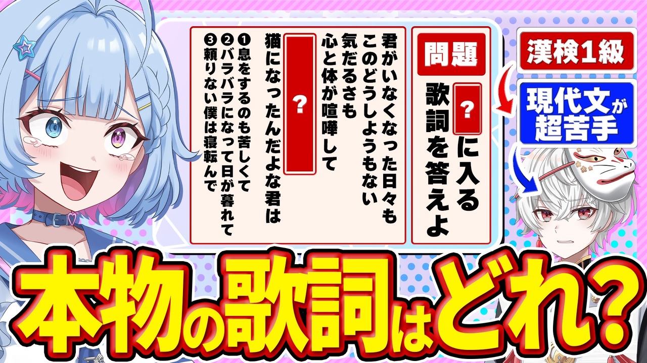 漢字と日本語の能力が高ければ超有名J-POPの歌詞って復元できる?<br>芸能ジャンルがとっても弱い同期に問題出してみた!<br><br>企画協力:森慎太郎 ( <a href="https://x.com/Mori_QK" target="_blank" rel="noopener nofollow">https://x.com/Mori_QK</a> )<br><br>✧┈┈┈┈┈┈┈┈┈┈┈┈┈┈┈┈┈┈┈┈┈┈✧ <br><br>おはようございま〜す!<br>みーんなの生徒会長♡てらめたる学園の夢川夢だよ!<br><br>きみと仲良くなりたくて<br>二次元の世界にデビューしたってワケ。<br>僕と一緒に遊んでくれる?<br><br>✧┈┈┈┈┈┈┈┈┈┈┈┈┈┈┈┈┈┈┈┈┈┈✧ <br><br>【夢川夢】<br>公式X:<a href="https://x.com/YumekawaYume25" target="_blank" rel="noopener nofollow">https://x.com/YumekawaYume25</a><br><br>【てらめたる学園】<br>公式HP: terametaru.com/<br>公式YouTube:<a href="https://www.youtube.com/@terametaru" target="_blank" rel="noopener nofollow">https://www.youtube.com/@terametaru</a><br>公式X:<a href="https://x.com/terametaru" target="_blank" rel="noopener nofollow">https://x.com/terametaru</a><br>お問い合わせ: info@terametaru.com<br><br>【ファンレター・プレゼントの送付先】<br>GROVE株式会社<br>〒106-6131<br>東京都港区六本木6-10-1 六本木ヒルズ森タワー31階<br>てらめたる学園 夢川夢宛<br><br>お手紙くれたらとっても嬉しいよ。<br>でも送る前にこれを見てもらいたいな!<br>いつもありがとう♡↓<br><a href="https://terametaru.com/news/8/" target="_blank" rel="noopener nofollow">https://terametaru.com/news/8/</a><br><br>【未成年者の視聴者の方々は、下記リンク先の注意事項もご覧ください】<br><a href="https://terametaru.com/for-minors/" target="_blank" rel="noopener nofollow">https://terametaru.com/for-minors/</a>