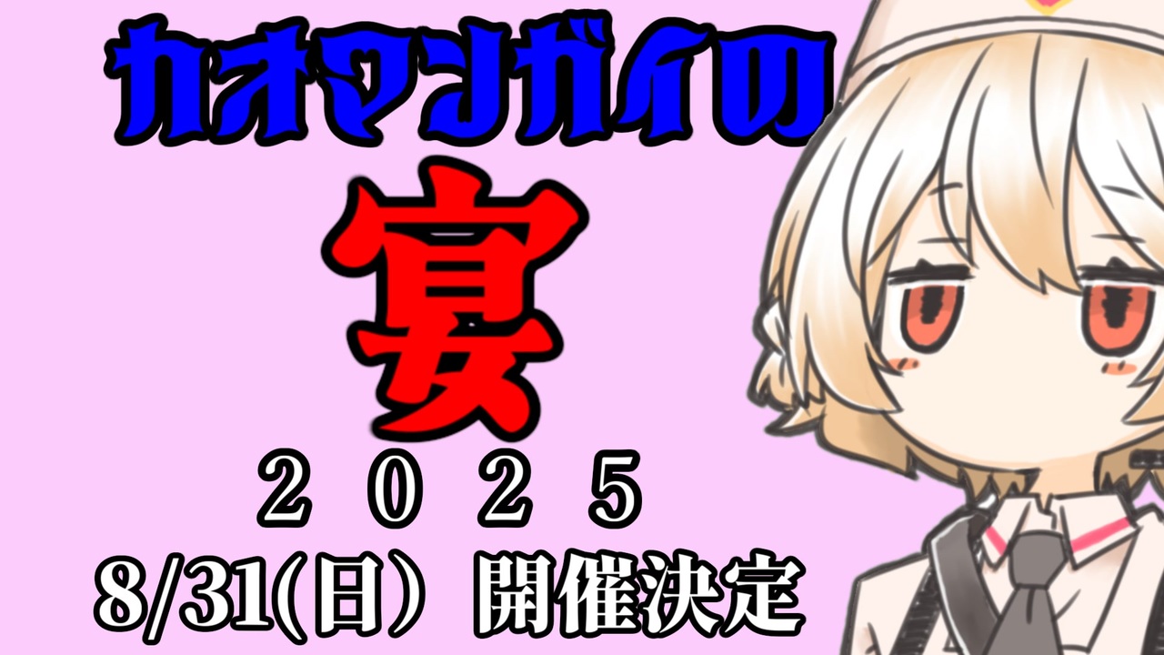 夏のおわり、みんなでニコニコ動画をカオマンガイで染め上げよう!!<br>主催 物体B<br>運営補佐 山上りすこさん<br><br>VOICEVOX:ナースロボ_タイプT<br>ナースロボ立ち絵:大宮祝詞さま <a href="https://seiga.nicovideo.jp/seiga/im11185199" target="_blank" rel="noopener">im11185199</a><br><br>特に記載がない場合、音楽・SEなどは自作してます。<br>【楽曲配布】<br><span style="color: #ff0000;"><strong>※現在IDから直接コモンズに飛べない状況です(原因わからん…すいません)<br> お手数ですがDLされる方はニコニコモンズから楽曲名で検索してください。</strong></span><br><span style="color: #ff0000;"> (あと原因わかる人いたら教えてください…)</span><br>でんでらりゅうばテクノ <a href="https://commons.nicovideo.jp/works/nc419905" target="_blank" rel="noopener">nc419905</a>【※この動画で使用しているもの】<br>でんでらりゅうばテクノ(ゆっくり) <a href="https://commons.nicovideo.jp/works/nc419909" target="_blank" rel="noopener">nc419909</a><br>でんでらりゅうばテクノ(ロングバージョン・作業用) <a href="https://commons.nicovideo.jp/works/nc419906" target="_blank" rel="noopener">nc419906</a><br>てぃんさぐぬ花テクノ <a href="https://commons.nicovideo.jp/works/nc420864" target="_blank" rel="noopener">nc420864</a><br>(旧バージョンも使ってもらって大丈夫ですが、親作品登録は上のIDへお願いします)<br>親作品登録は任意です。してくれたら見に行けるので嬉しいです。<br><br>お借りしている素材やコンテンツの扱いにはじゅうぶん気をつけているつもりですが<br>親作品登録の漏れなどありましたら動画内コメントか<br>X(@buttaixxx)にてご指摘いただけますと幸いです。<br><br><a target="_blank" href="https://qa.nicovideo.jp/faq/show/19424?site_domain=default" style="font-size: 13px;color: #657586; text-decoration: underline; line-height: 1.4">この動画は投稿者によって修正されました</a>