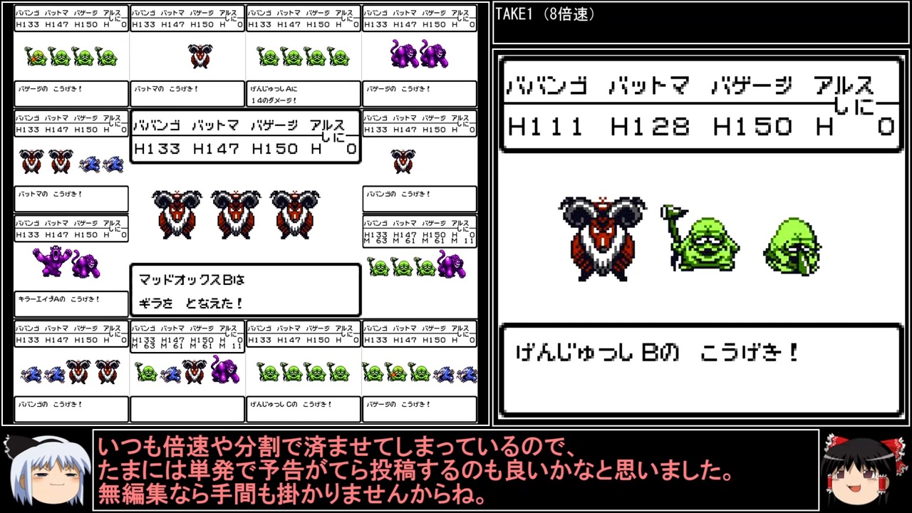 DQⅢの3周目、GBCDQⅢ編part4です。<br>分配計画を考えた時の自分が「まあエンカ運次第だしいけるでしょ」と判断するとこうなります。<br>そしてお気づきだろうか……この動画、昨日のスライムつむりとの戦闘時間より短いんですよ。<br><br>作業用スライムつむり→<a href="https://www.nicovideo.jp/watch/sm45180210" class="watch">sm45180210</a><br>前→<a href="https://www.nicovideo.jp/watch/sm45172217" class="watch">sm45172217</a><br>次→<a href="https://www.nicovideo.jp/watch/sm45221773" class="watch">sm45221773</a><br><br>YouTube版→<a href="https://youtu.be/qgD_i-jBkzo" target="_blank" rel="noopener nofollow">https://youtu.be/qgD_i-jBkzo</a><br><br>縛りルール(詳細はpart1参照)<br>①一度使った武器・防具・装飾品・道具・呪文・特技は<br> 次作品以降使用禁止。(売却も解禁扱い)<br><br> 一度使った職業(3,6,7)・仲間モンスター(5,6)・スカウトモンスター(8)は<br> 戦士(Ⅲ)、戦士(Ⅵ)のようにナンバリングで分類し次作品以降使用禁止。<br> また複数体加入できる仲間モンスターは一体まで。<br><br>②裏技、バグ技、全滅、逃走、おどかす禁止。<br> またダンジョン攻略とボス戦における状況再現禁止。<br><br>③ダンジョンとボス攻略は、全キャラのレベルを突入時、<br> 1周目は目標レベル+5。2周目は+10。3周目は+15まで。<br> ラスボスの目標レベルは45。裏ボスは50とする。<br>(目標レベルは各公式ガイドブックを参照)<br><br>④1周目はEDまで。2周目は裏ボス撃破まで。<br> 3周目は全てのボスを規定回数、規定ターン以内に倒す。<br>(回避可能なボスも倒し、闇ゾーマは3周全てで倒す)<br><br><br><span style="color: #262626;">※一部機種は互換機を使用してのプレイとなりますが、倍速機能やクイックセーブ・ロード、チートなどは一切使用しません。</span><br><br>※ネタバレ注意です<br><br>この動画で利用している株式会社スクウェア・エニックスを代表とする共同著作者が権利を所有する著作物及びスギヤマ工房有限会社が権利を所有する楽曲の転載・配布は禁止いたします。<br>(C) ARMOR PROJECT/BIRD STUDIO/SQUARE ENIX All Rights Reserved.<br>(C) SUGIYAMA KOBO (P) SUGIYAMA KOBO<br><br>AquesTalk2ライセンスID:AQTK2WINUSR23122185<br /><br><br>❤いいねを押していただけるとモチベーションと投稿速度が上がるので宜しくお願い致します!<br><br>作者ツイッター→ <a href="https://twitter.com/nig0117" target="_blank" rel="noopener nofollow">https://twitter.com/nig0117</a><br>PIXIV FANBOX→ <a href="https://sutanokeiji.fanbox.cc/" target="_blank" rel="noopener nofollow">https://sutanokeiji.fanbox.cc/</a><br><br>( 以前はWEB小説書いてました→ <a href="https://kakuyomu.jp/works/1177354054884910267" target="_blank" rel="noopener nofollow">https://kakuyomu.jp/works/1177354054884910267</a> )