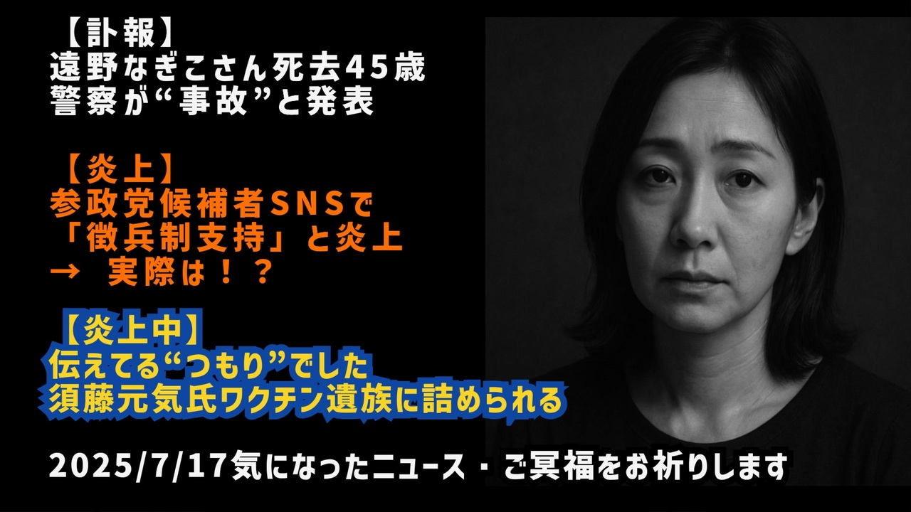 大人の事情でイメージ画像で失礼します<br>遠野なぎこさん歳近い<br>ご冥福をお祈りします🙏<br><br>【訃報】◆遠野なぎこさん死去45歳 警察が“事故”と発表<a href="https://x.gd/ZET6N" target="_blank" rel="noopener nofollow">https://x.gd/ZET6N</a><br><br><br>◆参政党候補者SNSで「徴兵制支持」と炎上 → 実際は!?<a href="https://x.com/Japangard/status/1945655908304122331?t=qTgr8f985YWCkCxTo7t2_w&s=19" target="_blank" rel="noopener nofollow">https://x.com/Japangard/status/1945655908304122331?t=qTgr8f985YWCkCxTo7t2_w&s=19</a><br><br><br>◆「伝えてる“つもり”でした」──須藤元気氏、ワクチン遺族に詰められる<a href="https://x.com/hellomitz3/status/1945662038023549064?t=vWKWW-JN9KtgMaphuL-fhA&s=19" target="_blank" rel="noopener nofollow">https://x.com/hellomitz3/status/1945662038023549064?t=vWKWW-JN9KtgMaphuL-fhA&s=19</a><br><br><br>◆今回の台本<a href="https://keiichiro8140.hatenablog.com/entry/20250717777999" target="_blank" rel="noopener nofollow">https://keiichiro8140.hatenablog.com/entry/20250717777999</a><br><br><br>◆YouTubeチャンネル登録よろしくお願いします<a href="https://youtube.com/@k16_888?si=1S8pLN1Tf9bGiJyV" target="_blank" rel="noopener nofollow">https://youtube.com/@k16_888?si=1S8pLN1Tf9bGiJyV</a><br><br><br>◆もしも(BAN)の時のためのマイリンク集<a href="https://lit.link/K16_888" target="_blank" rel="noopener nofollow">https://lit.link/K16_888</a><br><br><br>気になったニュース 2025/7/17<br><br><br />著作権、肖像権に配慮して作成しております。<br><br>◆気になったニュースの台本!?<br>メモ代わりに作った台本をそのままあげてます<br><a href="https://keiichiro8140.hatenablog.com/." target="_blank" rel="noopener nofollow">https://keiichiro8140.hatenablog.com/.</a><br><br><br>ここからはシリーズ紹介<br><br><br>◆ ワクチン解毒・デトックス<br><a href="https://x.gd/fZweg" target="_blank" rel="noopener nofollow">https://x.gd/fZweg</a><br><br>◆ウイリアム・マキス博士のがん治療(イベルメクチン・フェンベンダゾール等)<br><a href="https://x.gd/AtFYS" target="_blank" rel="noopener nofollow">https://x.gd/AtFYS</a><br><br>◆予防接種健康被害救済制度<br><a href="https://x.gd/0xK9x" target="_blank" rel="noopener nofollow">https://x.gd/0xK9x</a><br><br>◆気になったニュース #1501~<br><br>◆ 【ショートver】気になったニュース<br><a href="https://x.gd/7MxXC" target="_blank" rel="noopener nofollow">https://x.gd/7MxXC</a><br><br>◆ 気になったニュース #1001~<br><a href="https://x.gd/Lp8gv" target="_blank" rel="noopener nofollow">https://x.gd/Lp8gv</a><br><br>◆ 気になったニュース #501~<br><a href="https://x.gd/EmbS4" target="_blank" rel="noopener nofollow">https://x.gd/EmbS4</a><br><br>◆ 気になったニュース #1~#500<br><a href="https://x.gd/uPhNb" target="_blank" rel="noopener nofollow">https://x.gd/uPhNb</a><br><br>◆ X(旧Twitter)・テレグラムで気になった情報<br><a href="https://x.gd/YG6FT" target="_blank" rel="noopener nofollow">https://x.gd/YG6FT</a><br><br>◆ 日比谷5万人パレードデ⚪生放送アーカイブ動画<br><a href="https://x.gd/3CHJv" target="_blank" rel="noopener nofollow">https://x.gd/3CHJv</a><br><br>◆日比谷5万人パレード⚪モのマイリスト作ってみました<br><a href="https://nico.ms/mylist/76828848?ref=sp_other" target="_blank" rel="noopener nofollow">https://nico.ms/mylist/76828848?ref=sp_other</a><br><br>◆3.30 令和の百姓⚪⚪<br><a href="https://www.nicovideo.jp/series/511791?ref=garage_share_other" target="_blank" rel="noopener nofollow">https://www.nicovideo.jp/series/511791?ref=garage_share_other</a><br><br>◆ 及川幸久さんの【XNEWS】シリーズ<br><a href="https://x.gd/3k78K" target="_blank" rel="noopener nofollow">https://x.gd/3k78K</a><br><br>◆これまでの動画<a href="https://x.gd/sPXoJ" target="_blank" rel="noopener nofollow">https://x.gd/sPXoJ</a><br><br>◆もしも(BAN)の時のためのマイリンク集<a href="https://lit.link/K-16_News44" target="_blank" rel="noopener nofollow">https://lit.link/K-16_News44</a><br><br>