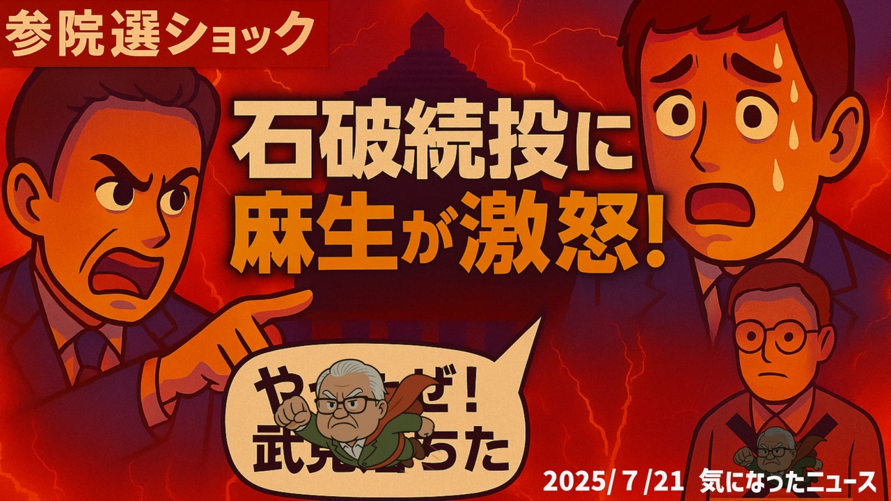 【歴史的大敗】参院選ショック!石破続投に麻生が激怒!【タケチャンマンジャンプは無しでお願いします】<br>武見さんお疲れ様でした<a href="https://x.com/wildriverpeace/status/1946891039190749579?t=s3cWK0dgR97vnjiVHHSl4w&s=19" target="_blank" rel="noopener nofollow">https://x.com/wildriverpeace/status/1946891039190749579?t=s3cWK0dgR97vnjiVHHSl4w&s=19</a><br><br><br>【参院選】麻生太郎氏「石破総理の続投 認めない」<a href="https://x.com/JmaxTopics/status/1946921305342873912?t=xGZjs7-E7WzlMuFvqol3cw&s=19" target="_blank" rel="noopener nofollow">https://x.com/JmaxTopics/status/1946921305342873912?t=xGZjs7-E7WzlMuFvqol3cw&s=19</a><br><br><br>◆今回の台本<a href="https://keiichiro8140.hatenablog.com/entry/20250721111" target="_blank" rel="noopener nofollow">https://keiichiro8140.hatenablog.com/entry/20250721111</a><br><br><br>◆YouTubeチャンネル登録よろしくお願いします<a href="https://youtube.com/@k16_888?si=1S8pLN1Tf9bGiJyV" target="_blank" rel="noopener nofollow">https://youtube.com/@k16_888?si=1S8pLN1Tf9bGiJyV</a><br><br><br>◆もしも(BAN)の時のためのマイリンク集<a href="https://lit.link/K16_888" target="_blank" rel="noopener nofollow">https://lit.link/K16_888</a><br><br><br>気になったニュース 2025/7/21<br><br><br />著作権、肖像権に配慮して作成しております。<br><br>◆気になったニュースの台本!?<br>メモ代わりに作った台本をそのままあげてます<br><a href="https://keiichiro8140.hatenablog.com/." target="_blank" rel="noopener nofollow">https://keiichiro8140.hatenablog.com/.</a><br><br><br>ここからはシリーズ紹介<br><br><br>◆ ワクチン解毒・デトックス<br><a href="https://x.gd/fZweg" target="_blank" rel="noopener nofollow">https://x.gd/fZweg</a><br><br>◆ウイリアム・マキス博士のがん治療(イベルメクチン・フェンベンダゾール等)<br><a href="https://x.gd/AtFYS" target="_blank" rel="noopener nofollow">https://x.gd/AtFYS</a><br><br>◆予防接種健康被害救済制度<br><a href="https://x.gd/0xK9x" target="_blank" rel="noopener nofollow">https://x.gd/0xK9x</a><br><br>◆気になったニュース #1501~<br><br>◆ 【ショートver】気になったニュース<br><a href="https://x.gd/7MxXC" target="_blank" rel="noopener nofollow">https://x.gd/7MxXC</a><br><br>◆ 気になったニュース #1001~<br><a href="https://x.gd/Lp8gv" target="_blank" rel="noopener nofollow">https://x.gd/Lp8gv</a><br><br>◆ 気になったニュース #501~<br><a href="https://x.gd/EmbS4" target="_blank" rel="noopener nofollow">https://x.gd/EmbS4</a><br><br>◆ 気になったニュース #1~#500<br><a href="https://x.gd/uPhNb" target="_blank" rel="noopener nofollow">https://x.gd/uPhNb</a><br><br>◆ X(旧Twitter)・テレグラムで気になった情報<br><a href="https://x.gd/YG6FT" target="_blank" rel="noopener nofollow">https://x.gd/YG6FT</a><br><br>◆ 日比谷5万人パレードデ⚪生放送アーカイブ動画<br><a href="https://x.gd/3CHJv" target="_blank" rel="noopener nofollow">https://x.gd/3CHJv</a><br><br>◆日比谷5万人パレード⚪モのマイリスト作ってみました<br><a href="https://nico.ms/mylist/76828848?ref=sp_other" target="_blank" rel="noopener nofollow">https://nico.ms/mylist/76828848?ref=sp_other</a><br><br>◆3.30 令和の百姓⚪⚪<br><a href="https://www.nicovideo.jp/series/511791?ref=garage_share_other" target="_blank" rel="noopener nofollow">https://www.nicovideo.jp/series/511791?ref=garage_share_other</a><br><br>◆ 及川幸久さんの【XNEWS】シリーズ<br><a href="https://x.gd/3k78K" target="_blank" rel="noopener nofollow">https://x.gd/3k78K</a><br><br>◆これまでの動画<a href="https://x.gd/sPXoJ" target="_blank" rel="noopener nofollow">https://x.gd/sPXoJ</a><br><br>◆もしも(BAN)の時のためのマイリンク集<a href="https://lit.link/K-16_News44" target="_blank" rel="noopener nofollow">https://lit.link/K-16_News44</a><br><br>