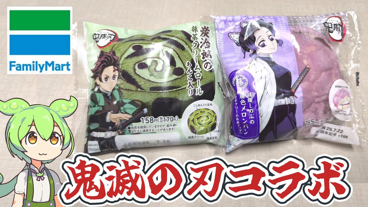 2025年7月18日より公開された「劇場版 鬼滅の刃 無限城編」を記念して<br>ファミリーマートでは、ファミマで炭治郎たちとひと休みと題し<br>コラボ商品が発売されています。<br>今回はクリームロールとメロンパンを買ってみました。<br><br><br><br>【参考】<br>ファミマで炭治郎とひと休み(ファミリーマート)<br><a href="https://www.family.co.jp/campaign/spot/2507_kimetsu_tabfmt/original.html" target="_blank" rel="noopener nofollow">https://www.family.co.jp/campaign/spot/2507_kimetsu_tabfmt/original.html</a><br>最終決戦に向けて、ファミマ×アニメ「鬼滅の刃」がコラボ<br>「ファミマで炭治郎たちとひと休み」キャンペーン2025.07.11(ファミリーマート)<br><a href="https://www.family.co.jp/company/news_releases/2025/20250711_01.html" target="_blank" rel="noopener nofollow">https://www.family.co.jp/company/news_releases/2025/20250711_01.html</a><br>料金・割引サービス表(TOHO CINEMAS)<br><a href="https://www.tohotheater.jp/theater/020/price.html" target="_blank" rel="noopener nofollow">https://www.tohotheater.jp/theater/020/price.html</a><br><br>【使用した素材】(※敬称略) <br>(合成音声)VOICEVOX/ずんだもん/四国めたん<br><a href="https://voicevox.hiroshiba.jp/" target="_blank" rel="noopener nofollow">https://voicevox.hiroshiba.jp/</a> <br>(立ち絵)坂本アヒル<br> <a href="https://seiga.nicovideo.jp/seiga/im10788496?track" target="_blank" rel="noopener nofollow">https://seiga.nicovideo.jp/seiga/im10788496?track</a><br>(楽曲)甘茶の音楽工房/「楽しい麦畑」「フルーツパフェ」「お城の舞踏会」<br><a href="https://amachamusic.chagasi.com/" target="_blank" rel="noopener nofollow">https://amachamusic.chagasi.com/</a>