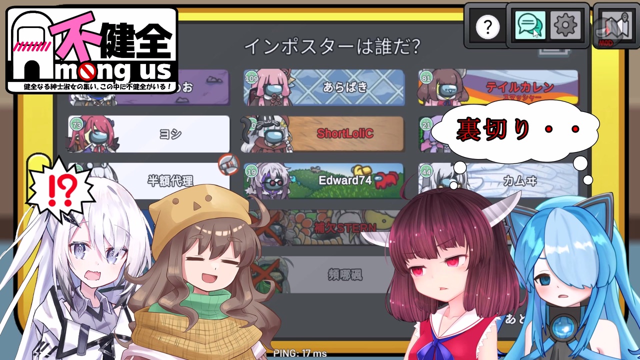 不健全鯖を間借りして開催した試合です<br>今回は怒濤の巻き返し、逆転が起こるなど手に汗握る展開がありました<br>そして偶然にも最終盤面にアモアス実況制作経験のあるプレイヤーが固まって残ったということで<br>「この試合それぞれの視点で動画化しようぜ!!」<br>ということで自分も作成しました<br><br>別視点で動画を作ってくれたカムヰさん、ShortLolicさん、半額さん<br>そして参加者の皆さん、ありがとうございました!!<br>とても良い思い出になりました<br><br>カムヰさん視点→【<a href="https://www.nicovideo.jp/watch/sm45217596" class="watch">sm45217596</a>】<br>ShortLolicさん視点→【<a href="https://www.nicovideo.jp/watch/sm45217418" class="watch">sm45217418</a>】<br>半額さん視点→【<a href="https://www.nicovideo.jp/watch/sm45757538" class="watch">sm45757538</a>】<br><br>これからも不健全鯖で定期的にExRを使ったAmong Usを開催していくのでよろしくお願いします<br><br>もし自分(テイルカレン)が開催するAmong Usに参加したい、動画出演したいと思ったら<br>Xのほうまで連絡お願いします<br>未経験でもMODの入れ方から役職の使い方まで丁寧に教えます<br>(X:@Tail_Karen)<br><br>使用MOD:Extremeroles with skins<br><br>参加者(敬称略)と代理キャラ<br>テイルカレン:東北きりたん<br>カムヰ:アリアル【<a href="https://www.nicovideo.jp/user/57585734" target="_blank" rel="noopener">user/57585734</a>】<br>ShortLolic:猫使ビィ【<a href="https://www.nicovideo.jp/user/119080367" target="_blank" rel="noopener">user/119080367</a>】<br>兎のあす:結月ゆかり【<a href="https://www.nicovideo.jp/user/4448412" target="_blank" rel="noopener">user/4448412</a>】<br>頻哪碸:東北ずん子【<a href="https://www.nicovideo.jp/user/131048811" target="_blank" rel="noopener">user/131048811</a>】<br>半額:栗田まろん【<a href="https://www.nicovideo.jp/user/123850576" target="_blank" rel="noopener">user/123850576</a>】<br>STREN:後鬼【<a href="https://www.nicovideo.jp/user/11205166" target="_blank" rel="noopener">user/11205166</a>】<br>nekosia:小夜【<a href="https://www.nicovideo.jp/user/98549556" target="_blank" rel="noopener">user/98549556</a>】<br>わさび:離途【<a href="https://www.nicovideo.jp/user/81753918" target="_blank" rel="noopener">user/81753918</a>】<br>Edward74:鳴花ミコト【<a href="https://www.nicovideo.jp/user/97517225" target="_blank" rel="noopener">user/97517225</a>】<br>ヴィア:四国めたん【<a href="https://www.nicovideo.jp/user/123783290" target="_blank" rel="noopener">user/123783290</a>】<br>ひいめお:紲星あかり【<a href="https://www.nicovideo.jp/user/80470864" target="_blank" rel="noopener">user/80470864</a>】<br>あらばき:琴葉茜【<a href="https://www.nicovideo.jp/user/13344003" target="_blank" rel="noopener">user/13344003</a>】<br>ヨシ:アルマちゃん【<a href="https://www.nicovideo.jp/user/21293027" target="_blank" rel="noopener">user/21293027</a>】<br><br>Voiced by <a href="https://CoeFont.cloud" target="_blank" rel="noopener nofollow">https://CoeFont.cloud</a> アリアル<br>VOICEVOX:猫使ビィ、後鬼、小夜、四国めたん