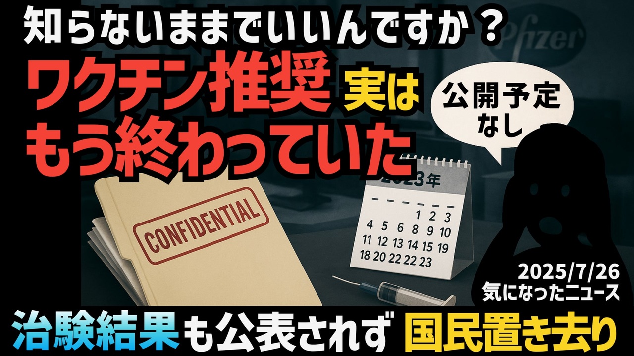 サムネに力入れてたら思いっきり遅れました┏○))<br><br>◆知らないままでいいんですか?ワクチン推奨、実はもう終わってた ~ 治験結果も公開されず…国民置き去り<a href="https://x.gd/y0EIr" target="_blank" rel="noopener nofollow">https://x.gd/y0EIr</a><br><br>◆今回の台本<a href="https://keiichiro8140.hatenablog.com/entry/20250726666111" target="_blank" rel="noopener nofollow">https://keiichiro8140.hatenablog.com/entry/20250726666111</a><br><br>◆YouTubeチャンネル登録よろしくお願いします<a href="https://youtube.com/@k16_888?si=1S8pLN1Tf9bGiJyV" target="_blank" rel="noopener nofollow">https://youtube.com/@k16_888?si=1S8pLN1Tf9bGiJyV</a><br><br>◆今回の動画<br><br>◆もしも(BAN)の時のためのマイリンク集<a href="https://lit.link/K16_888" target="_blank" rel="noopener nofollow">https://lit.link/K16_888</a><br><br><br>気になったニュース 2025/7/26<br><br><br />著作権、肖像権に配慮して作成しております。<br><br>◆気になったニュースの台本!?<br>メモ代わりに作った台本をそのままあげてます<br><a href="https://keiichiro8140.hatenablog.com/." target="_blank" rel="noopener nofollow">https://keiichiro8140.hatenablog.com/.</a><br><br><br>ここからはシリーズ紹介<br><br><br>◆ ワクチン解毒・デトックス<br><a href="https://x.gd/fZweg" target="_blank" rel="noopener nofollow">https://x.gd/fZweg</a><br><br>◆ウイリアム・マキス博士のがん治療(イベルメクチン・フェンベンダゾール等)<br><a href="https://x.gd/AtFYS" target="_blank" rel="noopener nofollow">https://x.gd/AtFYS</a><br><br>◆予防接種健康被害救済制度<br><a href="https://x.gd/0xK9x" target="_blank" rel="noopener nofollow">https://x.gd/0xK9x</a><br><br>◆気になったニュース #1501~<br><br>◆ 【ショートver】気になったニュース<br><a href="https://x.gd/7MxXC" target="_blank" rel="noopener nofollow">https://x.gd/7MxXC</a><br><br>◆ 気になったニュース #1001~<br><a href="https://x.gd/Lp8gv" target="_blank" rel="noopener nofollow">https://x.gd/Lp8gv</a><br><br>◆ 気になったニュース #501~<br><a href="https://x.gd/EmbS4" target="_blank" rel="noopener nofollow">https://x.gd/EmbS4</a><br><br>◆ 気になったニュース #1~#500<br><a href="https://x.gd/uPhNb" target="_blank" rel="noopener nofollow">https://x.gd/uPhNb</a><br><br>◆ X(旧Twitter)・テレグラムで気になった情報<br><a href="https://x.gd/YG6FT" target="_blank" rel="noopener nofollow">https://x.gd/YG6FT</a><br><br>◆ 日比谷5万人パレードデ⚪生放送アーカイブ動画<br><a href="https://x.gd/3CHJv" target="_blank" rel="noopener nofollow">https://x.gd/3CHJv</a><br><br>◆日比谷5万人パレード⚪モのマイリスト作ってみました<br><a href="https://nico.ms/mylist/76828848?ref=sp_other" target="_blank" rel="noopener nofollow">https://nico.ms/mylist/76828848?ref=sp_other</a><br><br>◆3.30 令和の百姓⚪⚪<br><a href="https://www.nicovideo.jp/series/511791?ref=garage_share_other" target="_blank" rel="noopener nofollow">https://www.nicovideo.jp/series/511791?ref=garage_share_other</a><br><br>◆ 及川幸久さんの【XNEWS】シリーズ<br><a href="https://x.gd/3k78K" target="_blank" rel="noopener nofollow">https://x.gd/3k78K</a><br><br>◆これまでの動画<a href="https://x.gd/sPXoJ" target="_blank" rel="noopener nofollow">https://x.gd/sPXoJ</a><br><br>◆もしも(BAN)の時のためのマイリンク集<a href="https://lit.link/K-16_News44" target="_blank" rel="noopener nofollow">https://lit.link/K-16_News44</a><br><br>