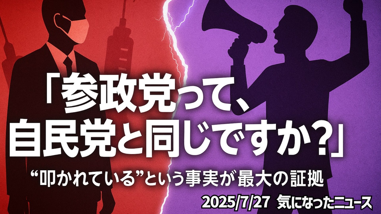 最後奥野さんの有料noteが出ますがまわし者でも宣伝でもないのであしからず┏○))<br><br>奥野さんオリジナルはもっと濃ゆいのでぜひご覧ください(X(旧Twitter))<br>⬇⬇⬇<br>◆奥野卓志さん『参政党を信用して良いのですか?自民党と同じじゃないのですか?と質問されます』<a href="https://x.com/GobonotoJP/status/1948583799010590897?t=-1wHU9FQvrFtvRCY9xFMAA&s=19" target="_blank" rel="noopener nofollow">https://x.com/GobonotoJP/status/1948583799010590897?t=-1wHU9FQvrFtvRCY9xFMAA&s=19</a><br><br>◆今回の台本<a href="https://keiichiro8140.hatenablog.com/entry/202507277773333" target="_blank" rel="noopener nofollow">https://keiichiro8140.hatenablog.com/entry/202507277773333</a><br><br>◆チャンネル登録よろしくお願いします<a href="https://youtube.com/@k16_888?si=1S8pLN1Tf9bGiJyV" target="_blank" rel="noopener nofollow">https://youtube.com/@k16_888?si=1S8pLN1Tf9bGiJyV</a><br><br>◆もしも(BAN)の時のためのマイリンク集<a href="https://lit.link/K16_888" target="_blank" rel="noopener nofollow">https://lit.link/K16_888</a><br><br>気になったニュース 2025/7/27<br><br><br />著作権、肖像権に配慮して作成しております。<br><br>◆気になったニュースの台本!?<br>メモ代わりに作った台本をそのままあげてます<br><a href="https://keiichiro8140.hatenablog.com/." target="_blank" rel="noopener nofollow">https://keiichiro8140.hatenablog.com/.</a><br><br><br>ここからはシリーズ紹介<br><br><br>◆ ワクチン解毒・デトックス<br><a href="https://x.gd/fZweg" target="_blank" rel="noopener nofollow">https://x.gd/fZweg</a><br><br>◆ウイリアム・マキス博士のがん治療(イベルメクチン・フェンベンダゾール等)<br><a href="https://x.gd/AtFYS" target="_blank" rel="noopener nofollow">https://x.gd/AtFYS</a><br><br>◆予防接種健康被害救済制度<br><a href="https://x.gd/0xK9x" target="_blank" rel="noopener nofollow">https://x.gd/0xK9x</a><br><br>◆気になったニュース #1501~<br><br>◆ 【ショートver】気になったニュース<br><a href="https://x.gd/7MxXC" target="_blank" rel="noopener nofollow">https://x.gd/7MxXC</a><br><br>◆ 気になったニュース #1001~<br><a href="https://x.gd/Lp8gv" target="_blank" rel="noopener nofollow">https://x.gd/Lp8gv</a><br><br>◆ 気になったニュース #501~<br><a href="https://x.gd/EmbS4" target="_blank" rel="noopener nofollow">https://x.gd/EmbS4</a><br><br>◆ 気になったニュース #1~#500<br><a href="https://x.gd/uPhNb" target="_blank" rel="noopener nofollow">https://x.gd/uPhNb</a><br><br>◆ X(旧Twitter)・テレグラムで気になった情報<br><a href="https://x.gd/YG6FT" target="_blank" rel="noopener nofollow">https://x.gd/YG6FT</a><br><br>◆ 日比谷5万人パレードデ⚪生放送アーカイブ動画<br><a href="https://x.gd/3CHJv" target="_blank" rel="noopener nofollow">https://x.gd/3CHJv</a><br><br>◆日比谷5万人パレード⚪モのマイリスト作ってみました<br><a href="https://nico.ms/mylist/76828848?ref=sp_other" target="_blank" rel="noopener nofollow">https://nico.ms/mylist/76828848?ref=sp_other</a><br><br>◆3.30 令和の百姓⚪⚪<br><a href="https://www.nicovideo.jp/series/511791?ref=garage_share_other" target="_blank" rel="noopener nofollow">https://www.nicovideo.jp/series/511791?ref=garage_share_other</a><br><br>◆ 及川幸久さんの【XNEWS】シリーズ<br><a href="https://x.gd/3k78K" target="_blank" rel="noopener nofollow">https://x.gd/3k78K</a><br><br>◆これまでの動画<a href="https://x.gd/sPXoJ" target="_blank" rel="noopener nofollow">https://x.gd/sPXoJ</a><br><br>◆もしも(BAN)の時のためのマイリンク集<a href="https://lit.link/K-16_News44" target="_blank" rel="noopener nofollow">https://lit.link/K-16_News44</a><br><br>