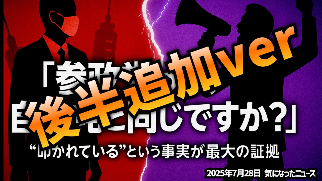 [<a href="#" class="seekTime" data-seekTime="2:39" onclick="seekNicoPlayer('#2:39'); return false;">#2:39</a>]<br><br>参政党は自民党と同じですか?の続きです<br> <br>前回の台本にも追加しましたが個別にしました。<br> <br>この作業のおかげで新しい動画投稿スタイル編み出せました<br> <br>長時間作業で速報系に弱かったのが緩和されそ<br>需要があるかは別として<br><br><br>奥野さんオリジナルはもっと濃ゆいのでぜひご覧ください(X(旧Twitter))<br>⬇⬇⬇<br>◆奥野卓志さん『参政党を信用して良いのですか?自民党と同じじゃないのですか?と質問されます』<a href="https://x.com/GobonotoJP/status/1948583799010590897?t=-1wHU9FQvrFtvRCY9xFMAA&s=19" target="_blank" rel="noopener nofollow">https://x.com/GobonotoJP/status/1948583799010590897?t=-1wHU9FQvrFtvRCY9xFMAA&s=19</a><br><br>◆今回の台本<a href="https://keiichiro8140.hatenablog.com/entry/20250728888222" target="_blank" rel="noopener nofollow">https://keiichiro8140.hatenablog.com/entry/20250728888222</a><br> <br>◆YouTubeでも投稿中!チャンネル登録よろしくお願いします<a href="https://x.gd/lTY7q" target="_blank" rel="noopener nofollow">https://x.gd/lTY7q</a><br> <br>◆もしも(BAN)の時のためのマイリンク集<a href="https://lit.link/K16_888" target="_blank" rel="noopener nofollow">https://lit.link/K16_888</a><br> <br>気になったニュース 2025/7/28<br><br />著作権、肖像権に配慮して作成しております。<br><br>◆気になったニュースの台本!?<br>メモ代わりに作った台本をそのままあげてます<br><a href="https://keiichiro8140.hatenablog.com/." target="_blank" rel="noopener nofollow">https://keiichiro8140.hatenablog.com/.</a><br><br><br>ここからはシリーズ紹介<br><br><br>◆ ワクチン解毒・デトックス<br><a href="https://x.gd/fZweg" target="_blank" rel="noopener nofollow">https://x.gd/fZweg</a><br><br>◆ウイリアム・マキス博士のがん治療(イベルメクチン・フェンベンダゾール等)<br><a href="https://x.gd/AtFYS" target="_blank" rel="noopener nofollow">https://x.gd/AtFYS</a><br><br>◆予防接種健康被害救済制度<br><a href="https://x.gd/0xK9x" target="_blank" rel="noopener nofollow">https://x.gd/0xK9x</a><br><br>◆気になったニュース #1501~<br><br>◆ 【ショートver】気になったニュース<br><a href="https://x.gd/7MxXC" target="_blank" rel="noopener nofollow">https://x.gd/7MxXC</a><br><br>◆ 気になったニュース #1001~<br><a href="https://x.gd/Lp8gv" target="_blank" rel="noopener nofollow">https://x.gd/Lp8gv</a><br><br>◆ 気になったニュース #501~<br><a href="https://x.gd/EmbS4" target="_blank" rel="noopener nofollow">https://x.gd/EmbS4</a><br><br>◆ 気になったニュース #1~#500<br><a href="https://x.gd/uPhNb" target="_blank" rel="noopener nofollow">https://x.gd/uPhNb</a><br><br>◆ X(旧Twitter)・テレグラムで気になった情報<br><a href="https://x.gd/YG6FT" target="_blank" rel="noopener nofollow">https://x.gd/YG6FT</a><br><br>◆ 日比谷5万人パレードデ⚪生放送アーカイブ動画<br><a href="https://x.gd/3CHJv" target="_blank" rel="noopener nofollow">https://x.gd/3CHJv</a><br><br>◆日比谷5万人パレード⚪モのマイリスト作ってみました<br><a href="https://nico.ms/mylist/76828848?ref=sp_other" target="_blank" rel="noopener nofollow">https://nico.ms/mylist/76828848?ref=sp_other</a><br><br>◆3.30 令和の百姓⚪⚪<br><a href="https://www.nicovideo.jp/series/511791?ref=garage_share_other" target="_blank" rel="noopener nofollow">https://www.nicovideo.jp/series/511791?ref=garage_share_other</a><br><br>◆ 及川幸久さんの【XNEWS】シリーズ<br><a href="https://x.gd/3k78K" target="_blank" rel="noopener nofollow">https://x.gd/3k78K</a><br><br>◆これまでの動画<a href="https://x.gd/sPXoJ" target="_blank" rel="noopener nofollow">https://x.gd/sPXoJ</a><br><br>◆もしも(BAN)の時のためのマイリンク集<a href="https://lit.link/K-16_News44" target="_blank" rel="noopener nofollow">https://lit.link/K-16_News44</a><br><br>