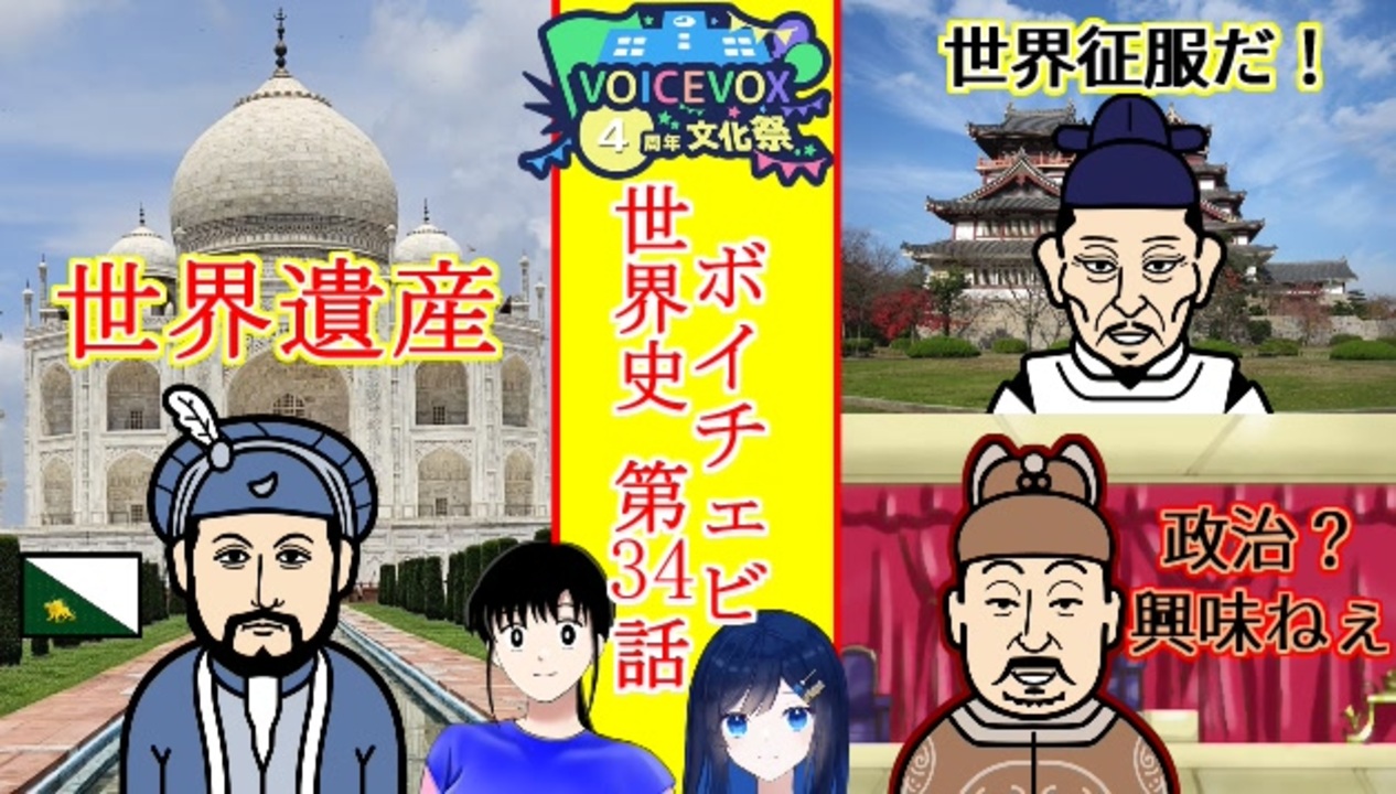 日テレ系「まんが日本史」をオマージュし、<br>学習漫画「世界の歴史」を教科書とした<br>ボイチェビ世界史 第34話は、<br>中華王朝・明王朝と、インドのムガル帝国です。<br>また、豊臣秀吉公の、朝鮮出兵も取り扱います。<br><br>「歴史学者・ことりさん」が、<br>no.7(voicevox)の声でご案内いたします。<br>そしてアシスタントに双葉湊音ちゃんを起用。<br><br>EDテーマ「風のメルヘン」は、<br>春日部つむぎ(voicevox)が歌います。<br><br>注意点<br><span style="font-size: 16px;"><strong>・【重要!】この動画は、UP主の主観で作成されているため、<br>一般的な解釈とは齟齬が発生する場合があります。</strong></span><br>・セリフおよび画像は、その一部は教科書など参考文献から<br>引用させていただくことがあります。<br>・演出のために、舞台の時代にそぐわない画像や<br>音楽を使う場合がございます。<br>・セリフ発声はすべて合成音声<br>・BGMは、ファイナルファンタジー等の、他者作成のBGMや音楽を借ります。<br>・若干の表記ゆれはご容赦ください。<br>・親作品は動画最後のスタッフロール画面に掲載します。<br><br>1:05 第1章 明王朝の北京遷都<br><a href="https://www.nicovideo.jp/watch/sm45241320?from=65" target="_blank" rel="noopener nofollow">https://www.nicovideo.jp/watch/sm45241320?from=65</a><br><br>2:28 第2章 明王朝の発展と苦難<br><a href="https://www.nicovideo.jp/watch/sm45241320?from=148" target="_blank" rel="noopener nofollow">https://www.nicovideo.jp/watch/sm45241320?from=148</a><br><br>6:23 第3章 万暦帝と秀吉の唐入り(前編)<br><a href="https://www.nicovideo.jp/watch/sm45241320?from=383" target="_blank" rel="noopener nofollow">https://www.nicovideo.jp/watch/sm45241320?from=383</a><br><br>9:54 第4章 万暦帝と秀吉の唐入り(後編)<br><a href="https://www.nicovideo.jp/watch/sm45241320?from=594" target="_blank" rel="noopener nofollow">https://www.nicovideo.jp/watch/sm45241320?from=594</a><br><br>13:26 第5章 ムガル帝国とタージ・マハル<br><a href="https://www.nicovideo.jp/watch/sm45241320?from=806" target="_blank" rel="noopener nofollow">https://www.nicovideo.jp/watch/sm45241320?from=806</a><br><br>18:03 いきなり!本編終了(時事ネタあり)<br><a href="https://www.nicovideo.jp/watch/sm45241320?from=1083" target="_blank" rel="noopener nofollow">https://www.nicovideo.jp/watch/sm45241320?from=1083</a><br><br><a target="_blank" href="https://qa.nicovideo.jp/faq/show/19424?site_domain=default" style="font-size: 13px;color: #657586; text-decoration: underline; line-height: 1.4">この動画は投稿者によって修正されました</a>