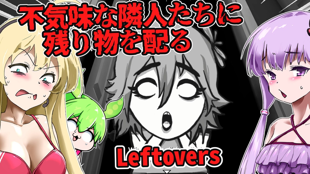 結月ゆかりさん、ずんだもん、弦巻マキちゃんが、海外のホラーゲームに挑むようです。<br><br>◎あらすじ◎<br>あなたの母親が夕食を作っている。<br>残り物の多さに悲しくなり、それを無駄にしたくないと、<br>彼女はあなたに、近所の人たちに全部配るよう命じたのだが…<br><br>※投稿者のガバ翻訳付きです。<br>配信ページ<br><a href="https://realmpact.itch.io/leftovers" target="_blank" rel="noopener nofollow">https://realmpact.itch.io/leftovers</a><br><br>VOICEVOX:ずんだもん<br><a href="https://voicevox.hiroshiba.jp/" target="_blank" rel="noopener nofollow">https://voicevox.hiroshiba.jp/</a><br><br>COEIROINK:思春期くん<br>COEIROINK:おふとんP<br>COEIROINK:クロワちゃん<br>COEIROINK:アンジーさん<br>COEIROINK:豪徳貞江<br>COEIROINK:松嘩りすく<br>COEIROINK:AI声優-青葉<br>COEIROINK:薗頭雅美<br>COEIROINK:幌呂めぐる<br>COEIROINK:AI声優-朱花<br><a href="https://coeiroink.com/" target="_blank" rel="noopener nofollow">https://coeiroink.com/</a><br><br>BGM、効果音をお借りしました。<br><a href="https://otologic.jp/" target="_blank" rel="noopener nofollow">https://otologic.jp/</a><br><a href="http://www.vita-chi.net/sozai1.htm" target="_blank" rel="noopener nofollow">http://www.vita-chi.net/sozai1.htm</a><br><br>立ち絵をお借りしました。<br><a href="https://seiga.nicovideo.jp/seiga/im10933652" target="_blank" rel="noopener nofollow">https://seiga.nicovideo.jp/seiga/im10933652</a><br><a href="https://seiga.nicovideo.jp/seiga/im11230837" target="_blank" rel="noopener nofollow">https://seiga.nicovideo.jp/seiga/im11230837</a><br><a href="https://seiga.nicovideo.jp/seiga/im11229020" target="_blank" rel="noopener nofollow">https://seiga.nicovideo.jp/seiga/im11229020</a><br><a href="https://seiga.nicovideo.jp/seiga/im4817713" target="_blank" rel="noopener nofollow">https://seiga.nicovideo.jp/seiga/im4817713</a>